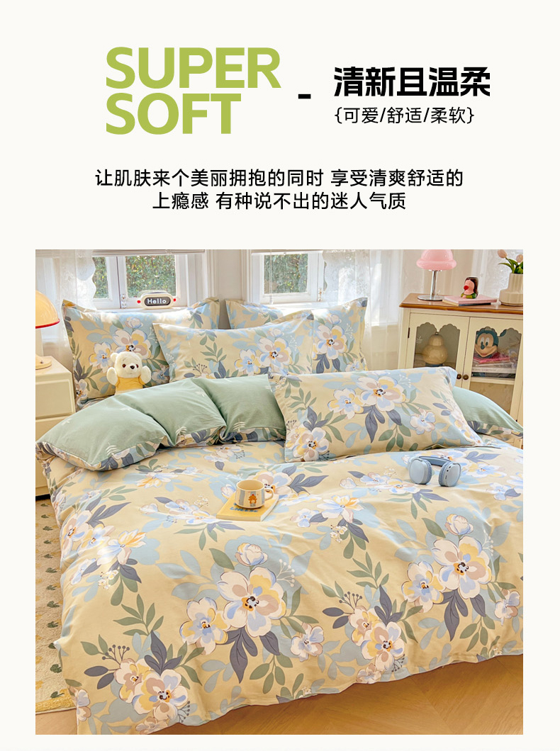 商品名称:世爵 2025新款全棉印花小清新套件系列-四件套 木棉花-绿