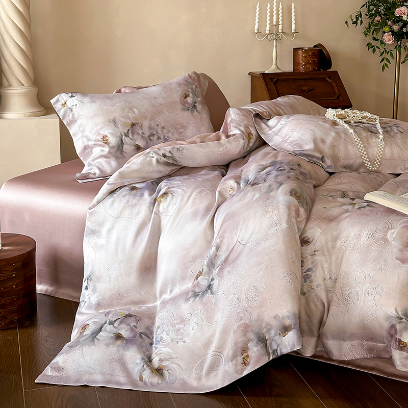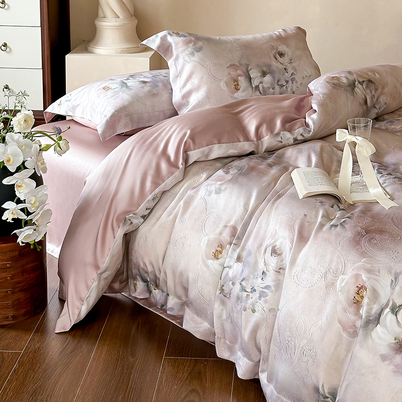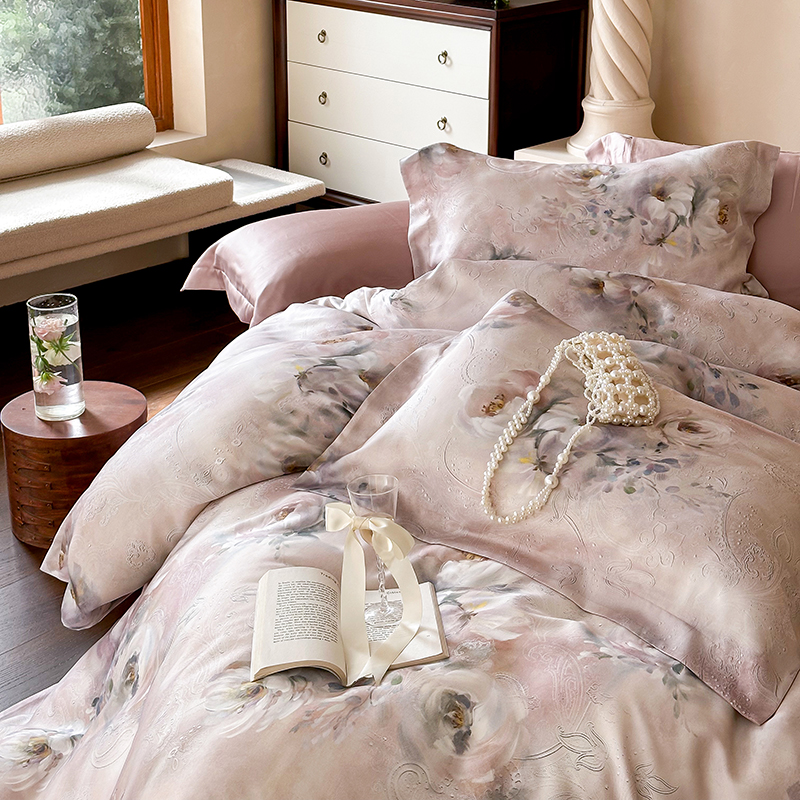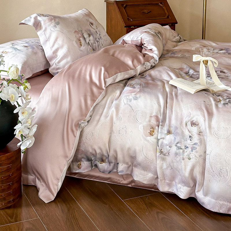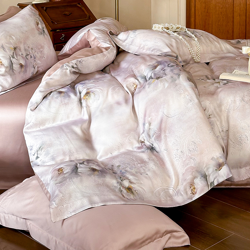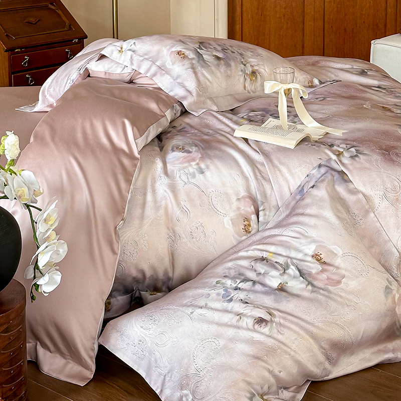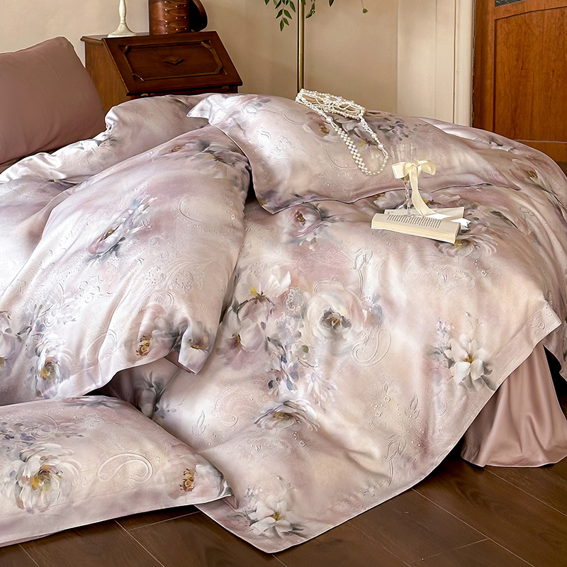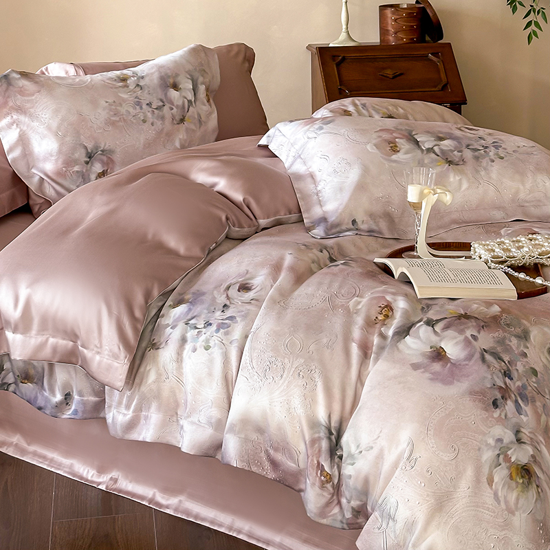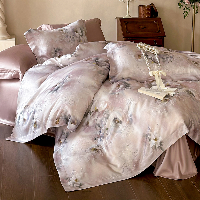 (总)2025春夏新品数码印花60兰精天丝宽边工艺款四件套,奥菲娜-粉,奥菲娜-灰,莫丽花园-灰,楠风-咖,倾城-豆沙,倾城-灰,莫丽花园-紫