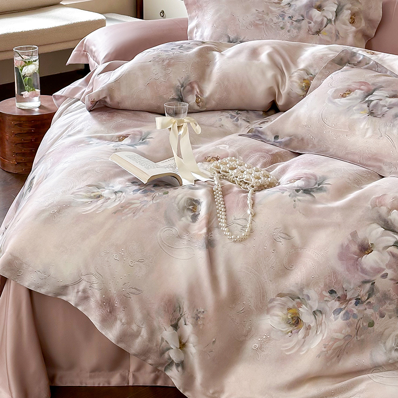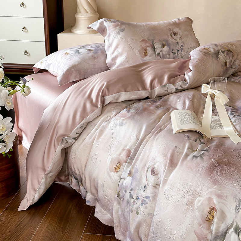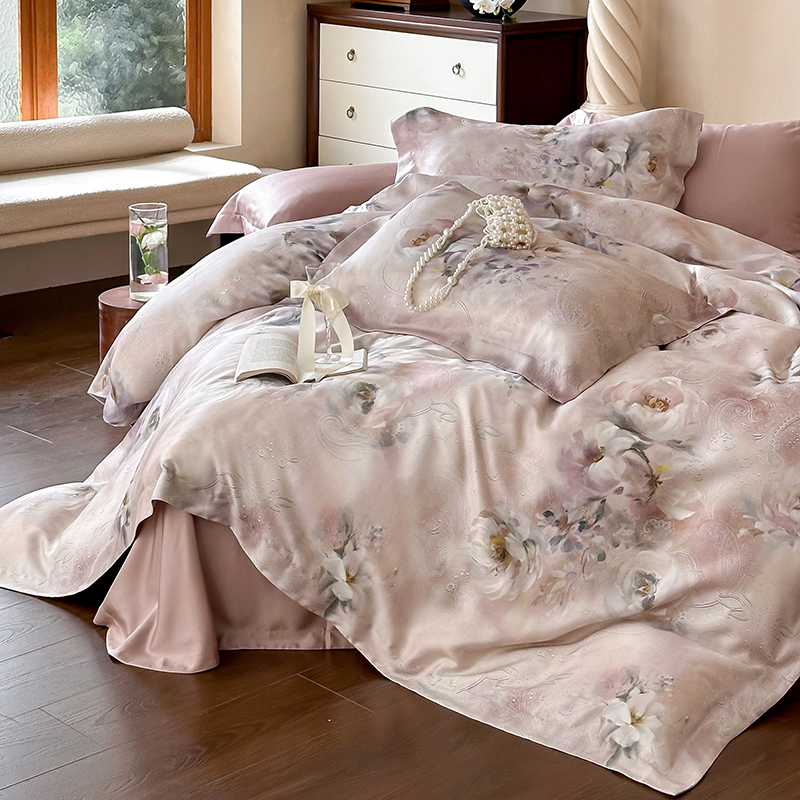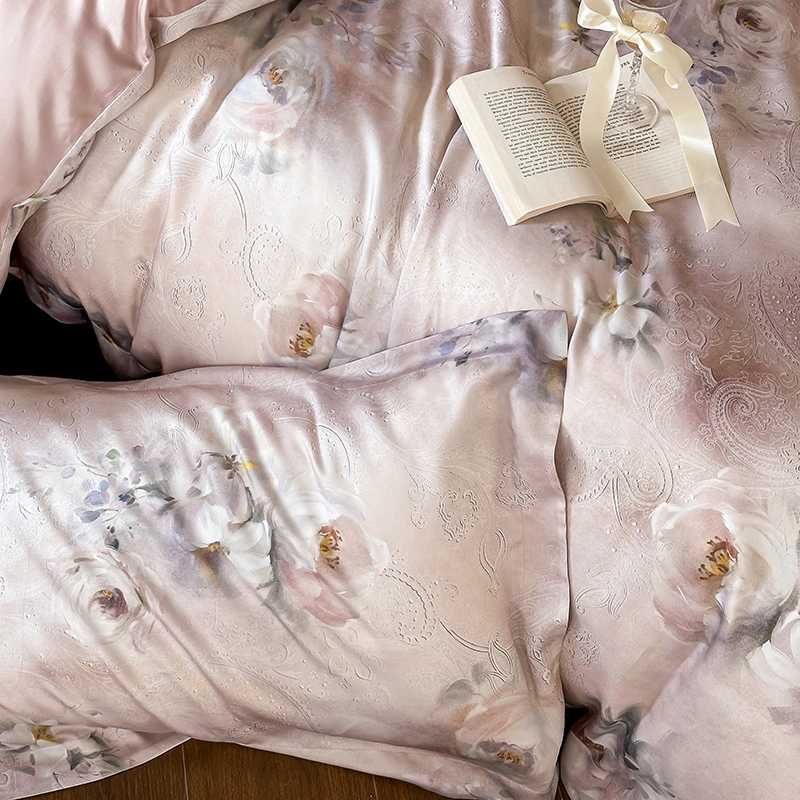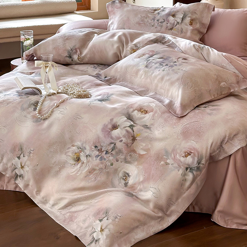 商品名称:2025春夏新品数码印花60兰精天丝宽边工艺款四件套 奥菲娜-粉