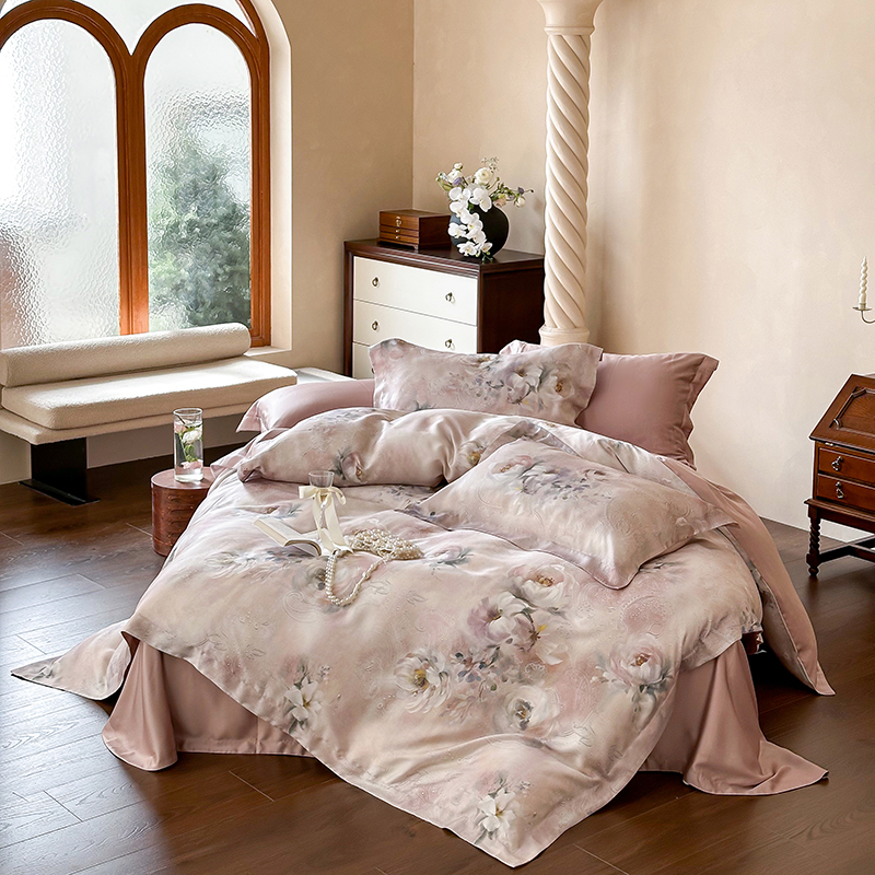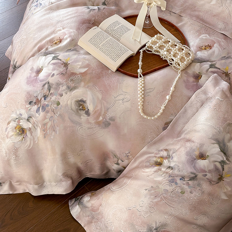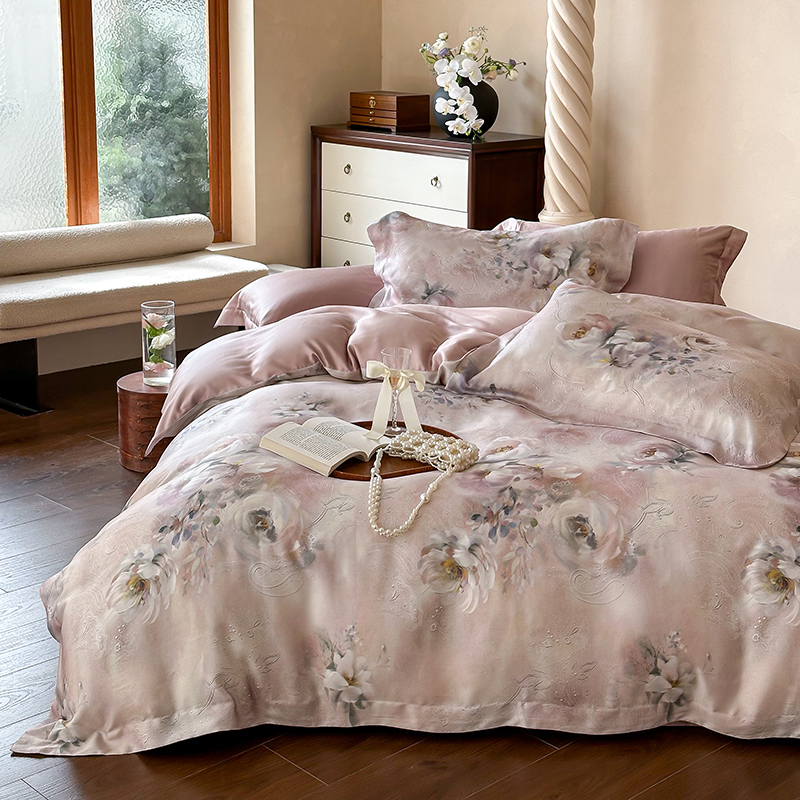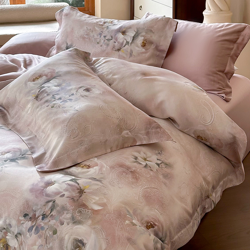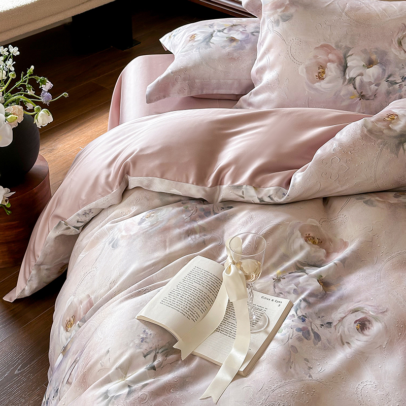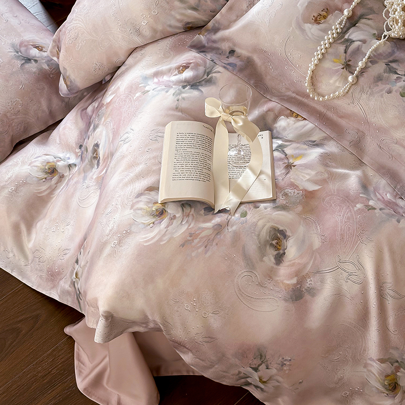 商品名称:2025春夏新品数码印花60兰精天丝宽边工艺款四件套 奥菲娜-粉