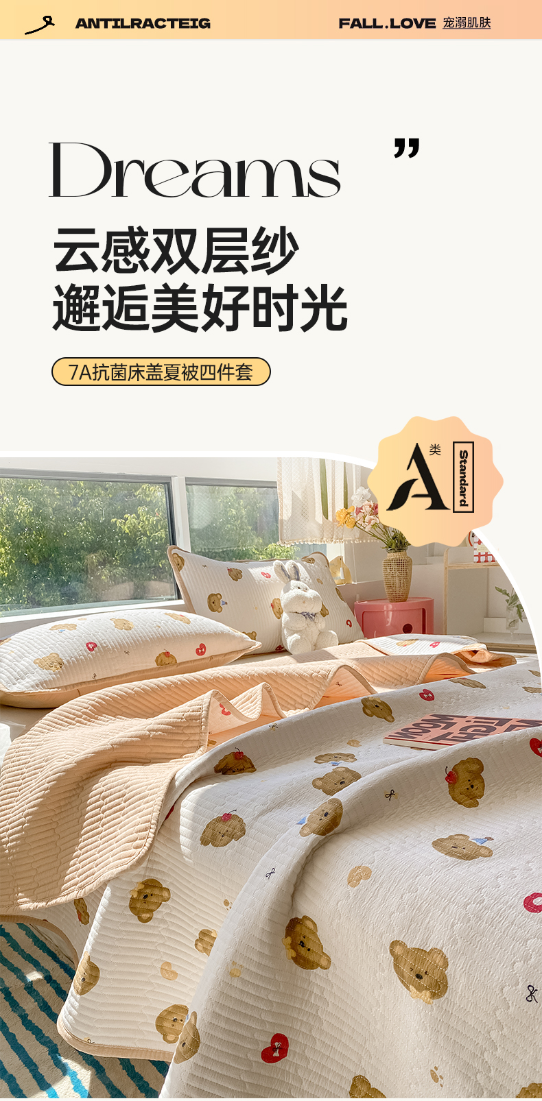 当前位置: 91家纺网 > 商品网购 > 床品套件 > 四件套 > 双层纱四件套 > 老帅的工厂店 2025新款a类云感双层纱7a抗菌夏被床盖四件套 织梦