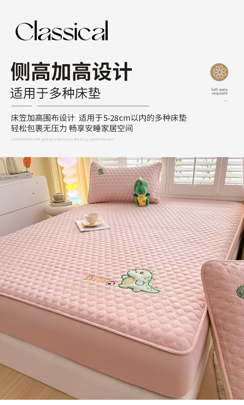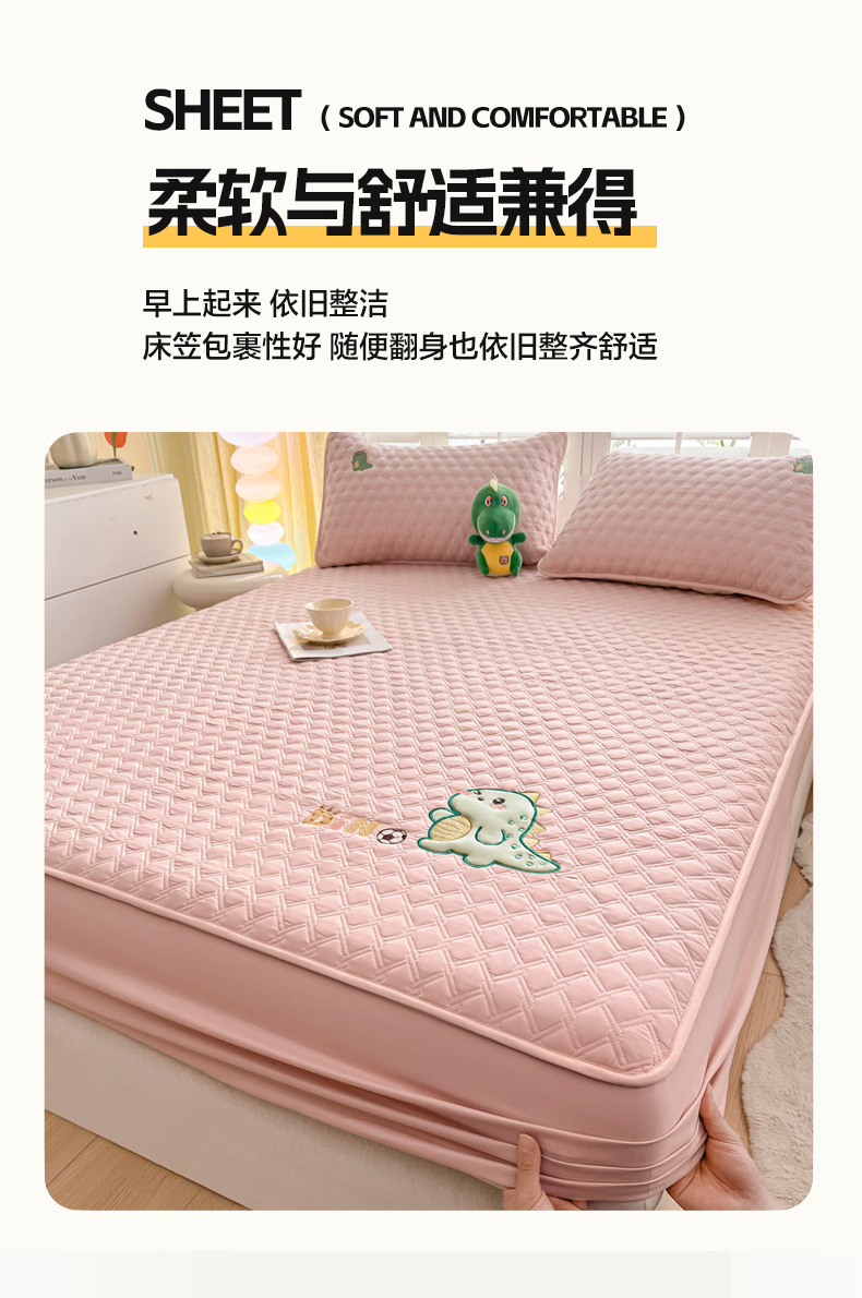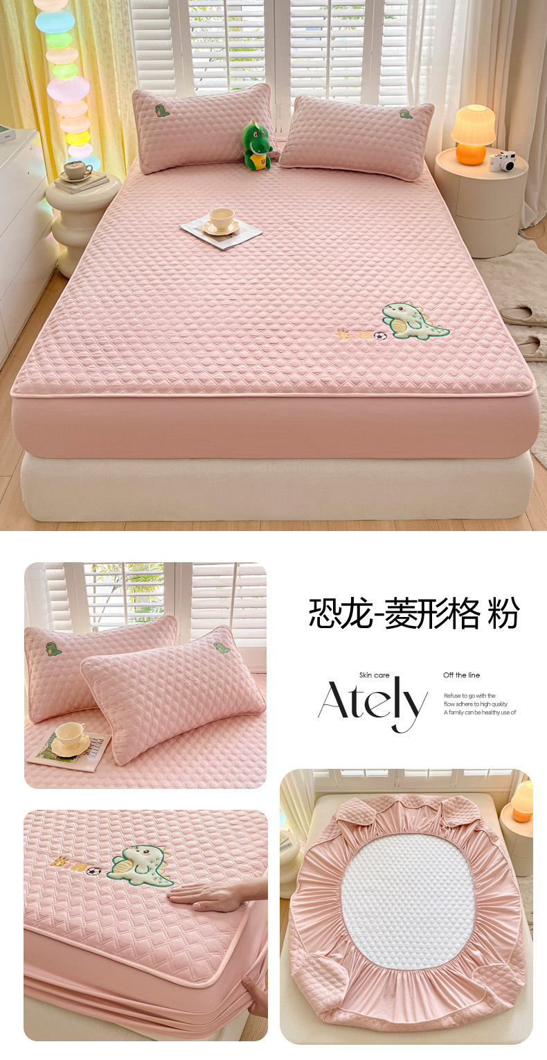 商品名称:万盛家纺 2025新款夹棉恐龙刺绣床笠 恐龙-菱形格 粉