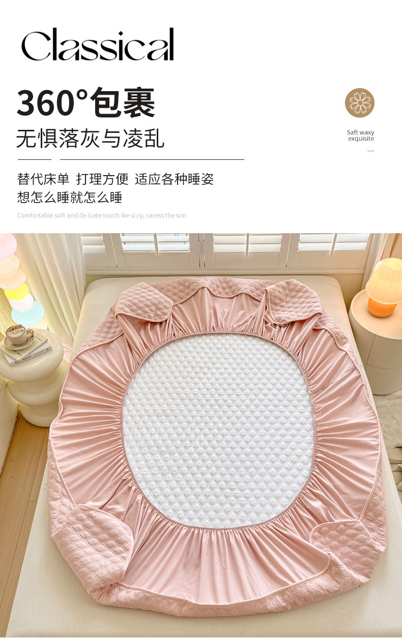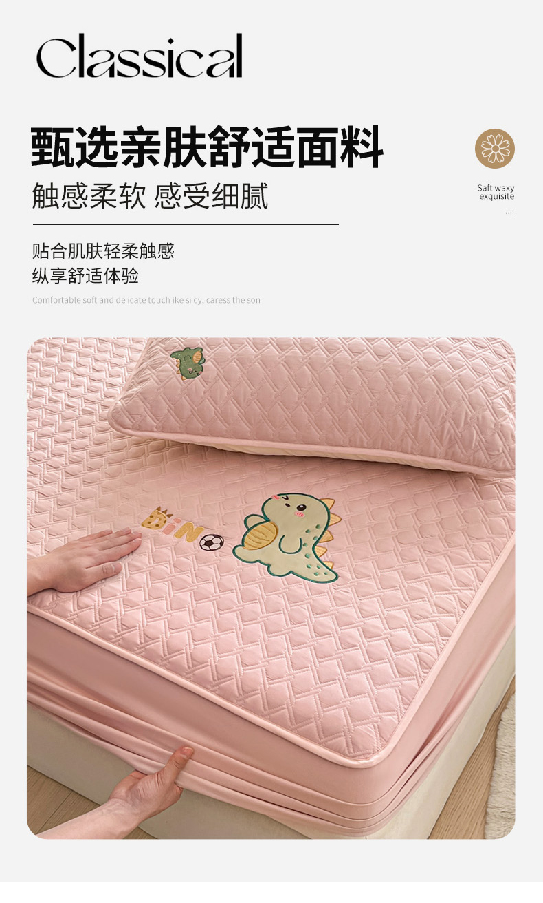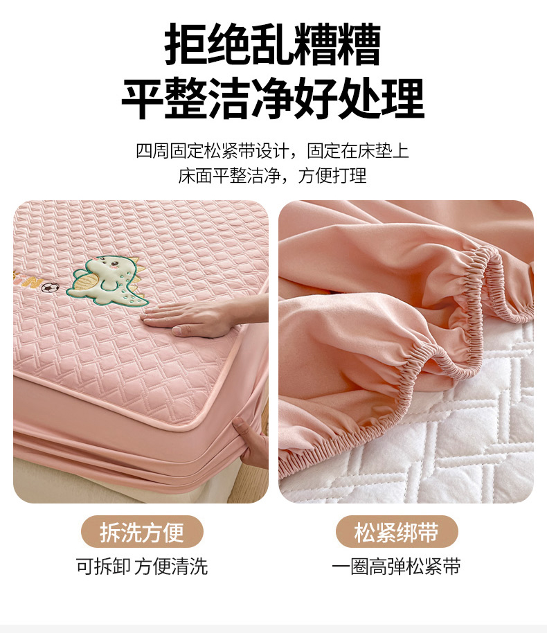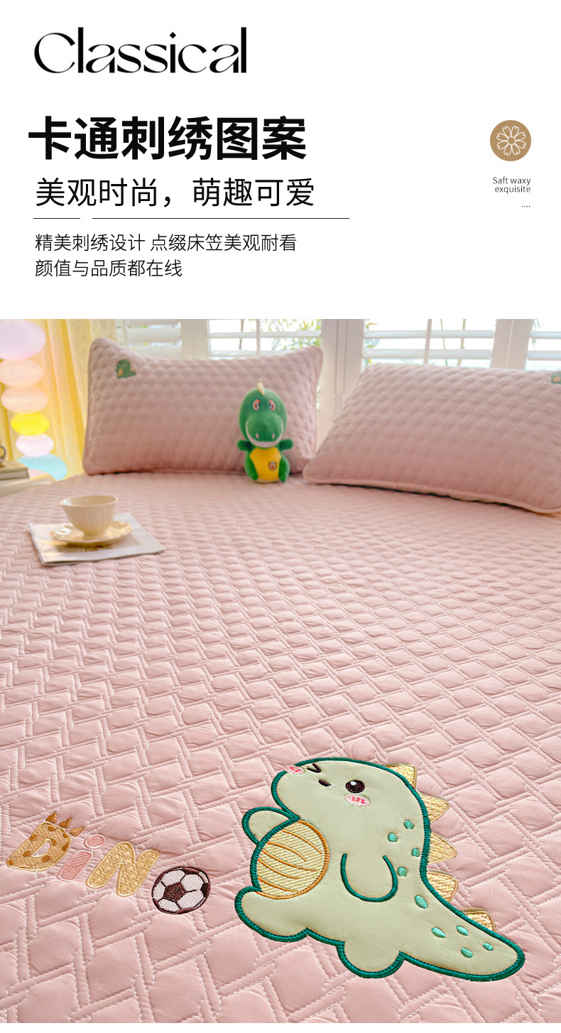 万盛家纺 2025新款夹棉恐龙刺绣床笠 恐龙-菱形格 粉