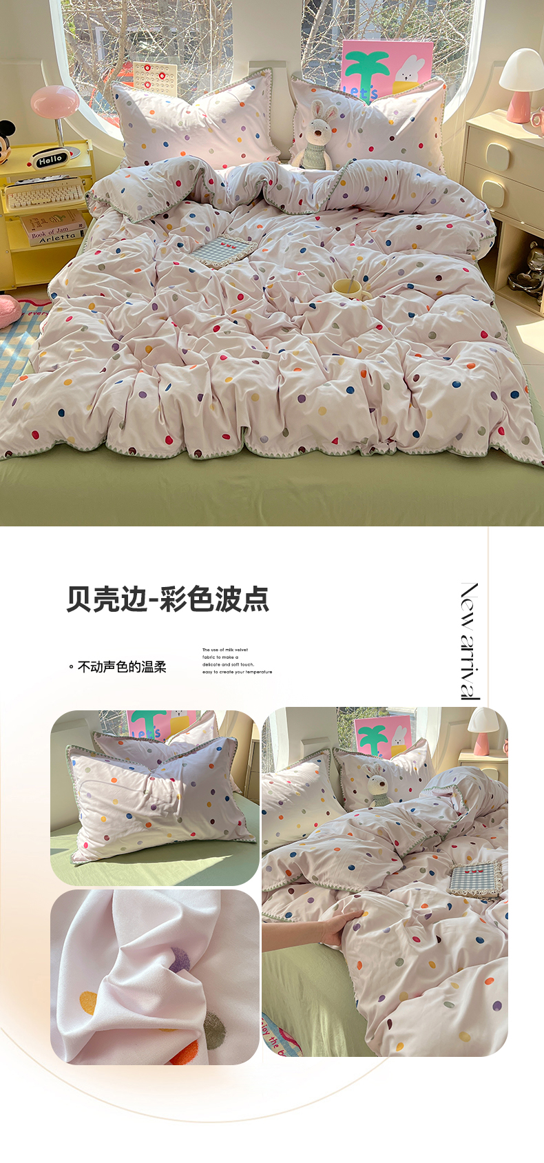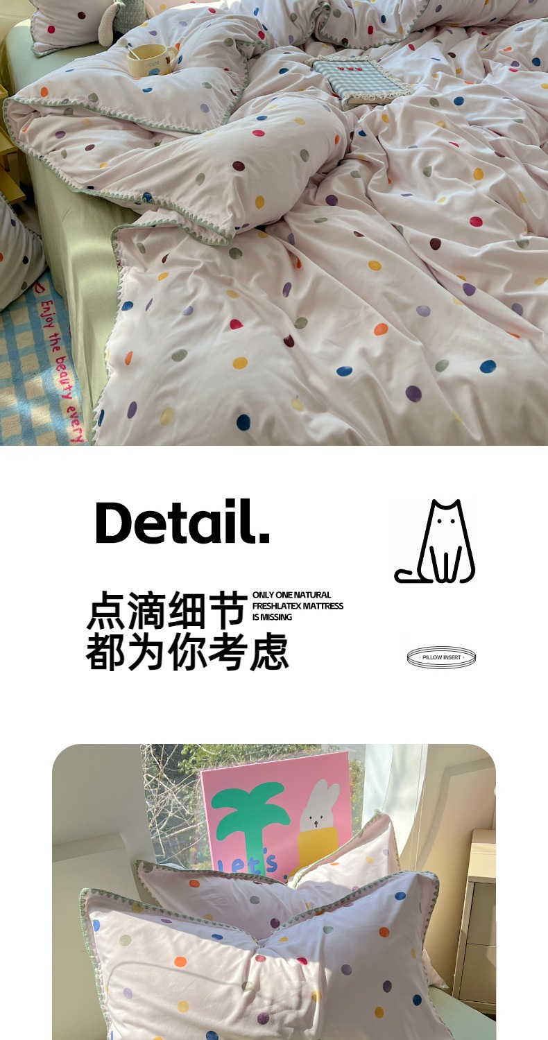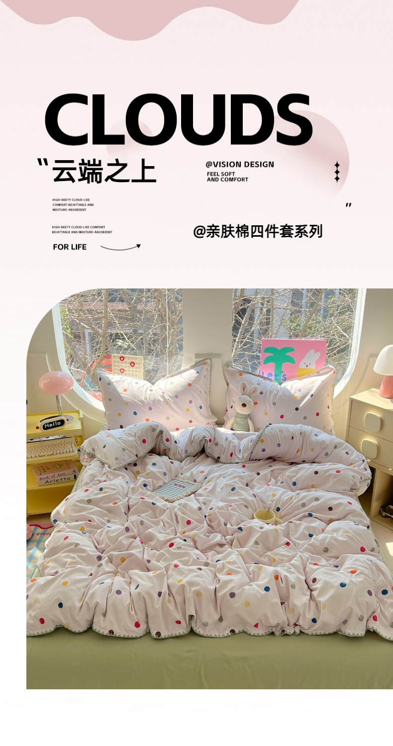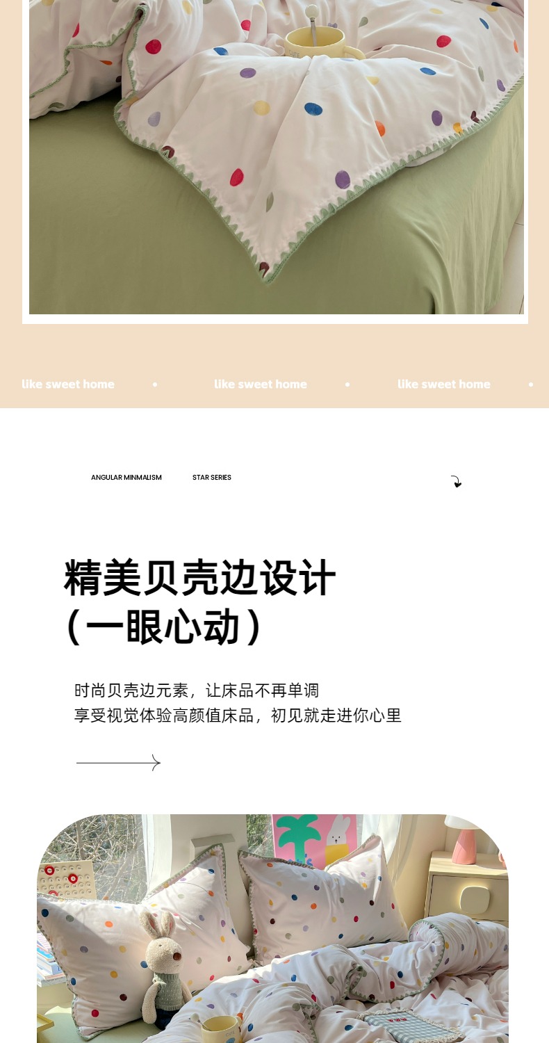当前位置: 91家纺网 > 商品网购 > 床品套件 > 四件套 > 其它四件套 > 思诺羽床笠 2025新款亲肤棉贝壳花边四件套 贝壳边-彩色波点