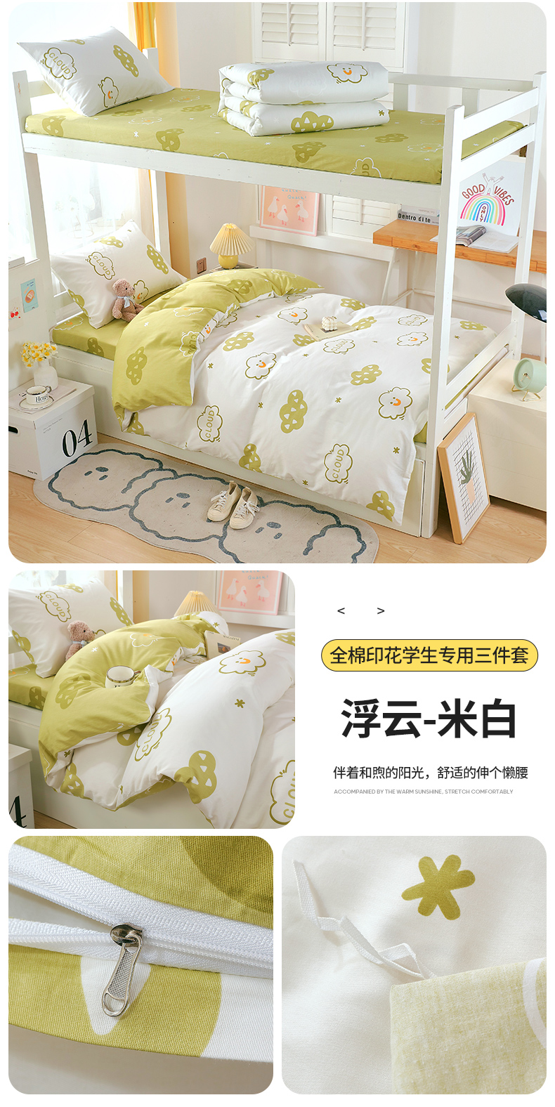 商品名称:悦织湾家纺 2025新款全棉印花13372学生三件套 A7浮云-米白