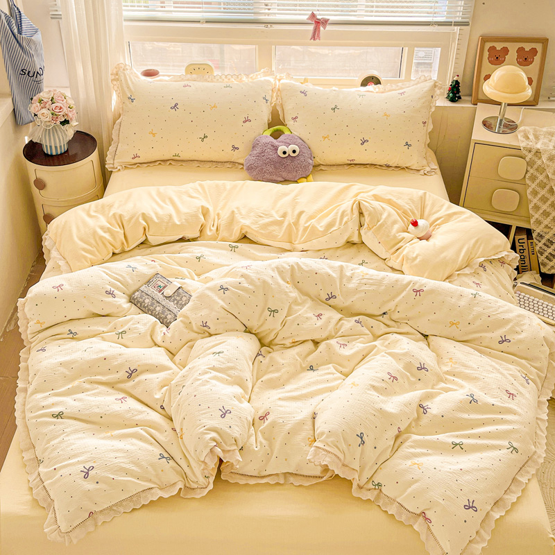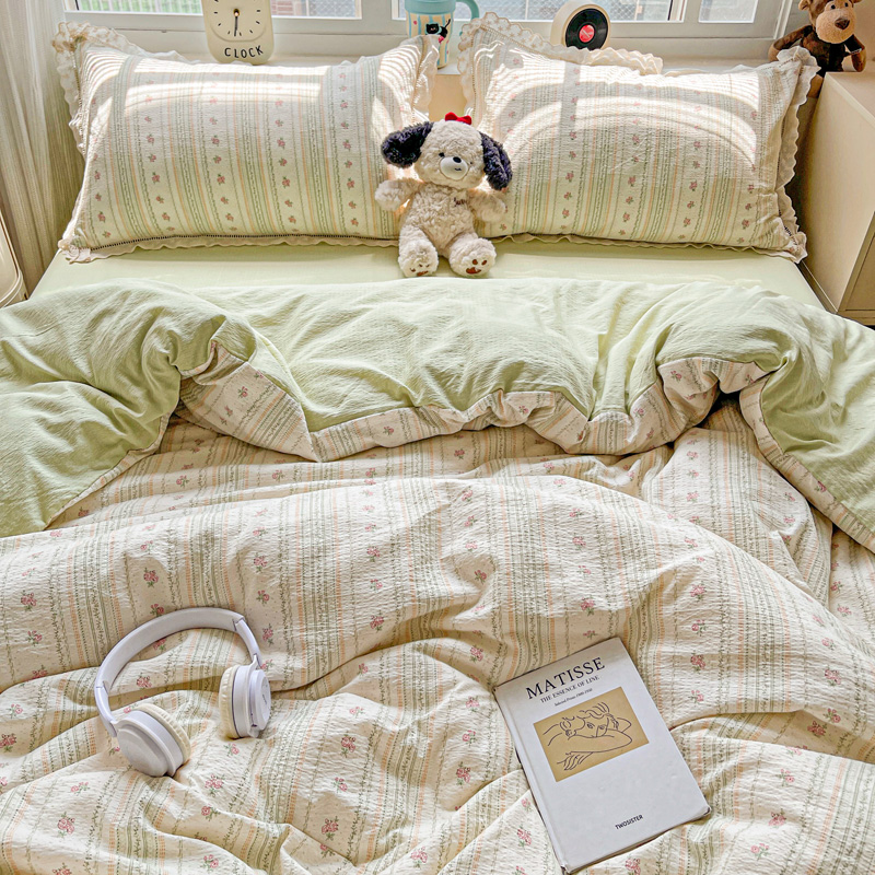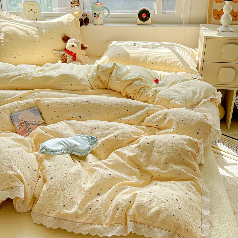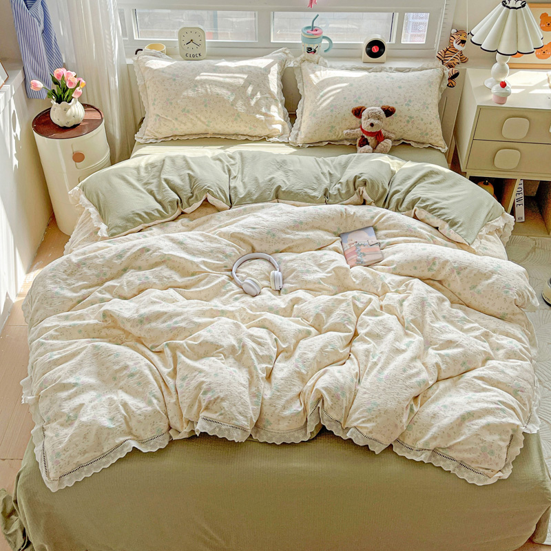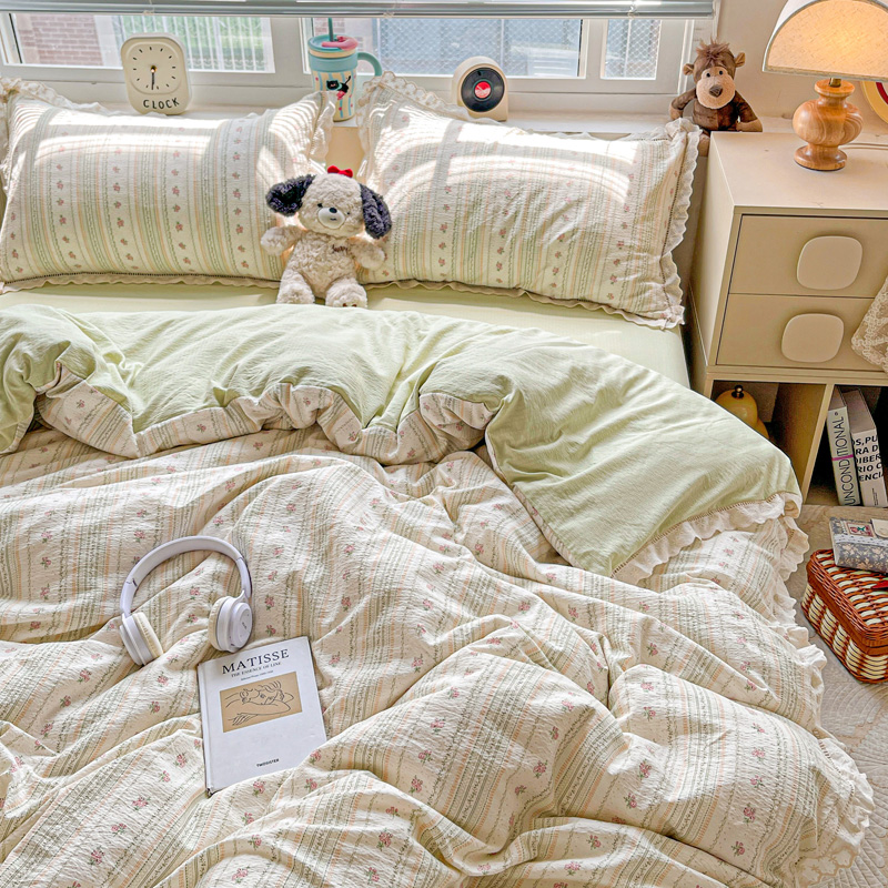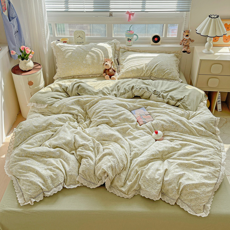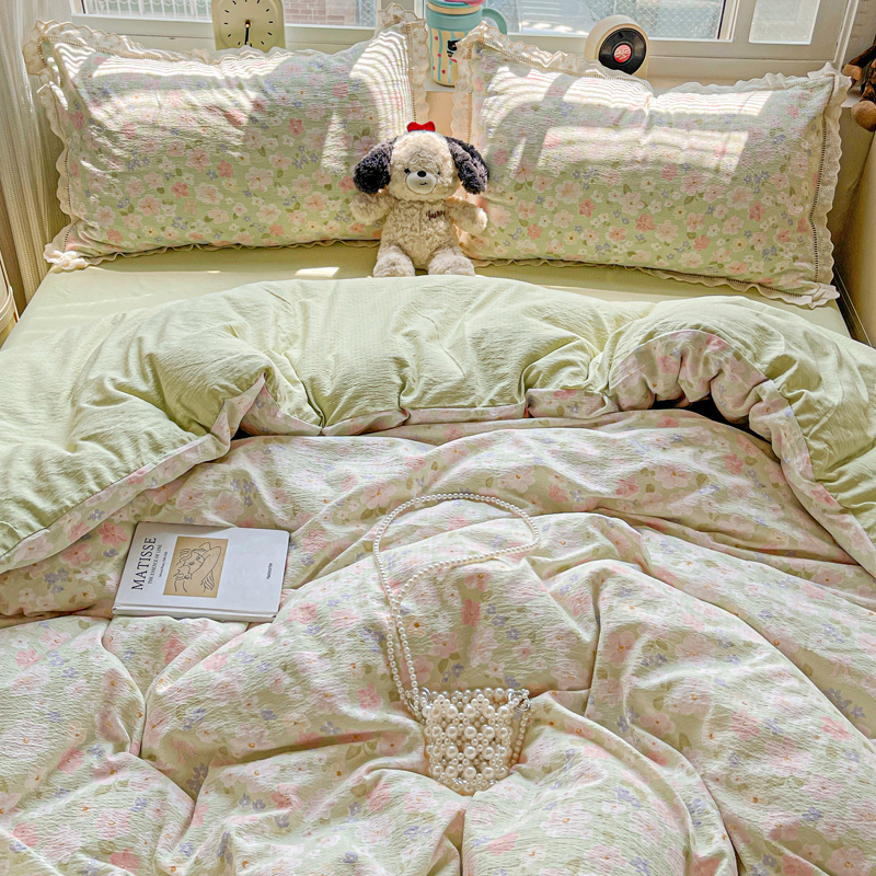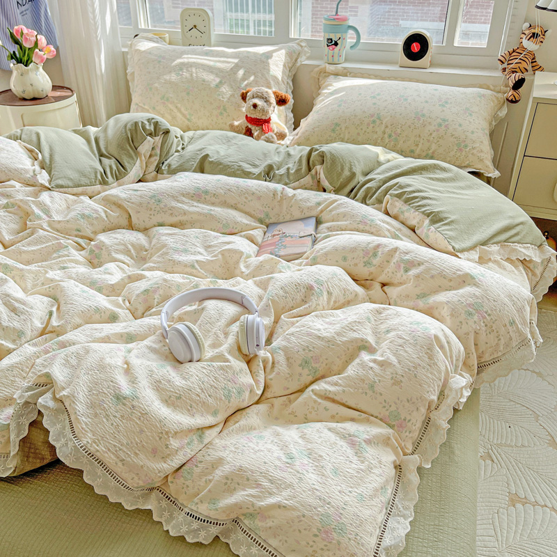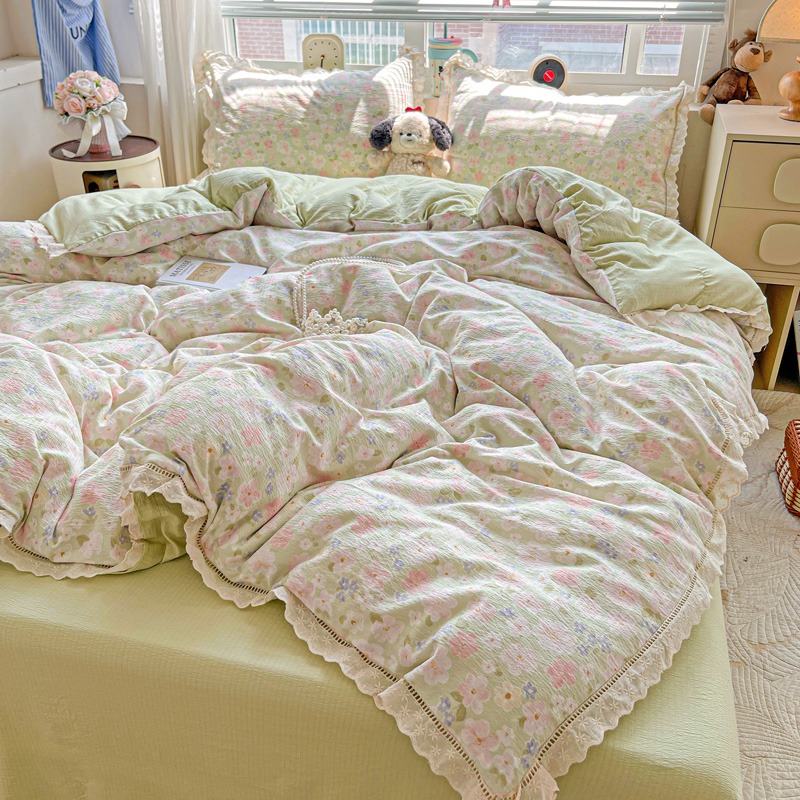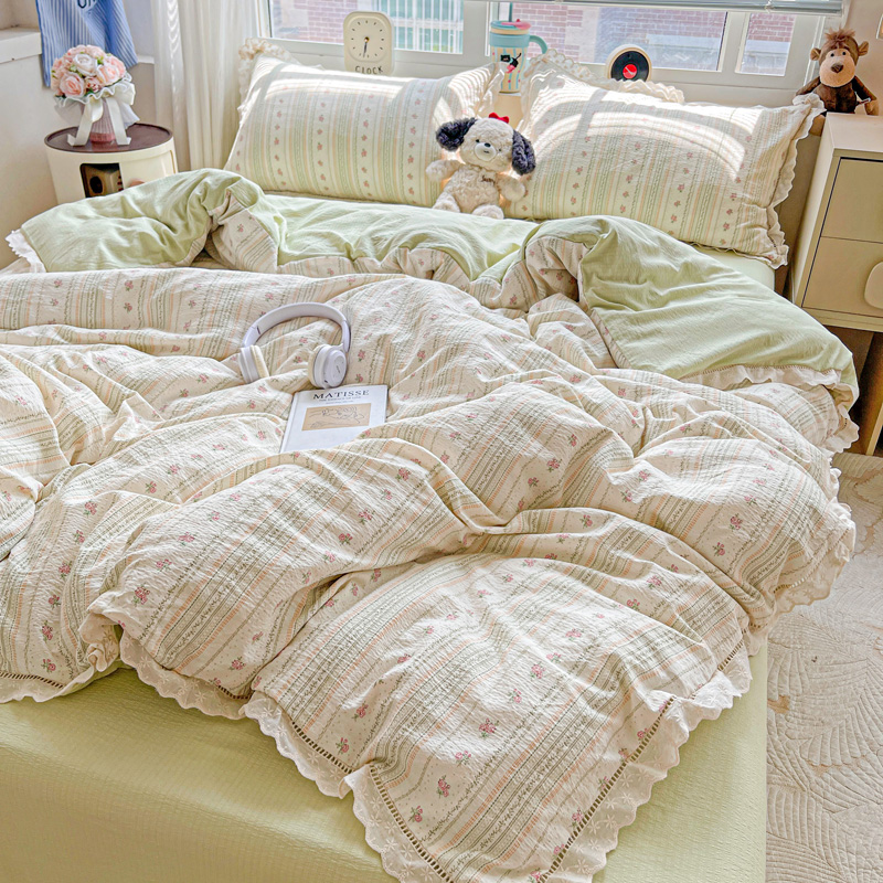 典曼家纺 2025新款云感皱皱双层纱花边四件套 薄荷微凉