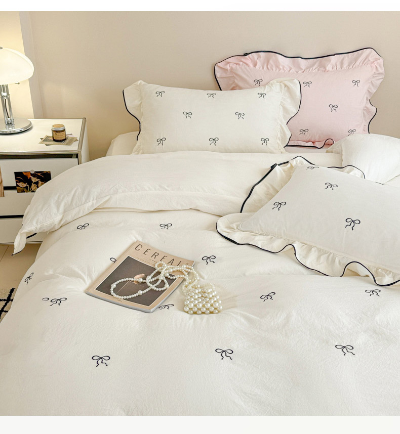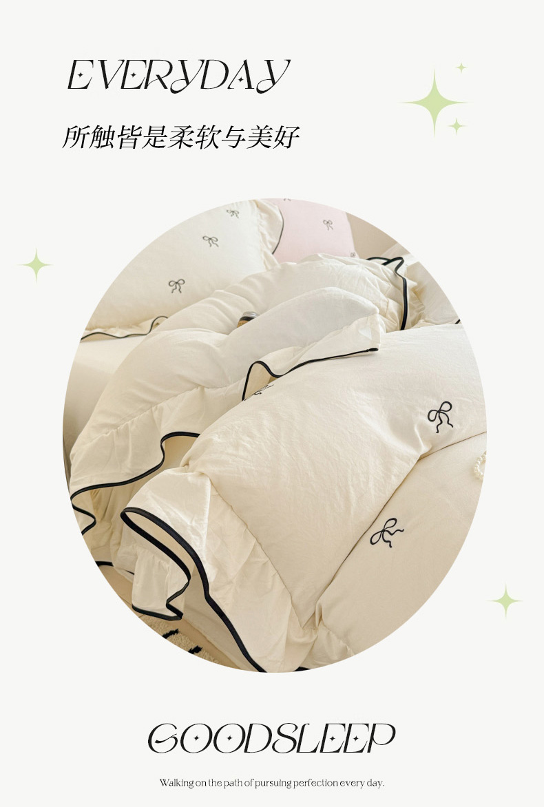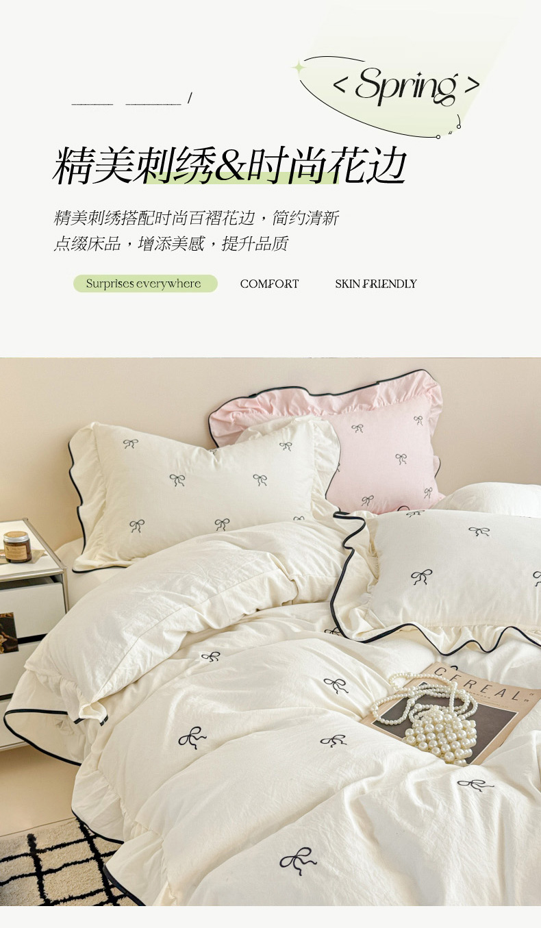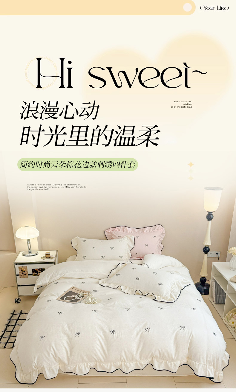 当前位置: 91家纺网 > 商品网购 > 床品套件 > 四件套 > 其它四件套 > 米可 2025新款云朵棉刺绣花边款四件套 心动-白