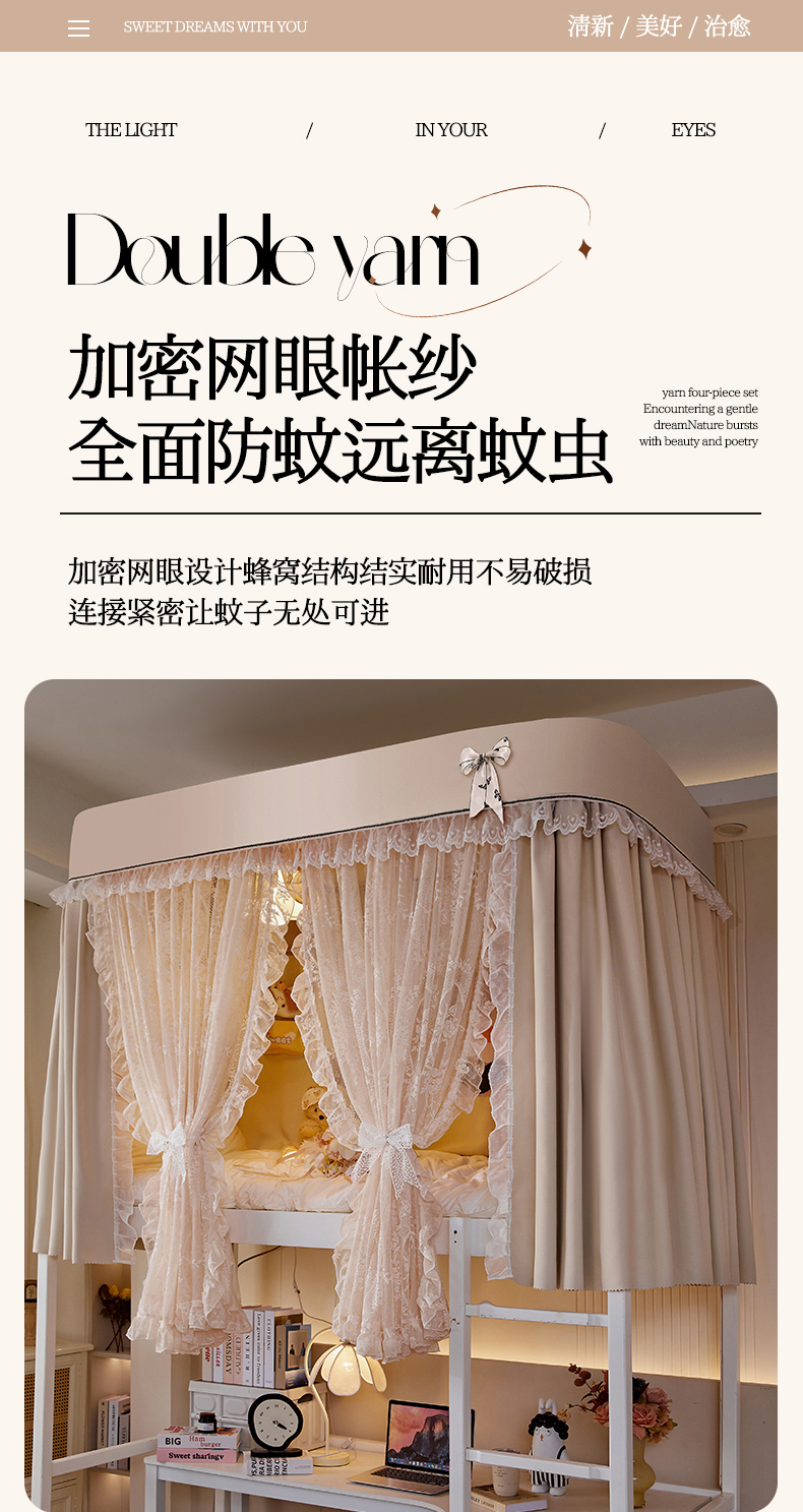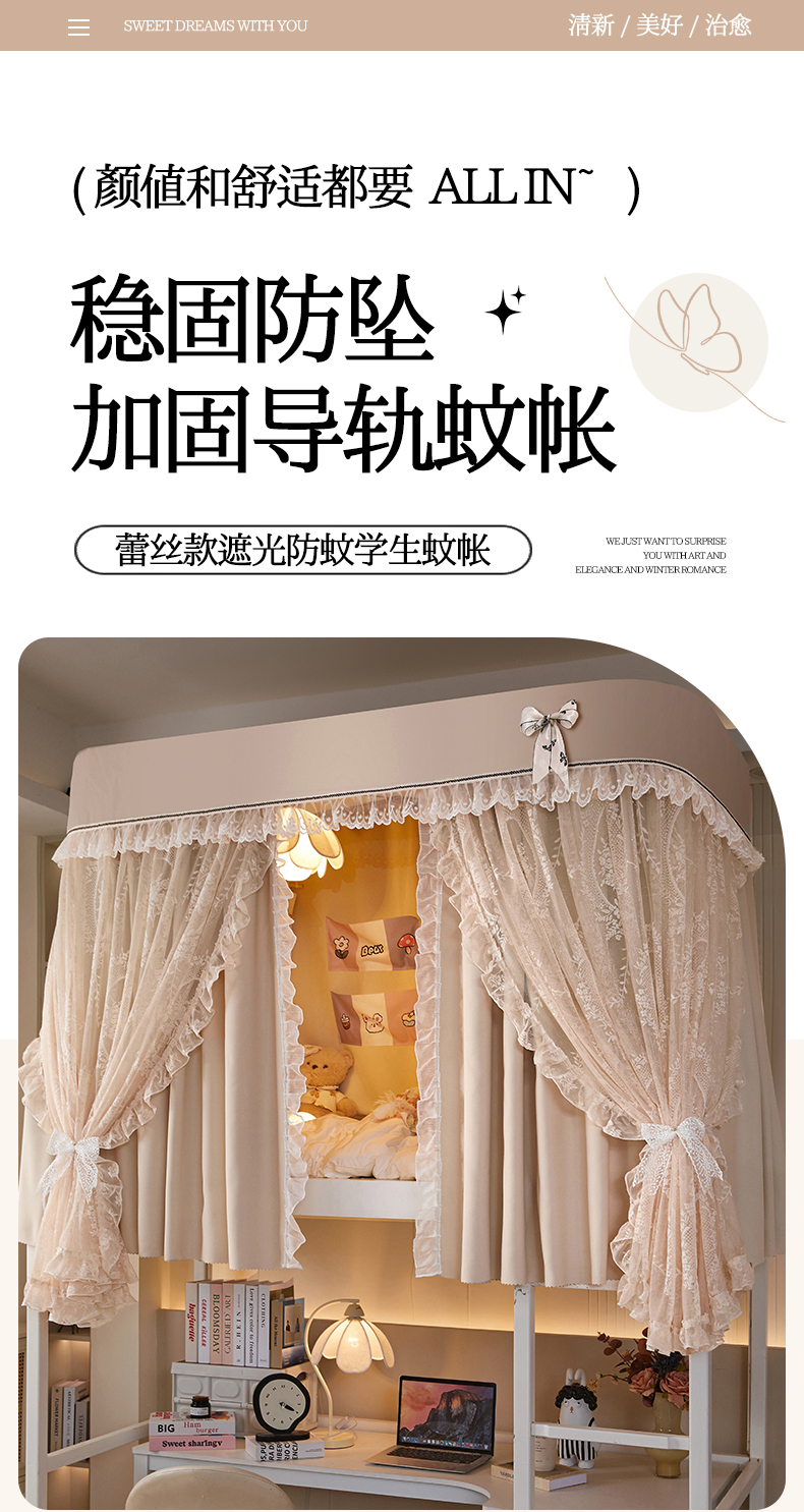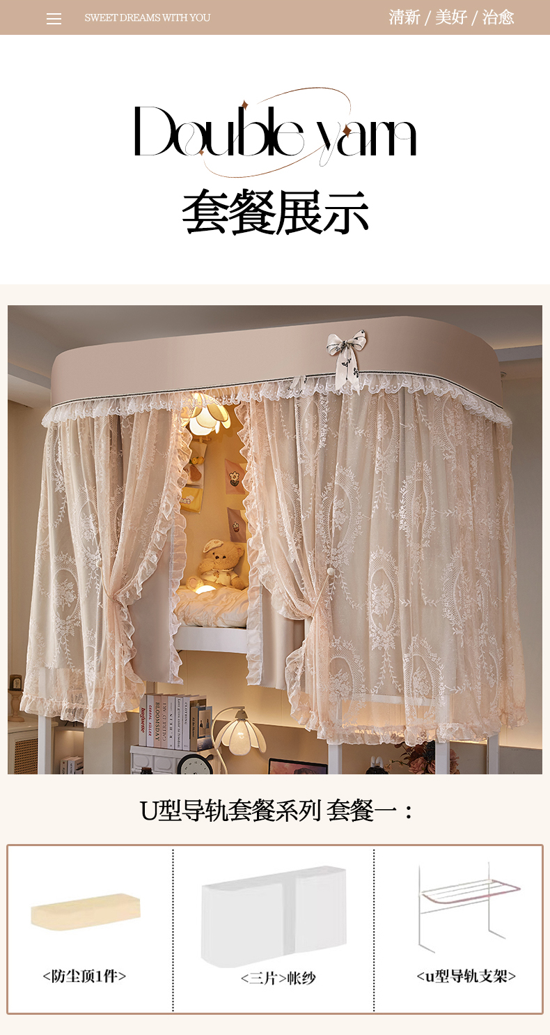 当前位置: 91家纺网 > 商品网购 > 床上用品 > 蚊帐 > 学生蚊帐 > 夏彩 2025新款学生新款雪纺蕾丝强遮光可升降U型轨道蚊帐 悦色