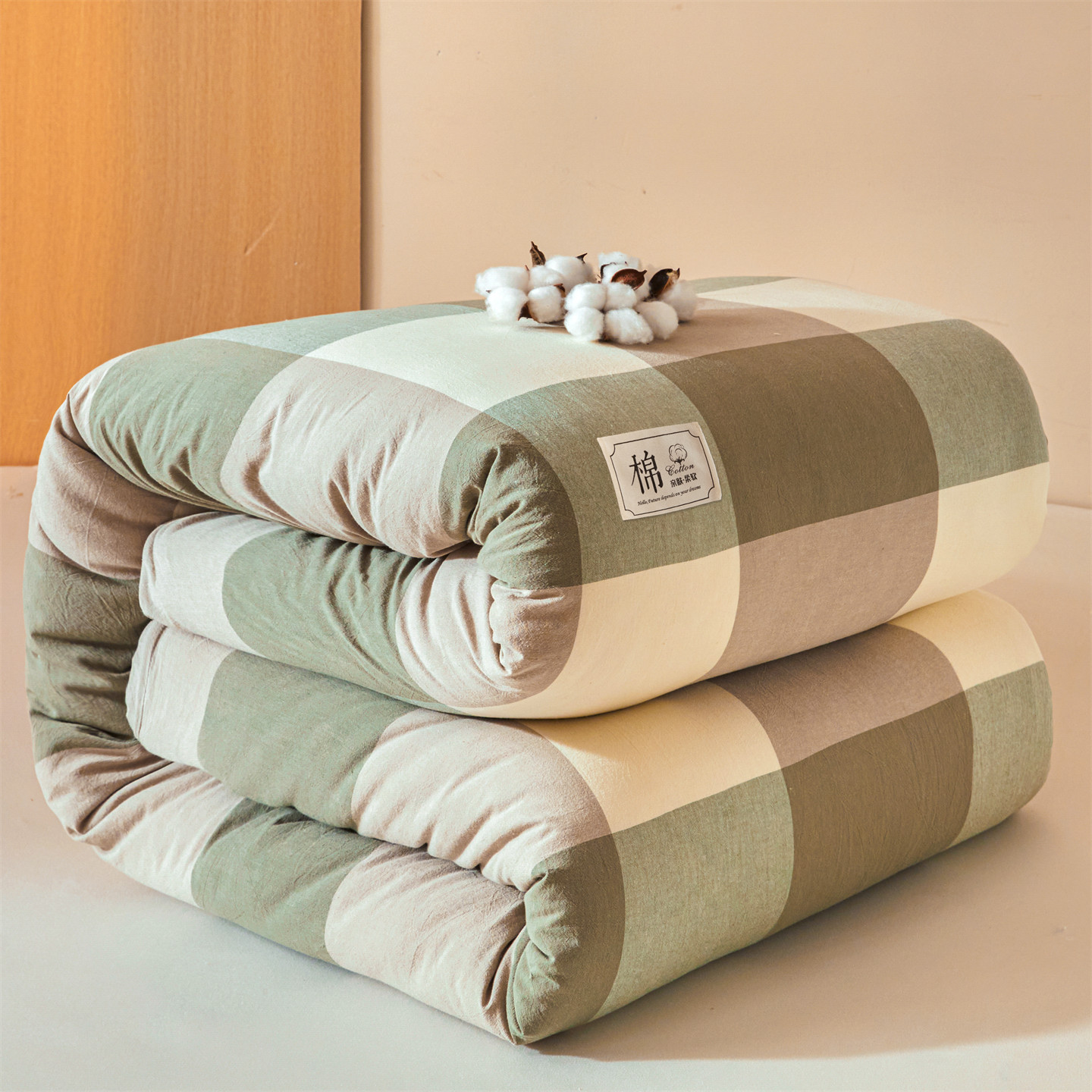 • 91家纺网 家纺一手货源 找家纺 梵蒂莎 2025新款可拆卸棉花被(场景1) 浅绿格影