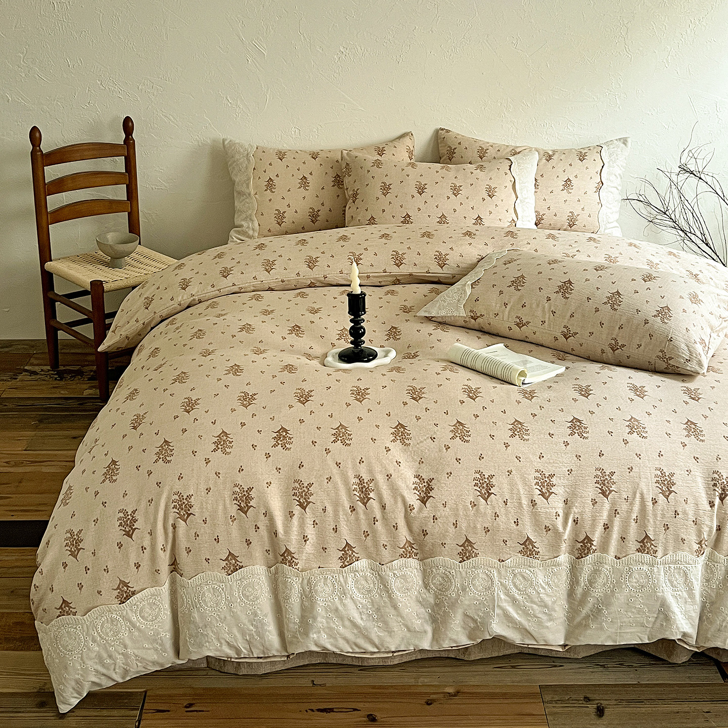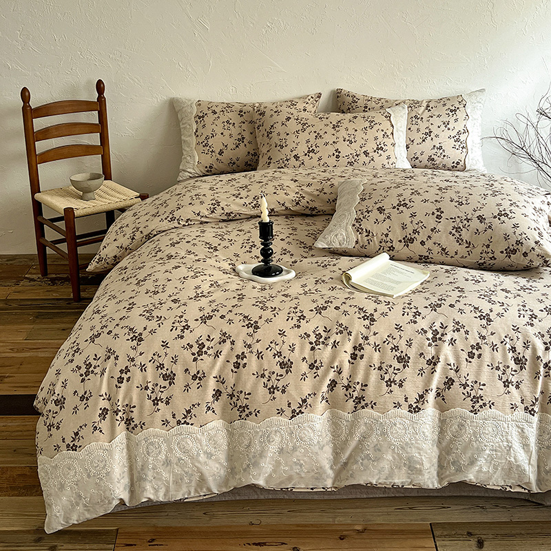 典曼家纺 2025秋冬新品A类高克重亚麻复古花边侘寂风原麻四件套 茶里