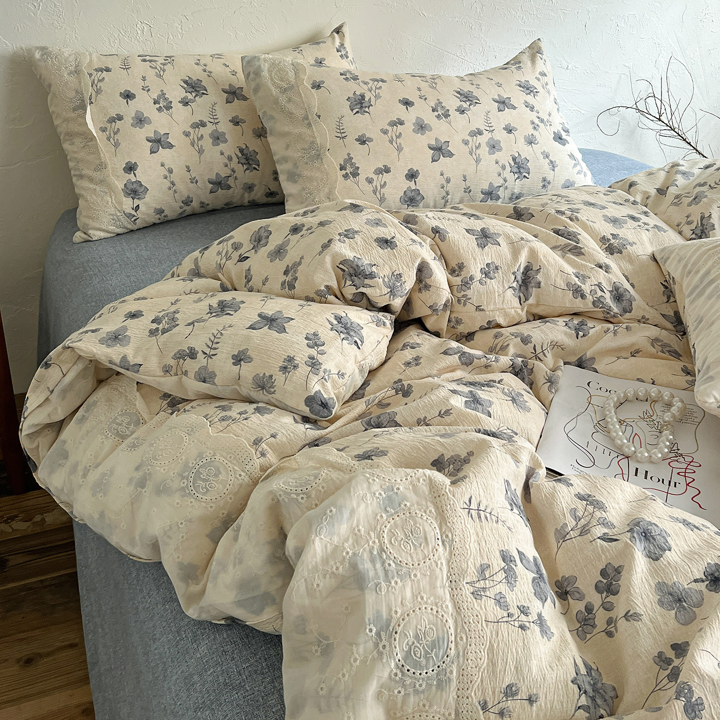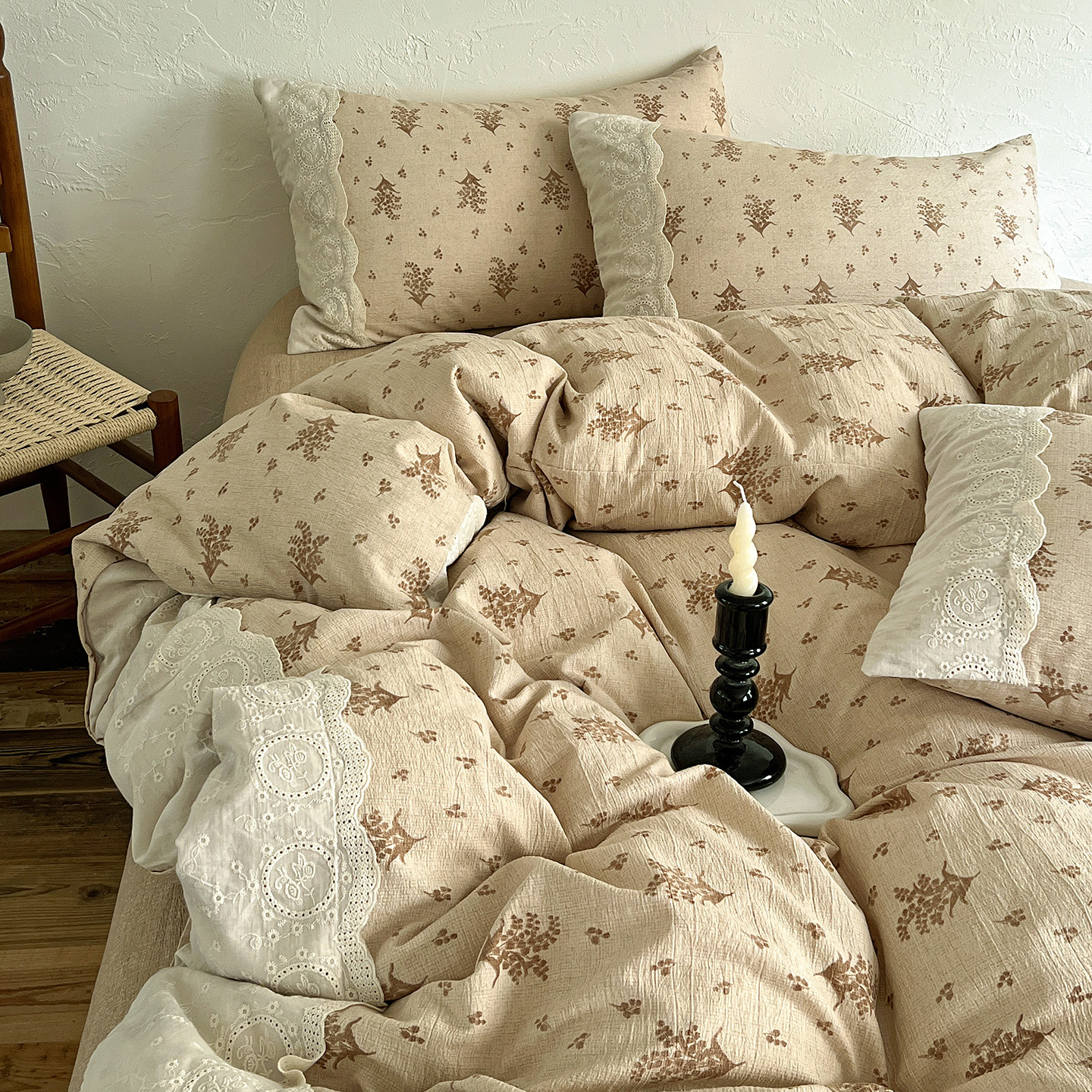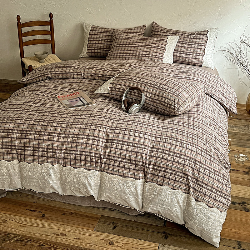 商品名称:典曼家纺 2025秋冬新品A类高克重亚麻复古花边侘寂风原麻四件套 茶里