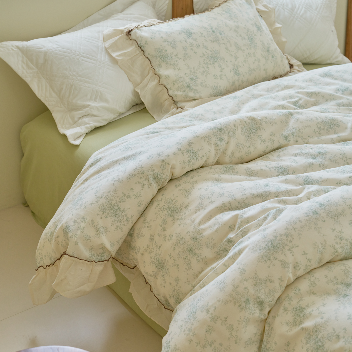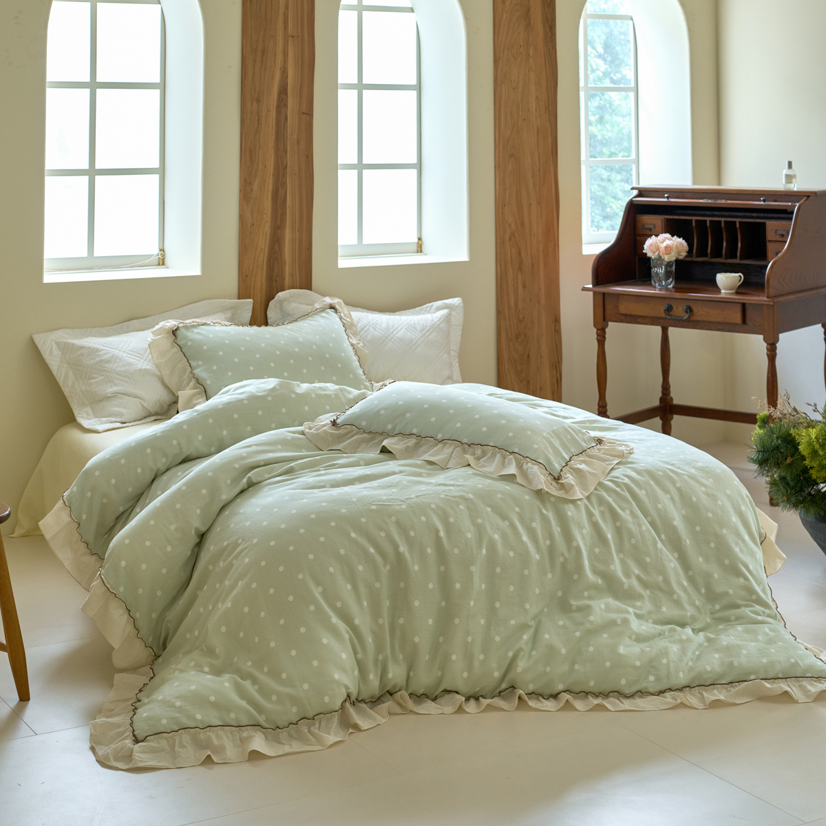 洋铭区(原狠狠爱) 2025新款法式荷叶边全棉双层纱四件套系列 抹茶圆点