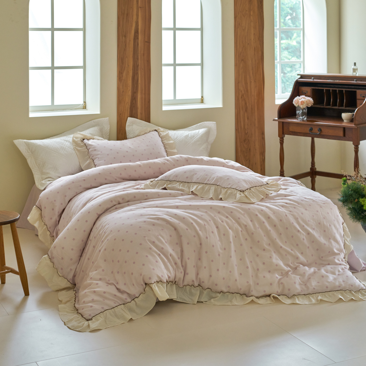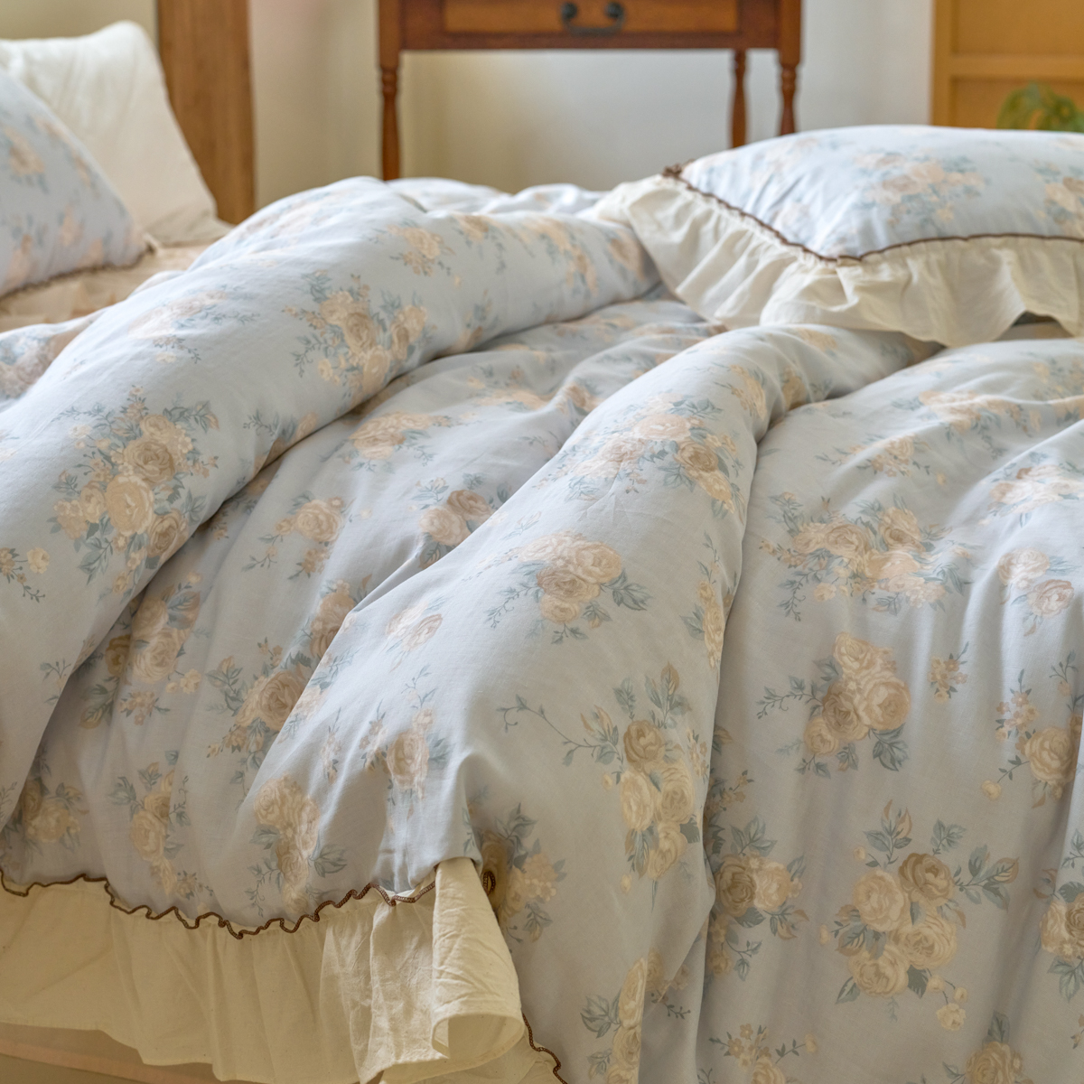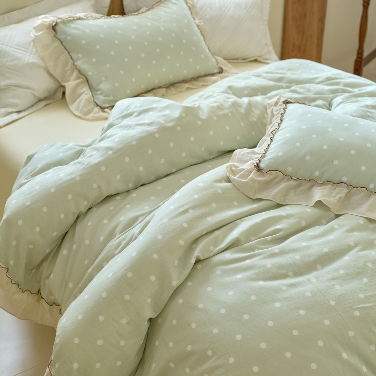 商品名称:洋铭区(原狠狠爱) 2025新款法式荷叶边全棉双层纱四件套系列 抹茶圆点