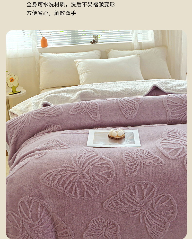 (总)莱家富 2026新款加厚双层复合毯舒棉绒剪花毛毯,兰色,绿色,米色,深灰色,樱花粉,紫色