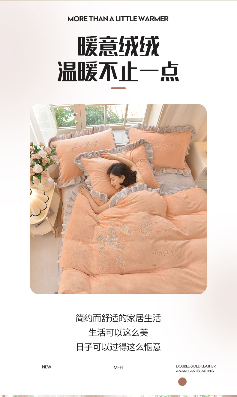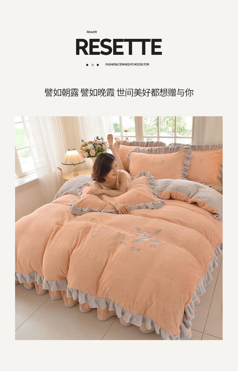 鑫喜莱家纺 2025新款刺绣双层花边牛奶绒四件套(注意控价 标准尺寸156元,实际售价不得低于控价的价格) 花韵-暖玉