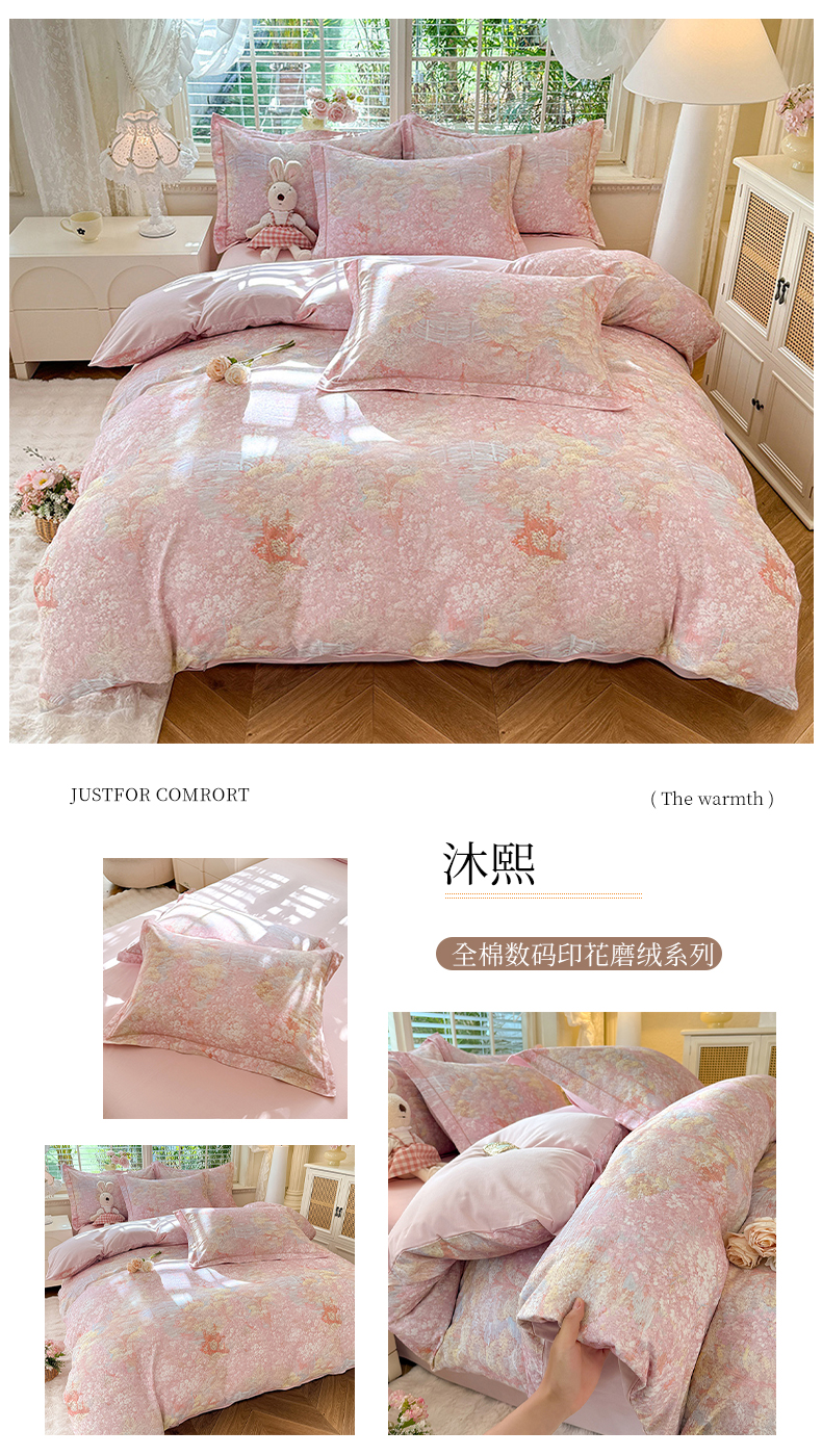 当前位置: 91家纺网 > 商品网购 > 床品套件 > 四件套 > 全棉普通四件套 > 巧玲珑 2025新款100%数码印花生态AB版四件套 沐熙