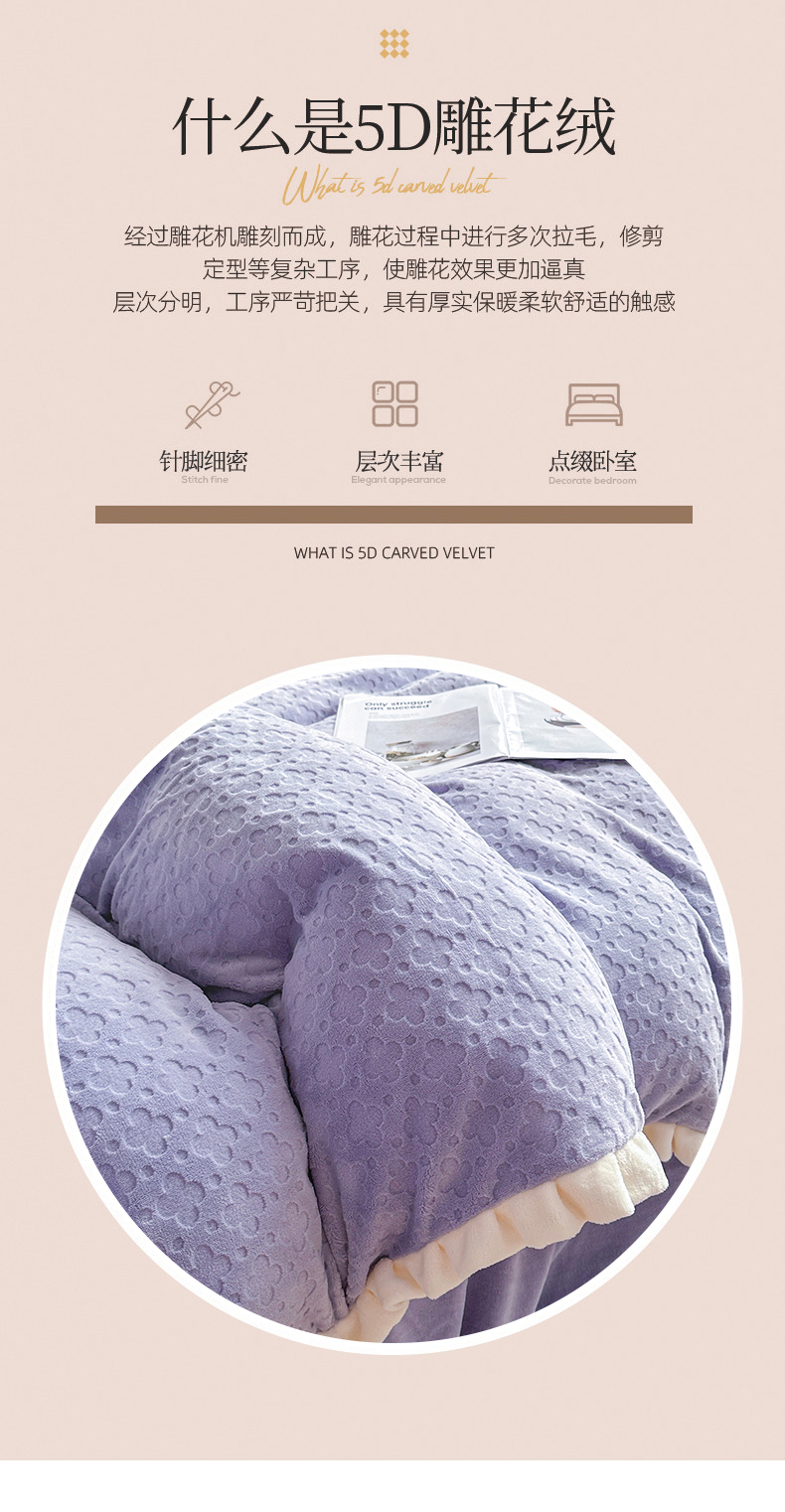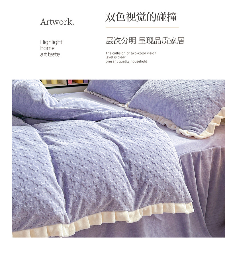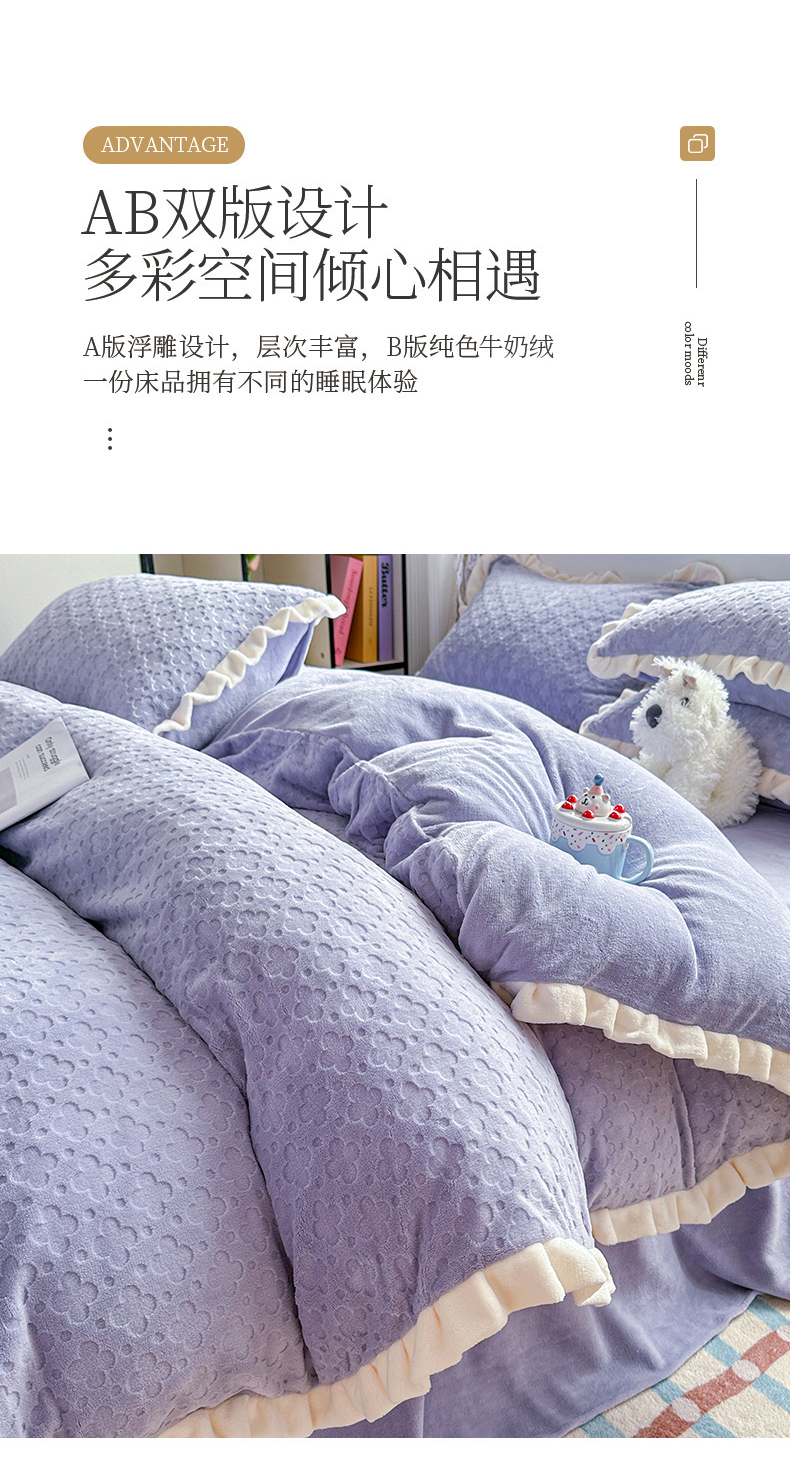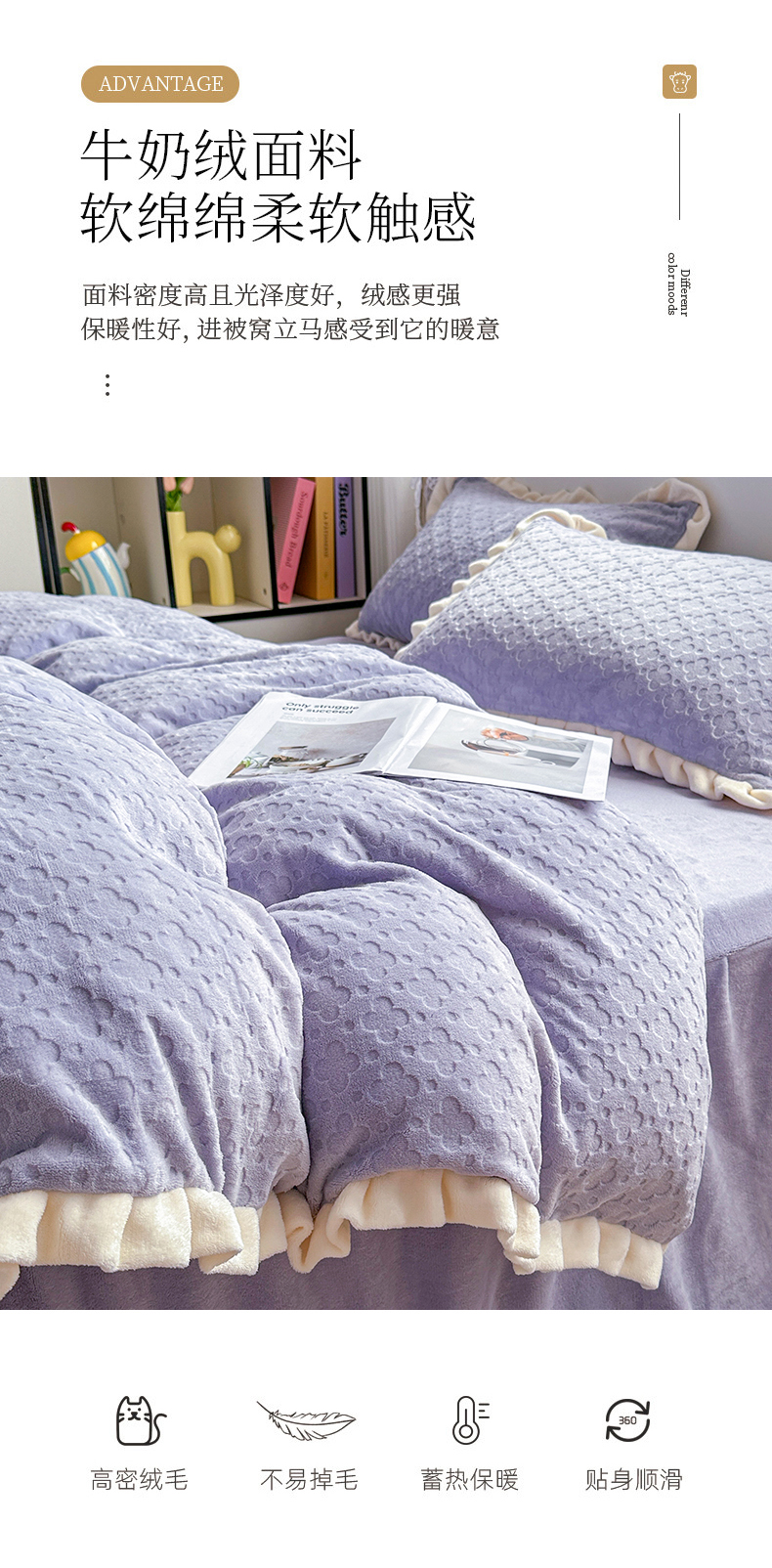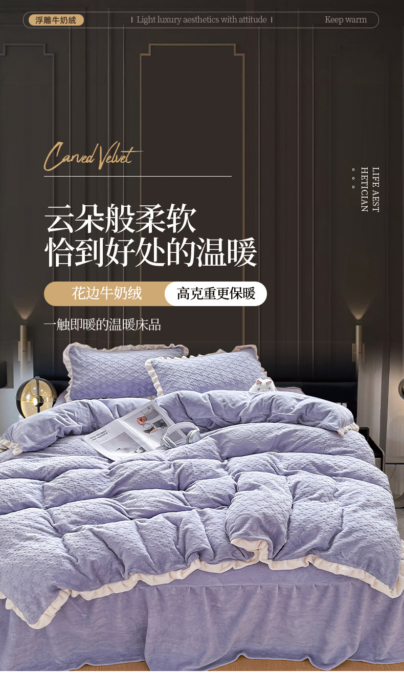 当前位置: 91家纺网 > 商品网购 > 床品套件 > 四件套 > 牛奶绒四件套 > KA家纺 2025秋冬新款床裙款雕花牛奶绒四件套-繁花系列 繁花紫
