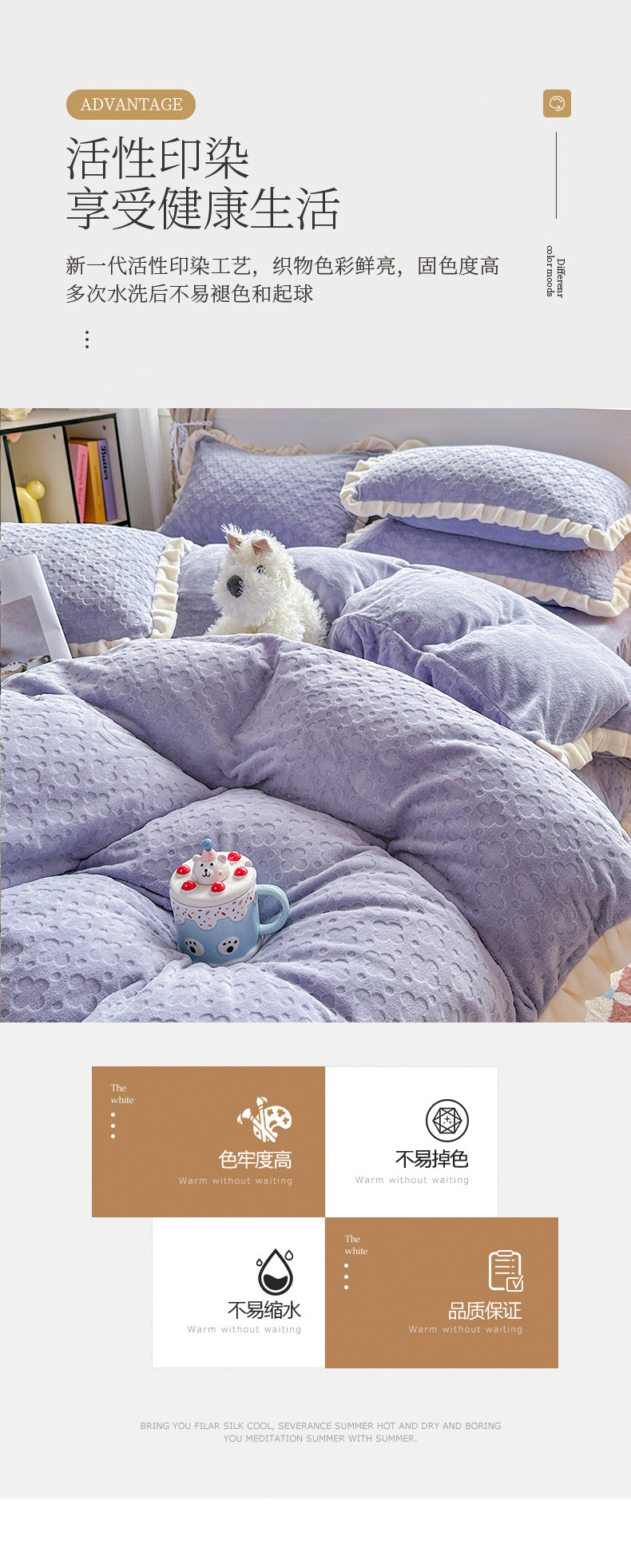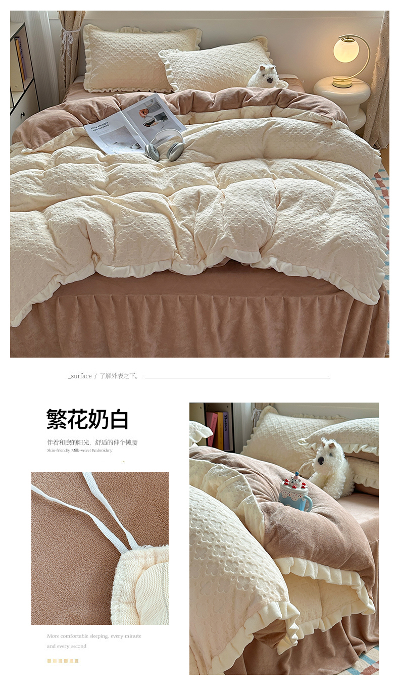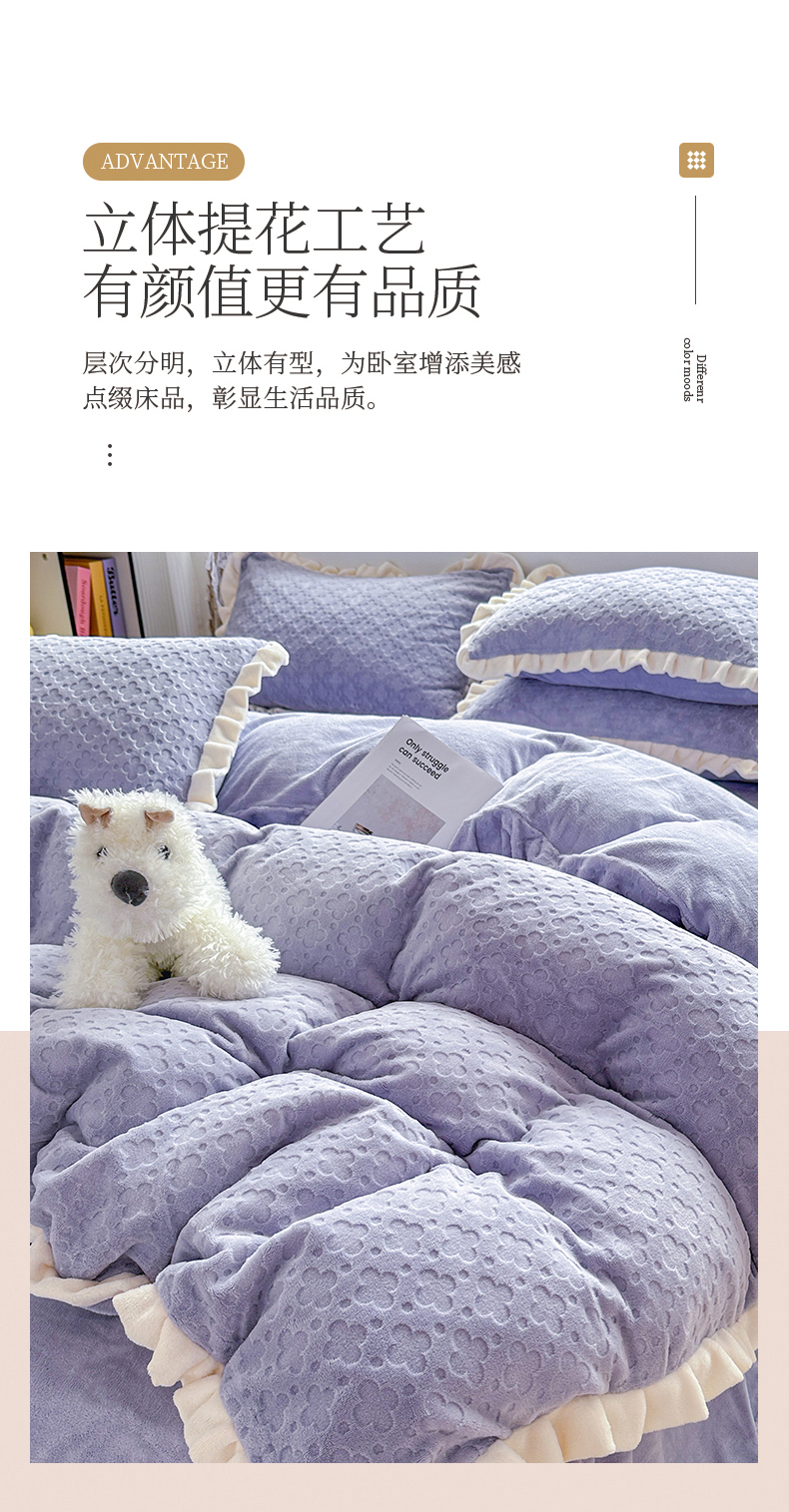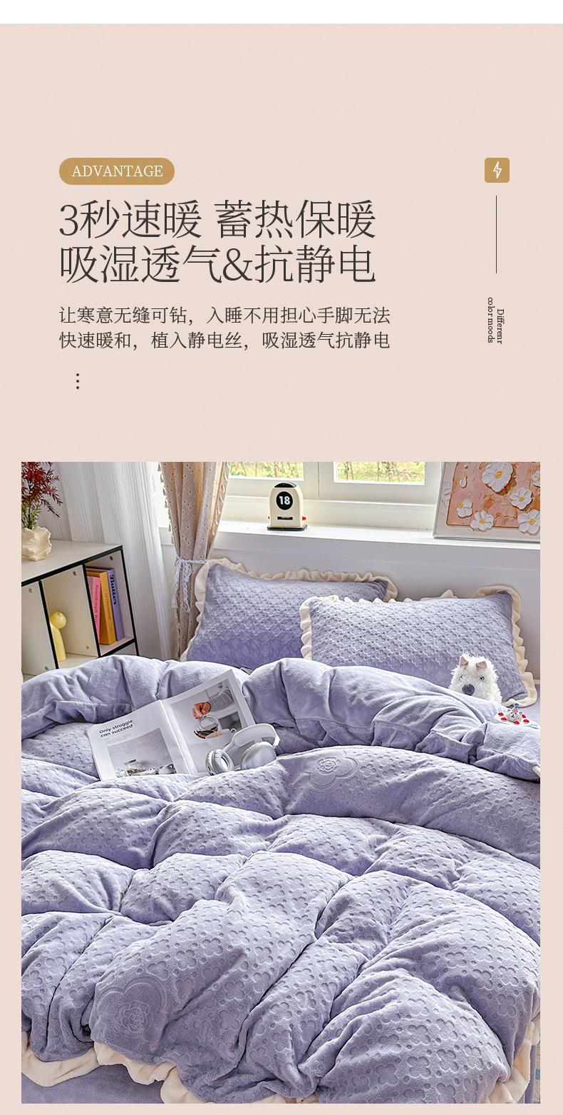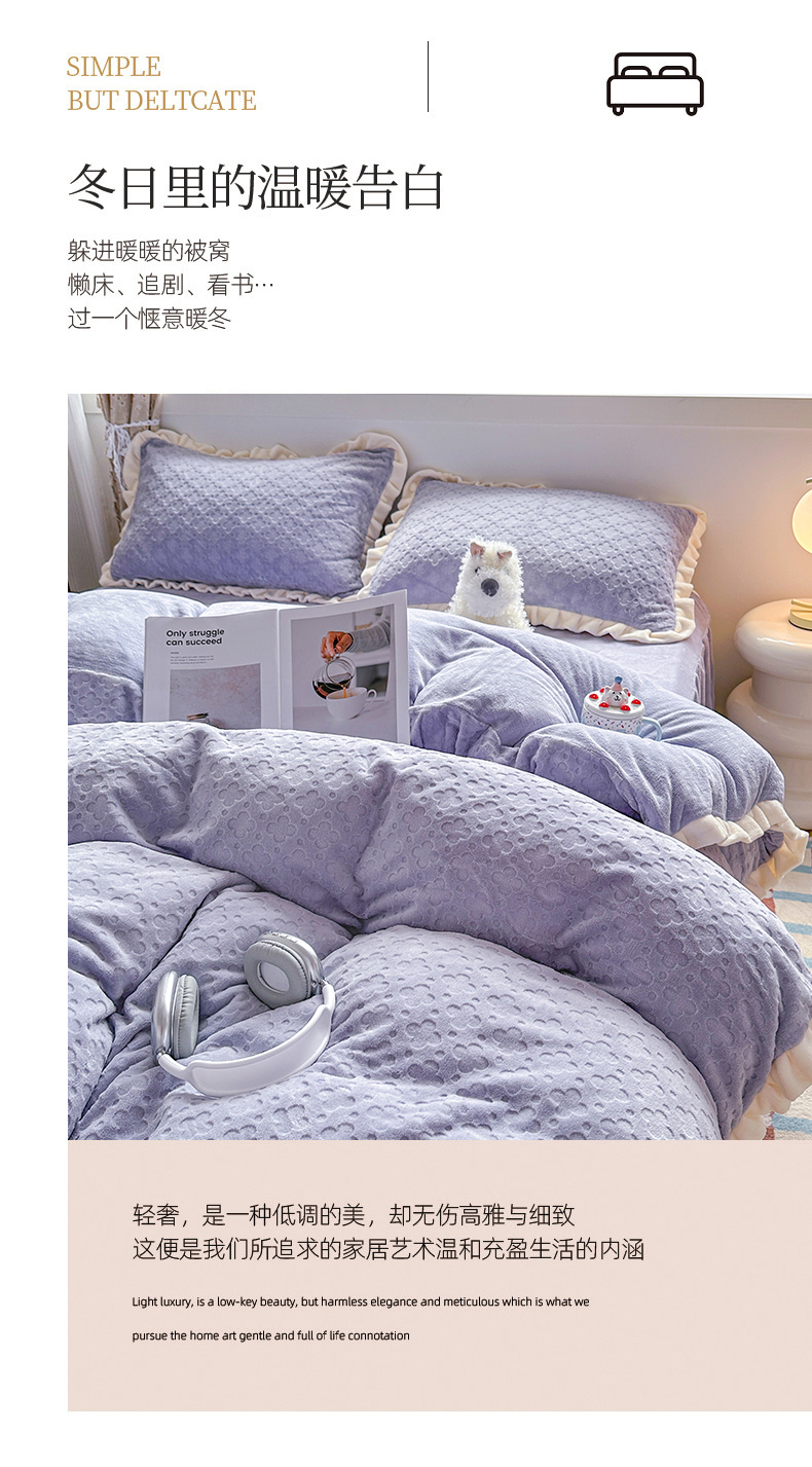 当前位置: 91家纺网 > 商品网购 > 床品套件 > 四件套 > 牛奶绒四件套 > KA家纺 2025秋冬新款床裙款雕花牛奶绒四件套-繁花系列 繁花紫