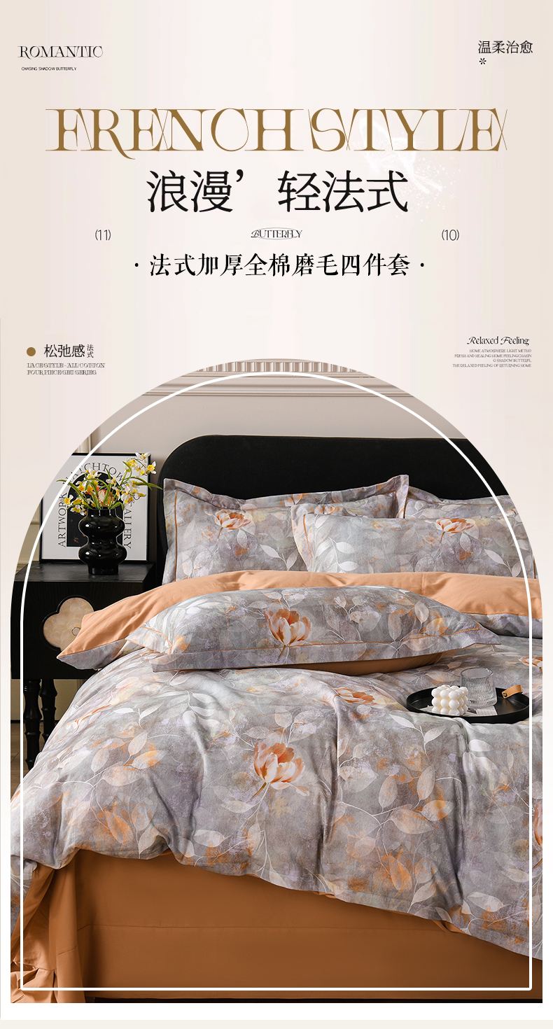 当前位置: 91家纺网 > 商品网购 > 床品套件 > 四件套 > 全棉普通四件套 > 金昱纺 2025新款法式加厚全棉纯棉磨毛四件套 羽翠韵-灰