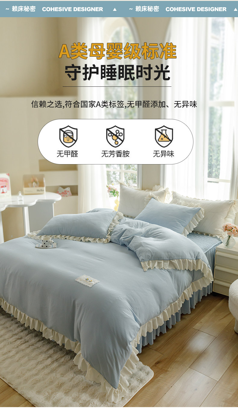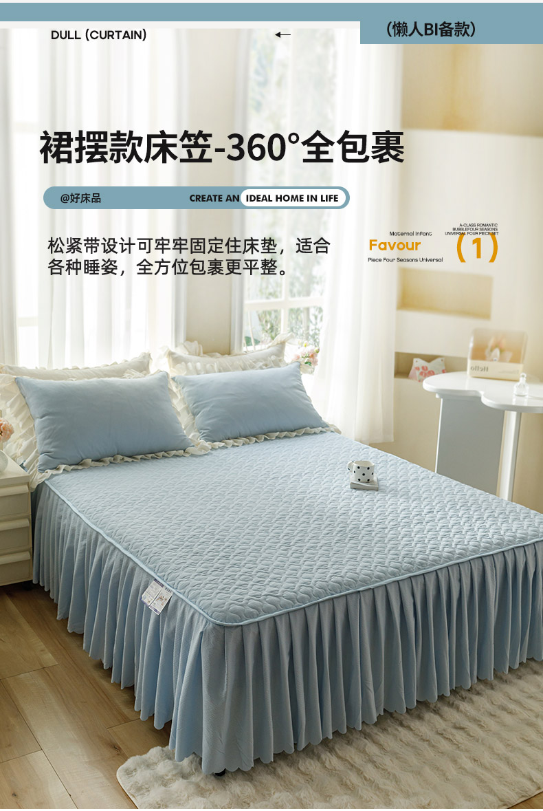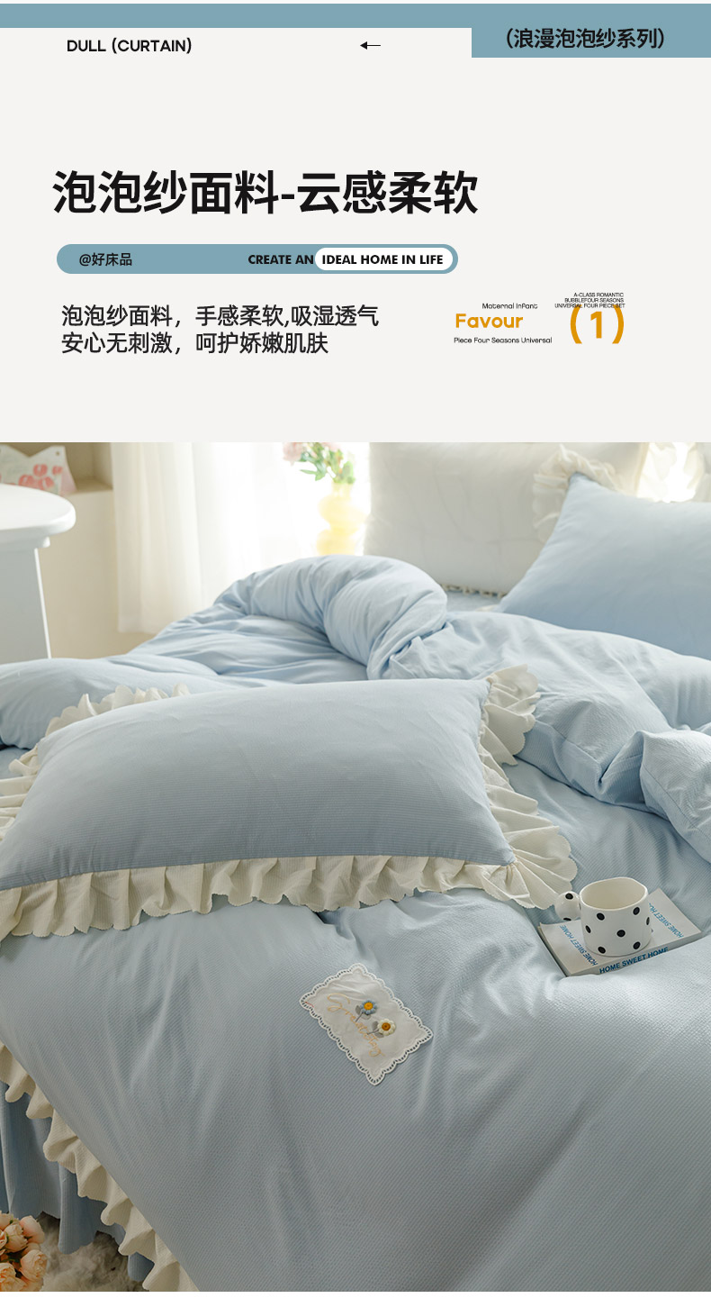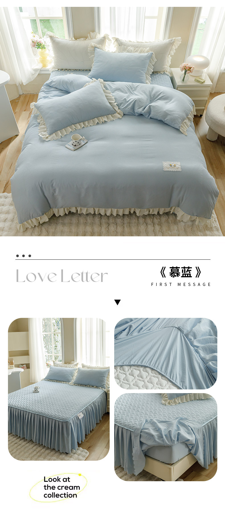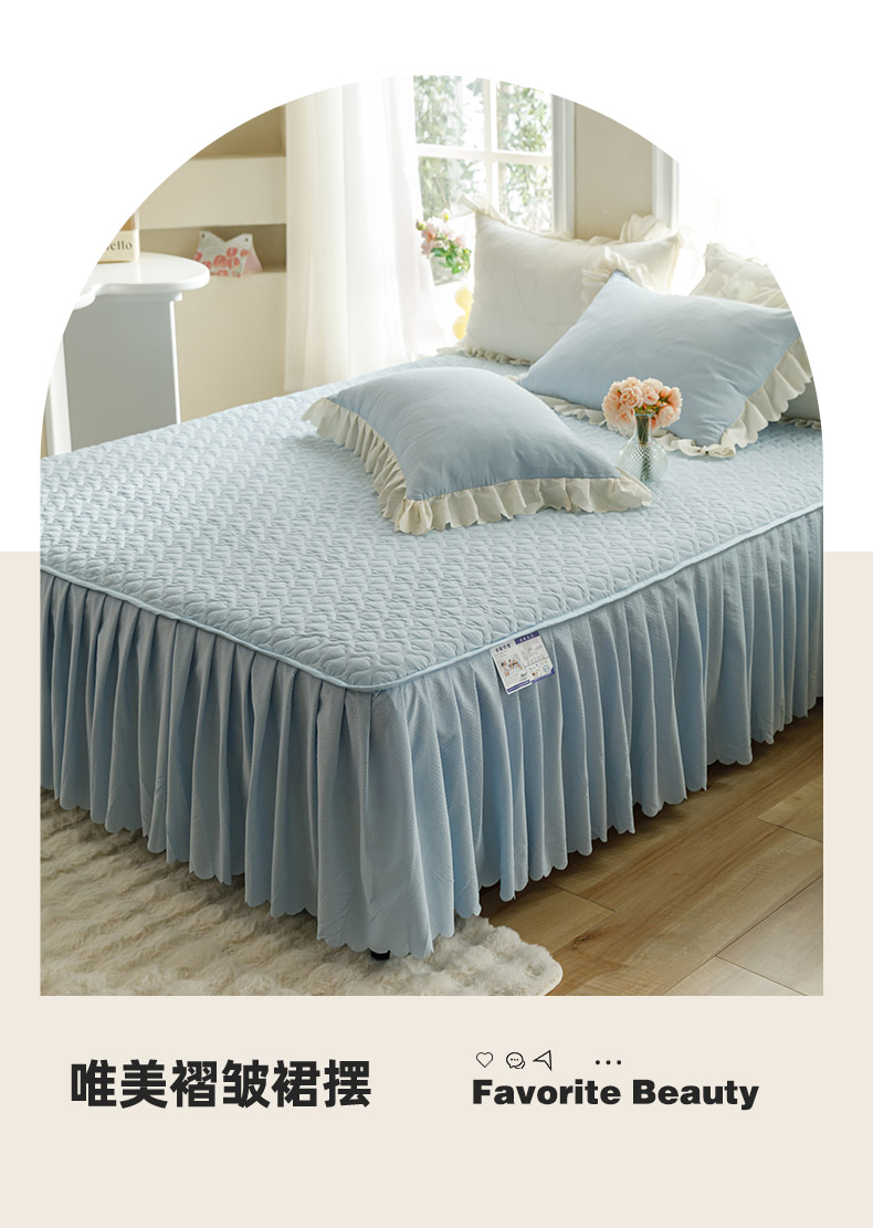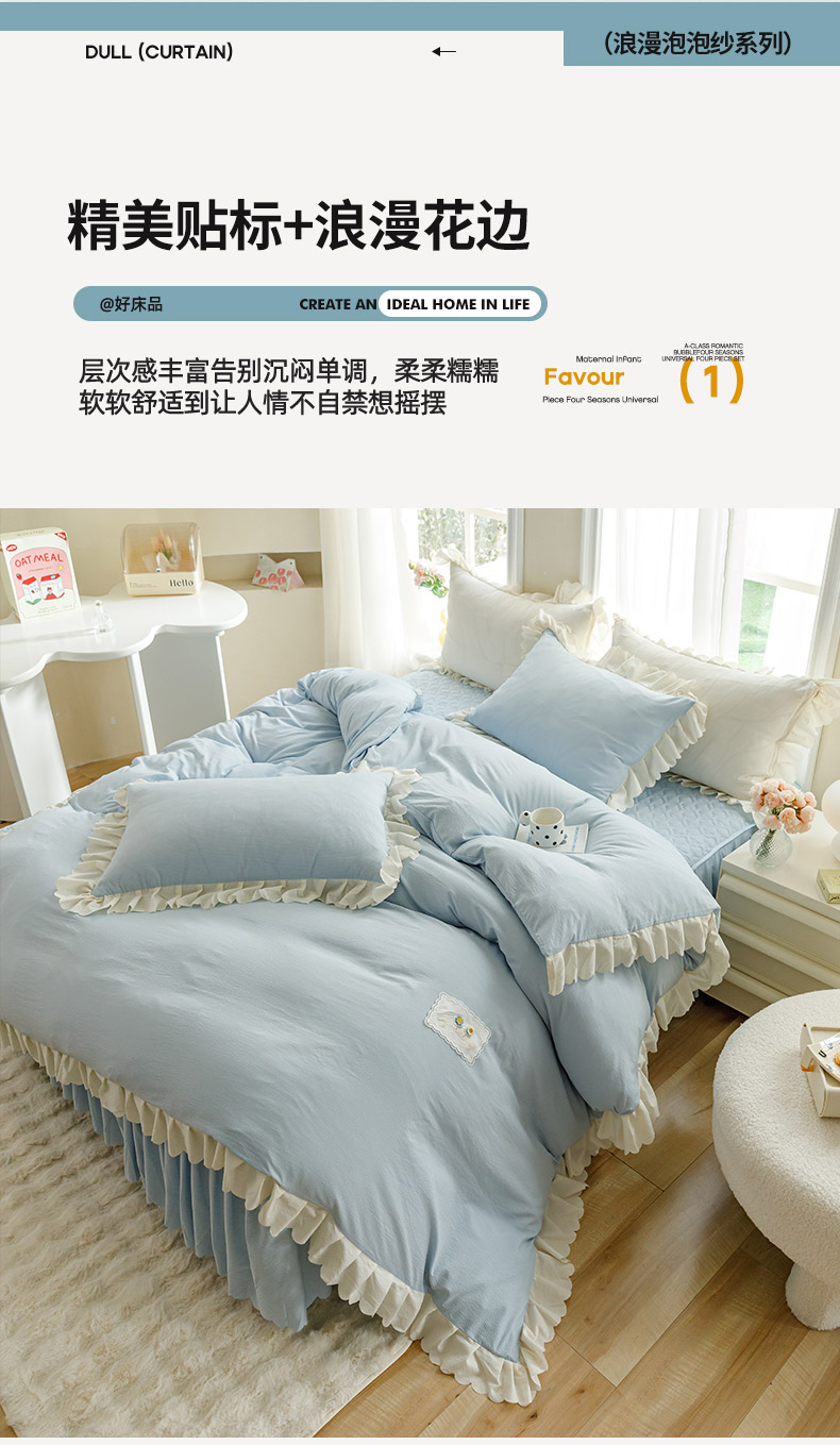 当前位置: 91家纺网 > 商品网购 > 床品套件 > 四件套 > 其它四件套 > 绒世界 2025新款四季款夹棉泡泡纱床裙床笠被套四件套系列 慕蓝