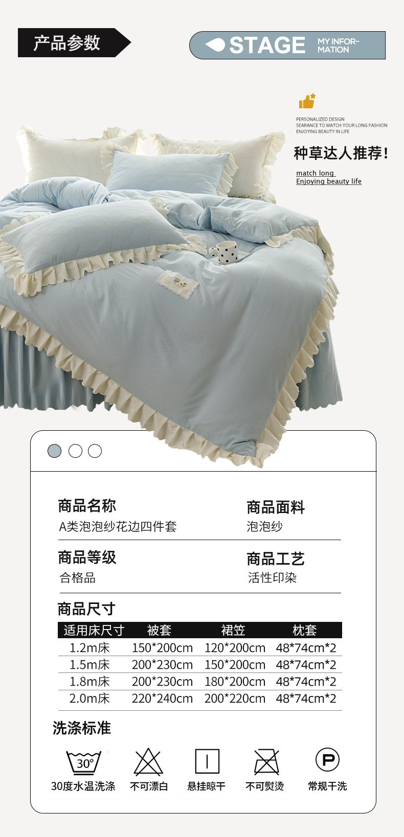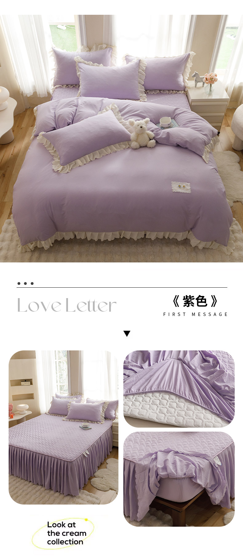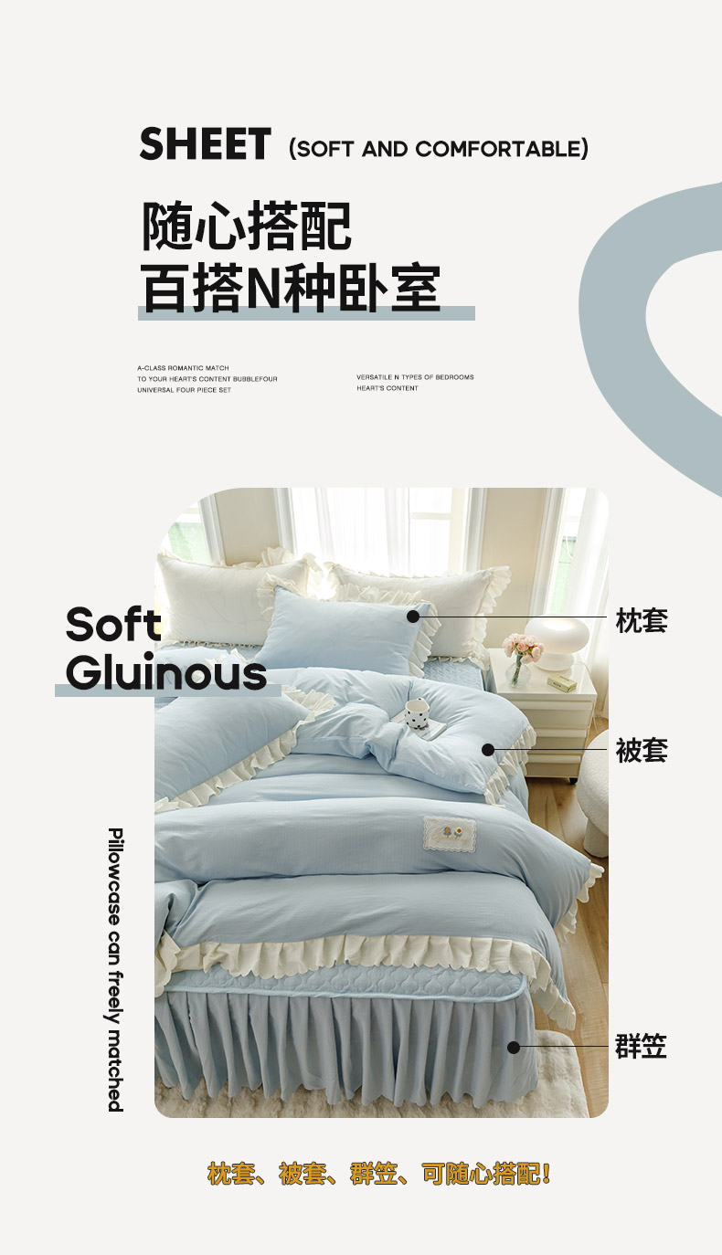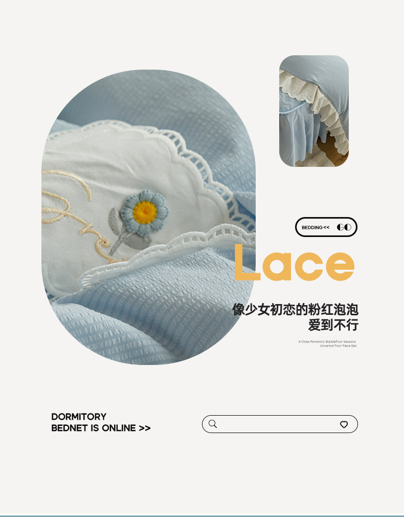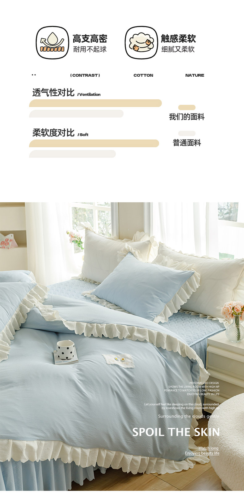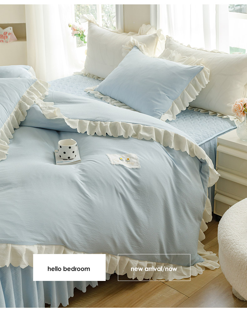 当前位置: 91家纺网 > 商品网购 > 床品套件 > 四件套 > 其它四件套 > 绒世界 2025新款四季款夹棉泡泡纱床裙床笠被套四件套系列 慕蓝