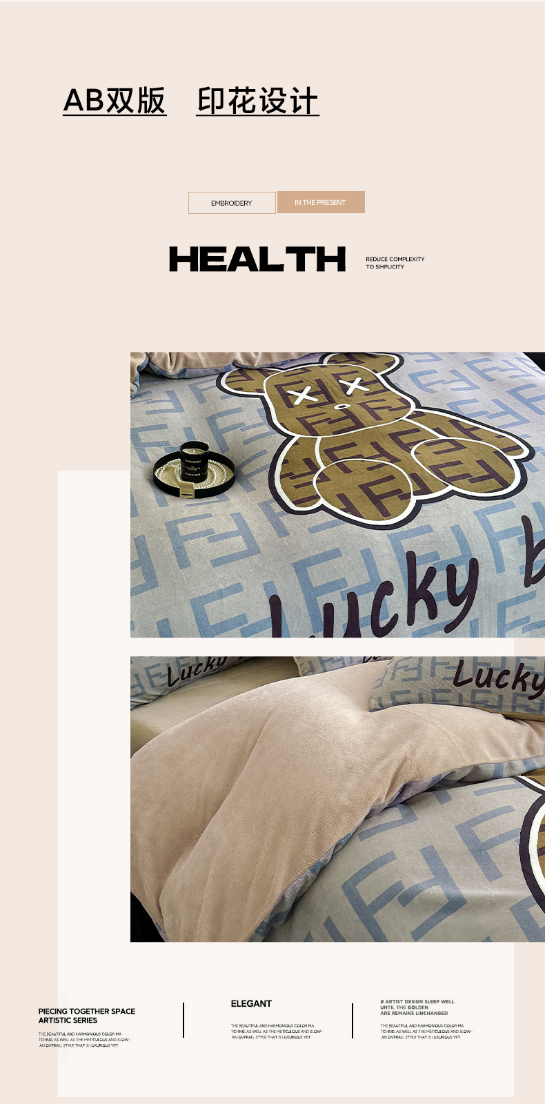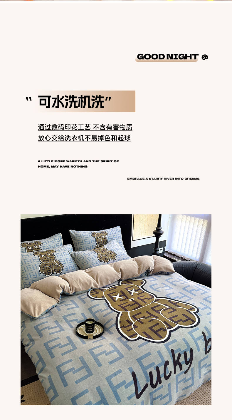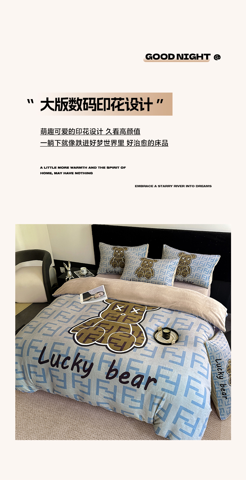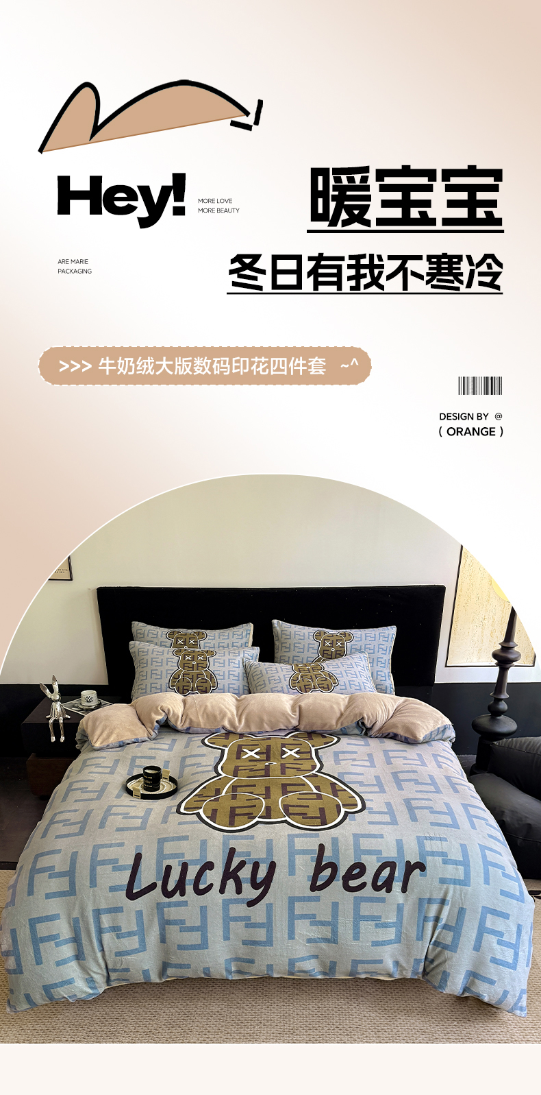 (总)摩卡(乐趣) 2025新款牛奶绒大版数码印花四件套,白香花,芬利熊,黑白V,灰迪,咔芬,卡布熊,可可熊,蓝白格,罗兰粉,萌迪,七彩熊,棋盘格公仔,山茶花,熊头白,熊仔白,熊仔咖