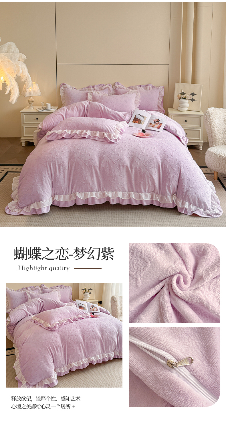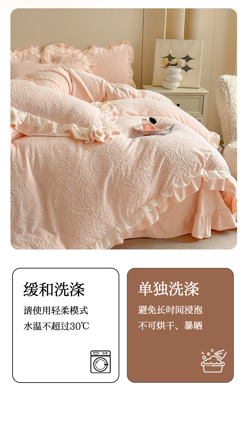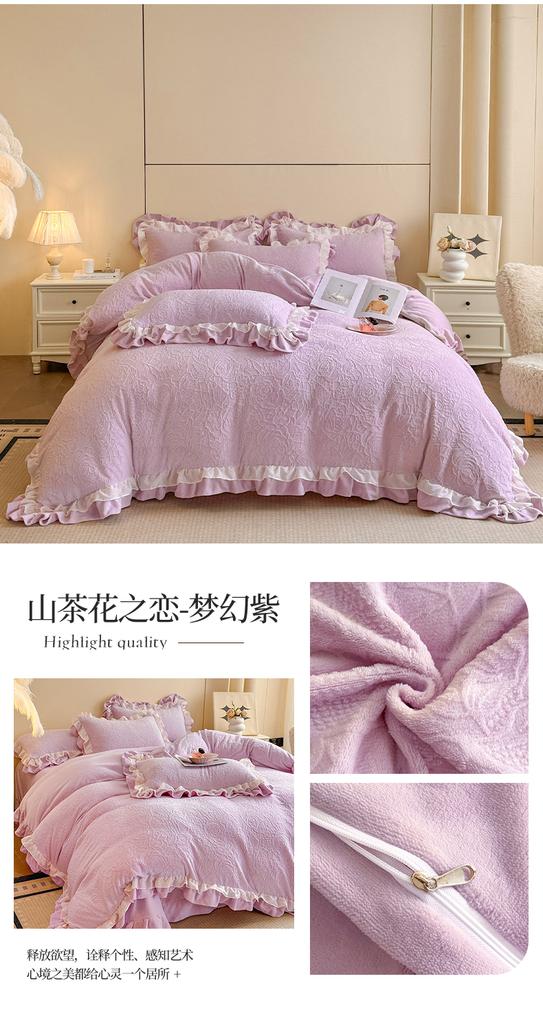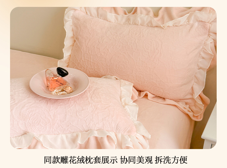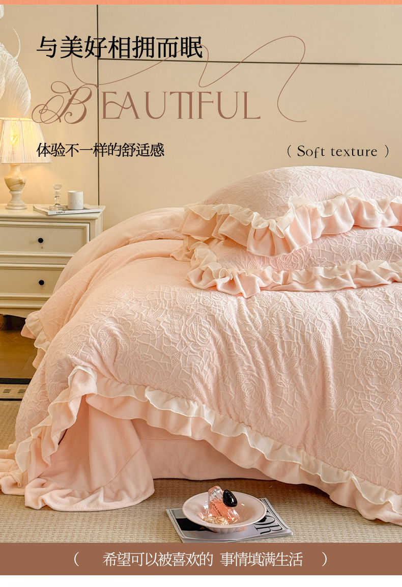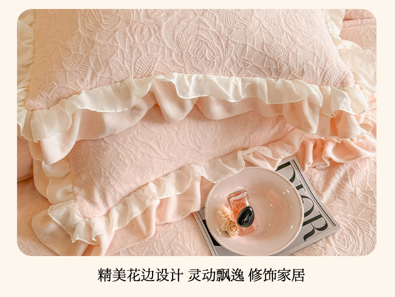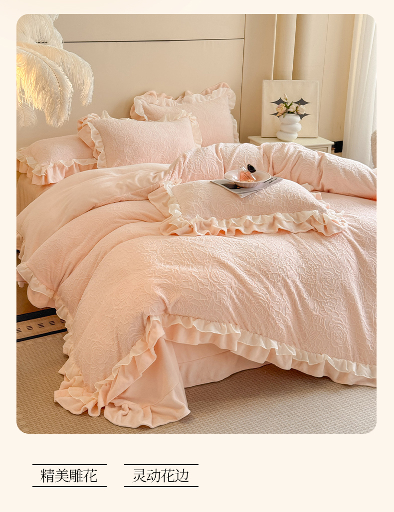 当前位置: 91家纺网 > 商品网购 > 床品套件 > 四件套 > 牛奶绒四件套 > 爱家(原缔乐家纺) 2025新款A类牛奶雕花绒四件套 山茶花-蝴蝶之恋系列 山茶花之恋-公主粉