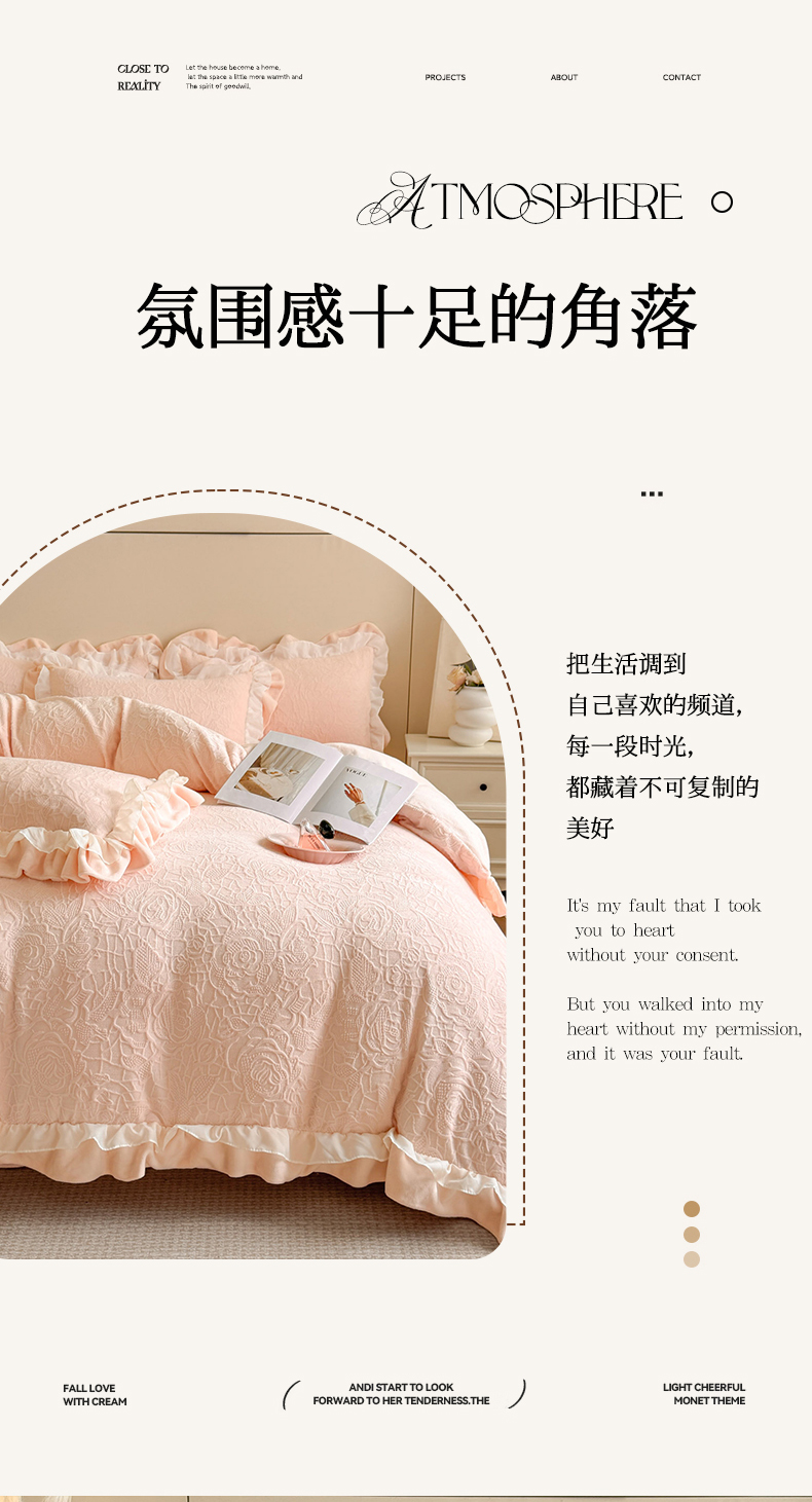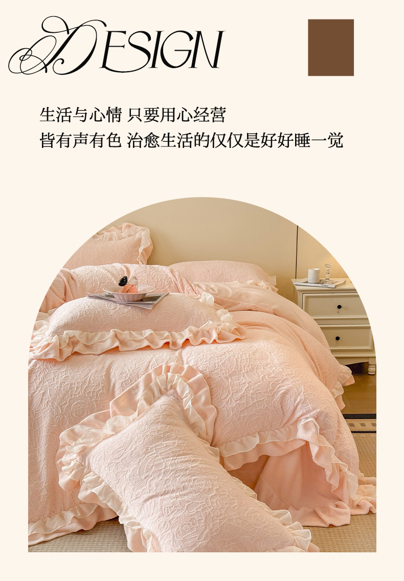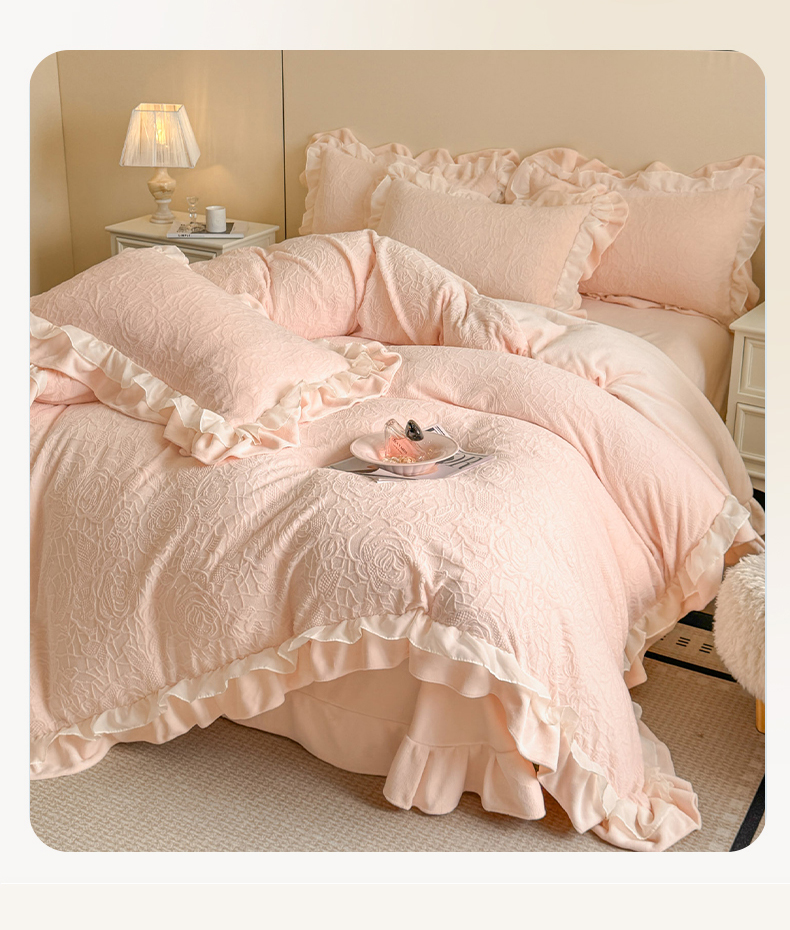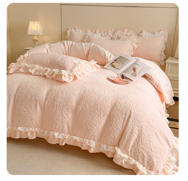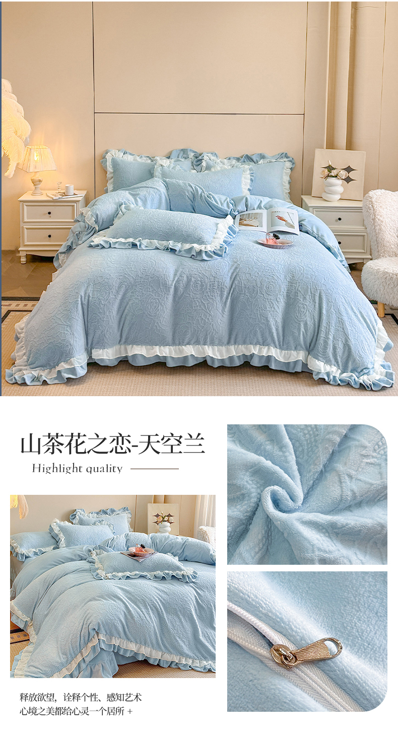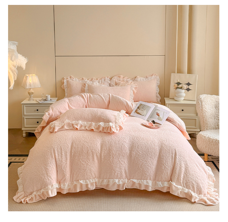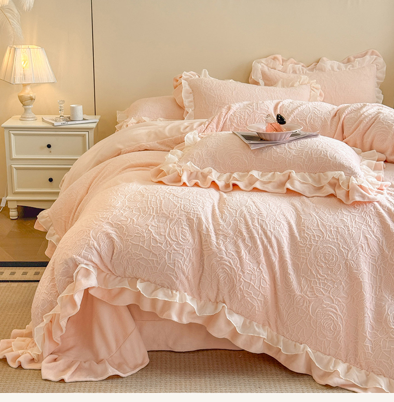当前位置: 91家纺网 > 商品网购 > 床品套件 > 四件套 > 牛奶绒四件套 > 爱家(原缔乐家纺) 2025新款A类牛奶雕花绒四件套 山茶花-蝴蝶之恋系列 山茶花之恋-公主粉
