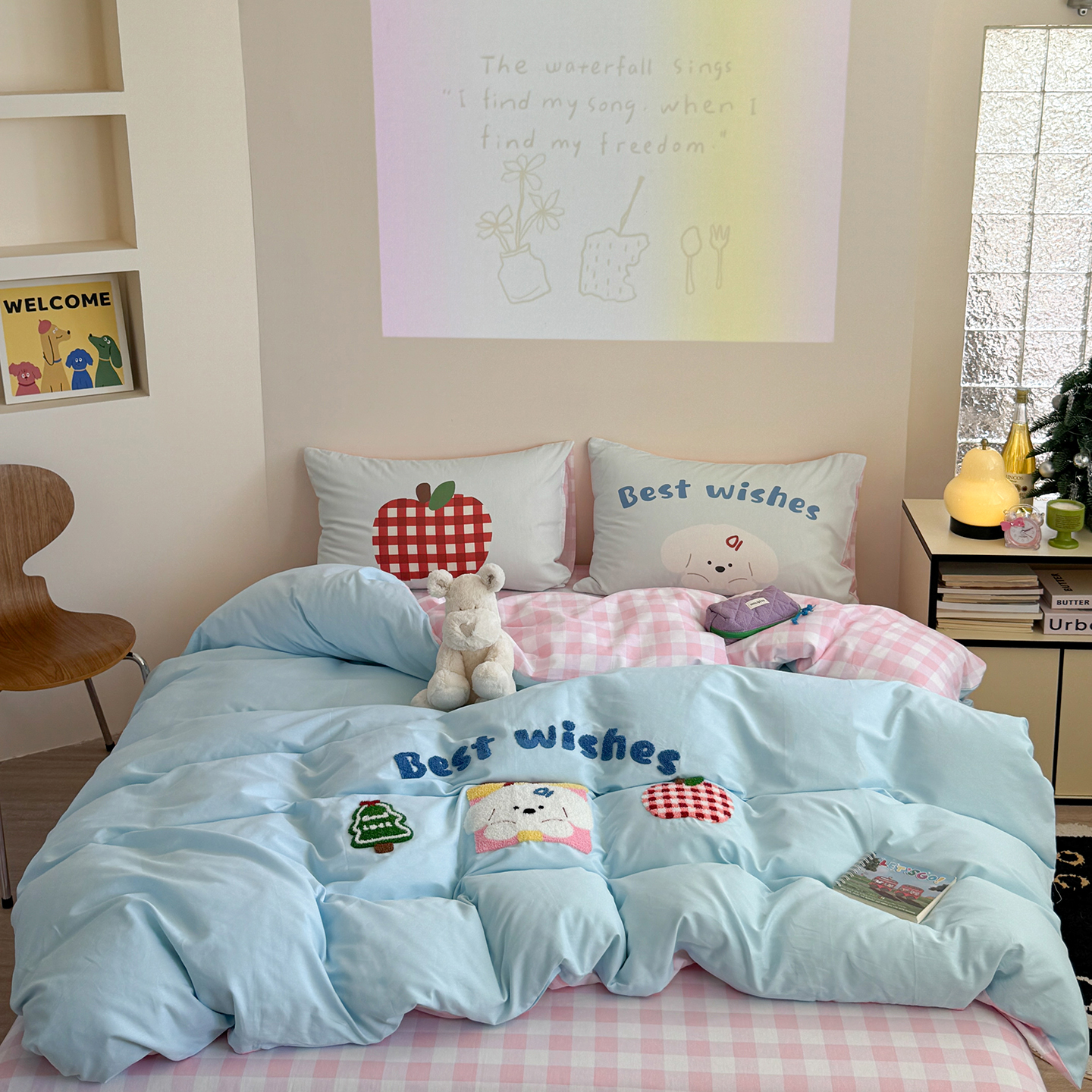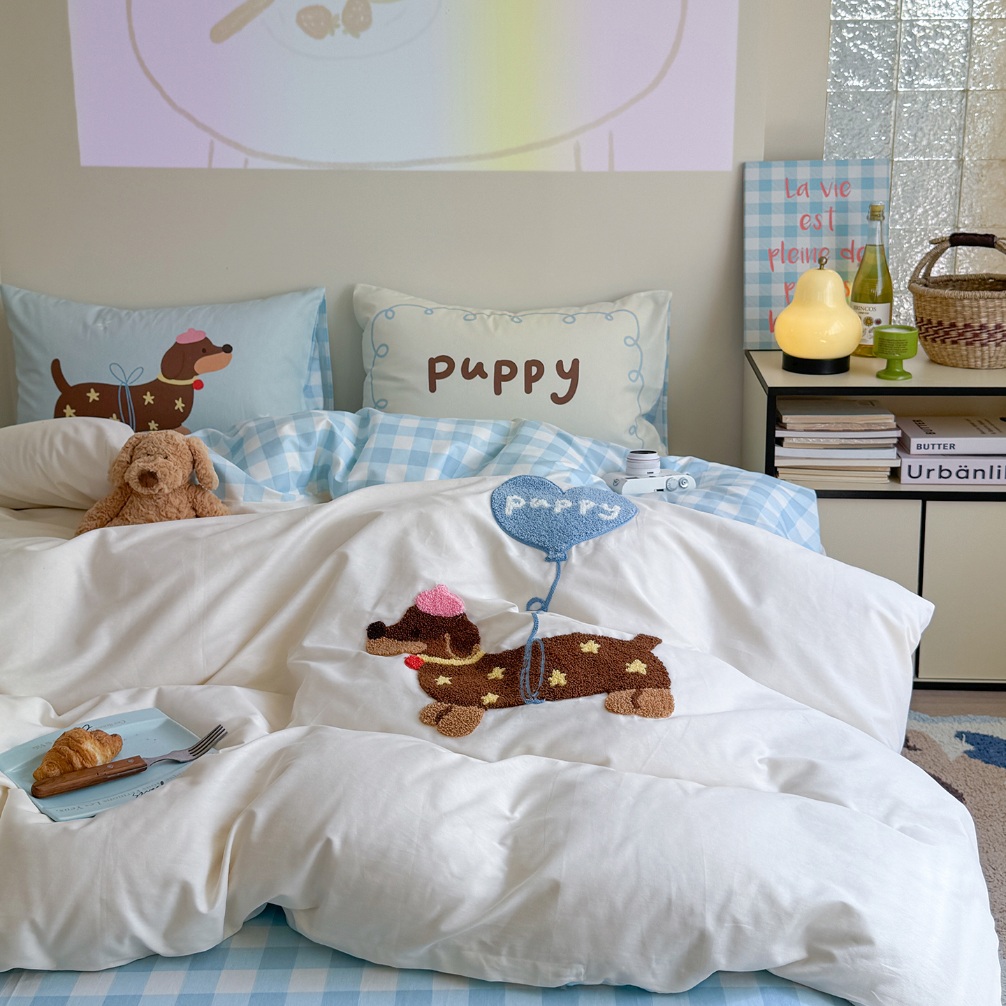 (总)美乐迪家纺 2026新款云感双层纱贴布绣四件套,睡货小狗,兔头小猫