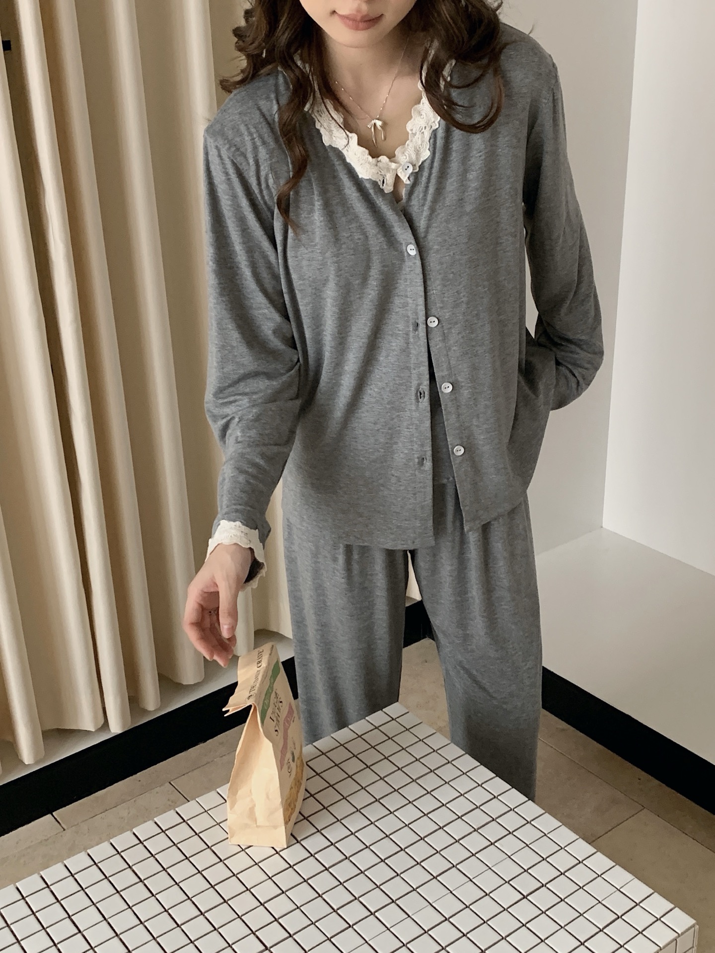 妍景家居生活馆 2025新款韩系25167-V领蕾丝三件套 灰色