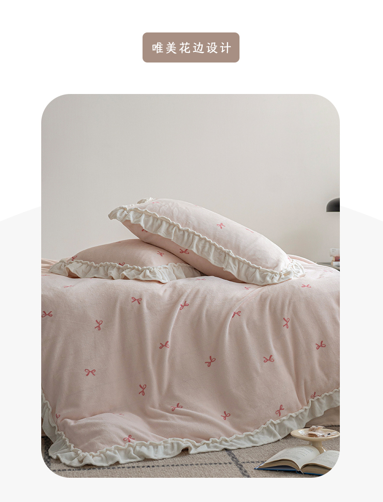 商品名称:(总)尺素 2025年蝴蝶结花边牛奶绒四件套ins风公主花边被套冬季保暖床单双人1.8床笠