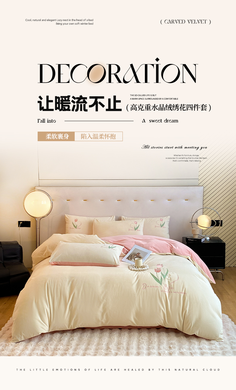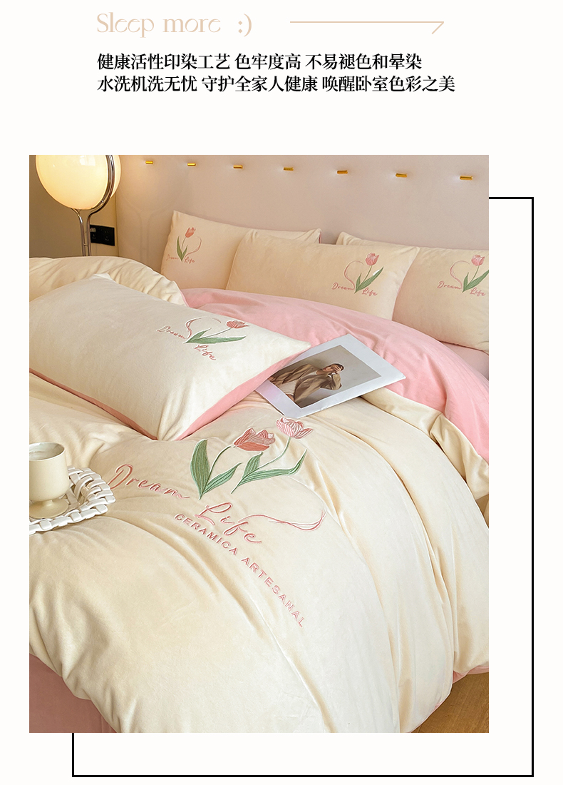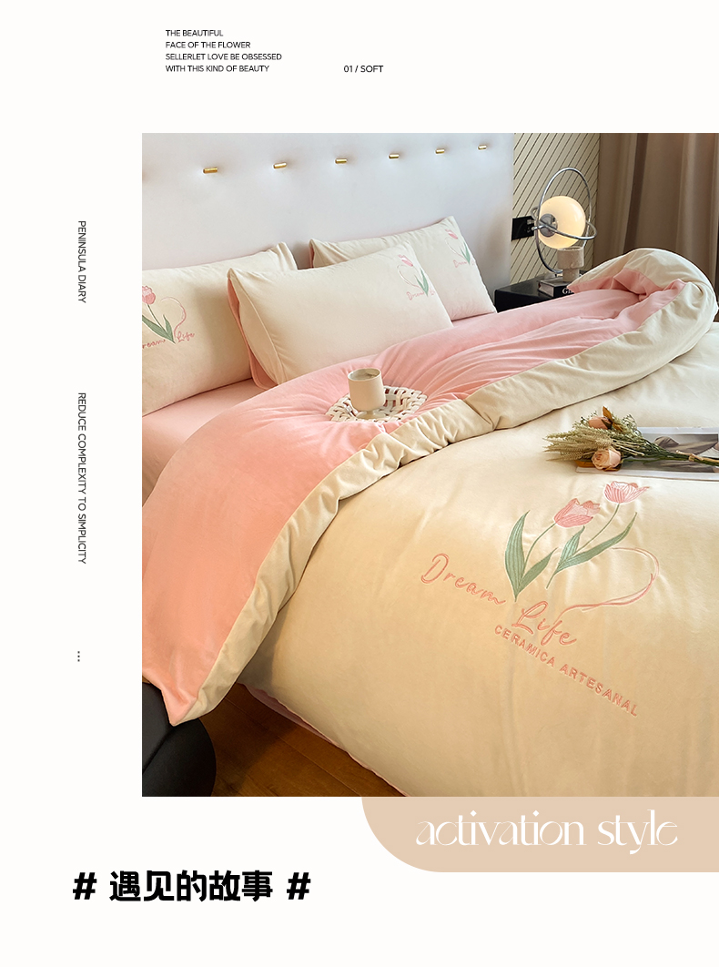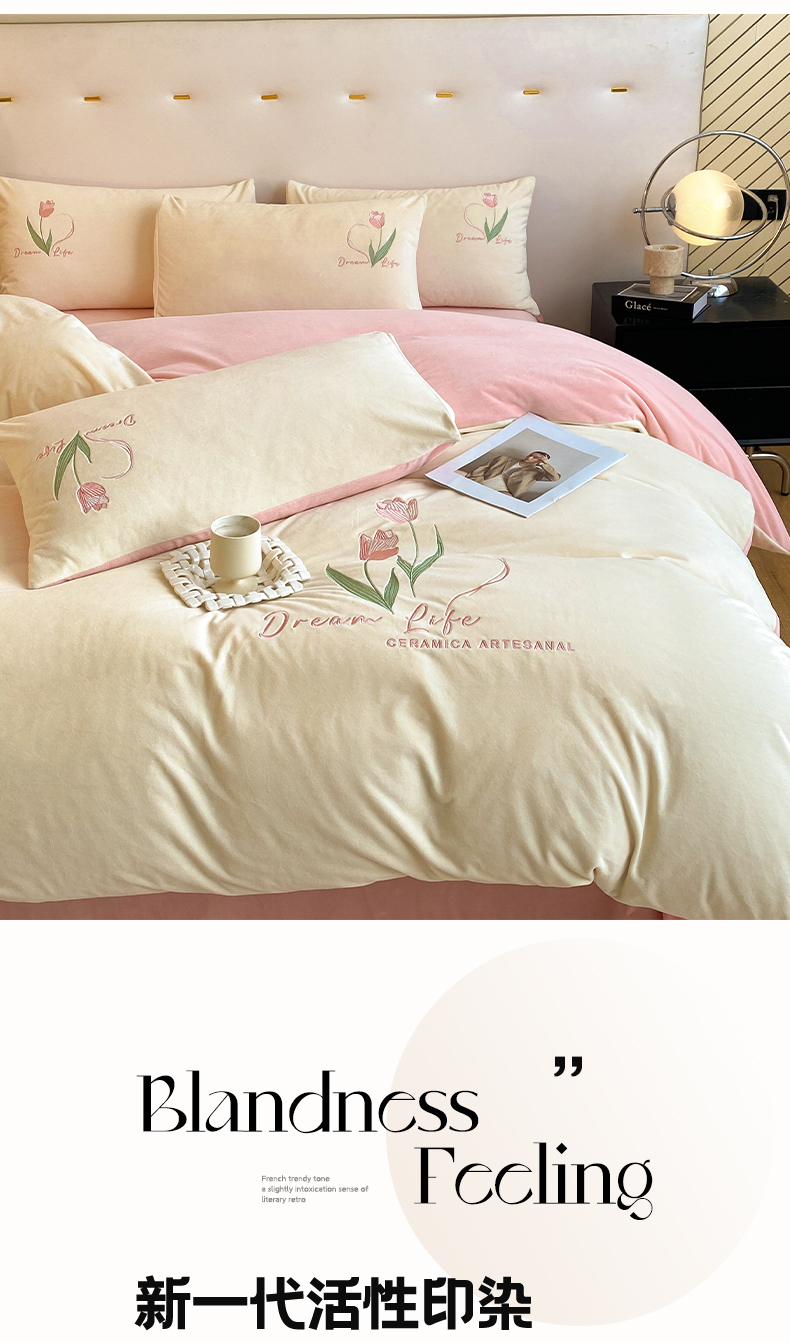 当前位置: 91家纺网 > 商品网购 > 床品套件 > 四件套 > 水晶绒四件套 > 如一 2025新款水晶绒双拼刺绣四件套-郁金香系列 郁金香-奶白粉