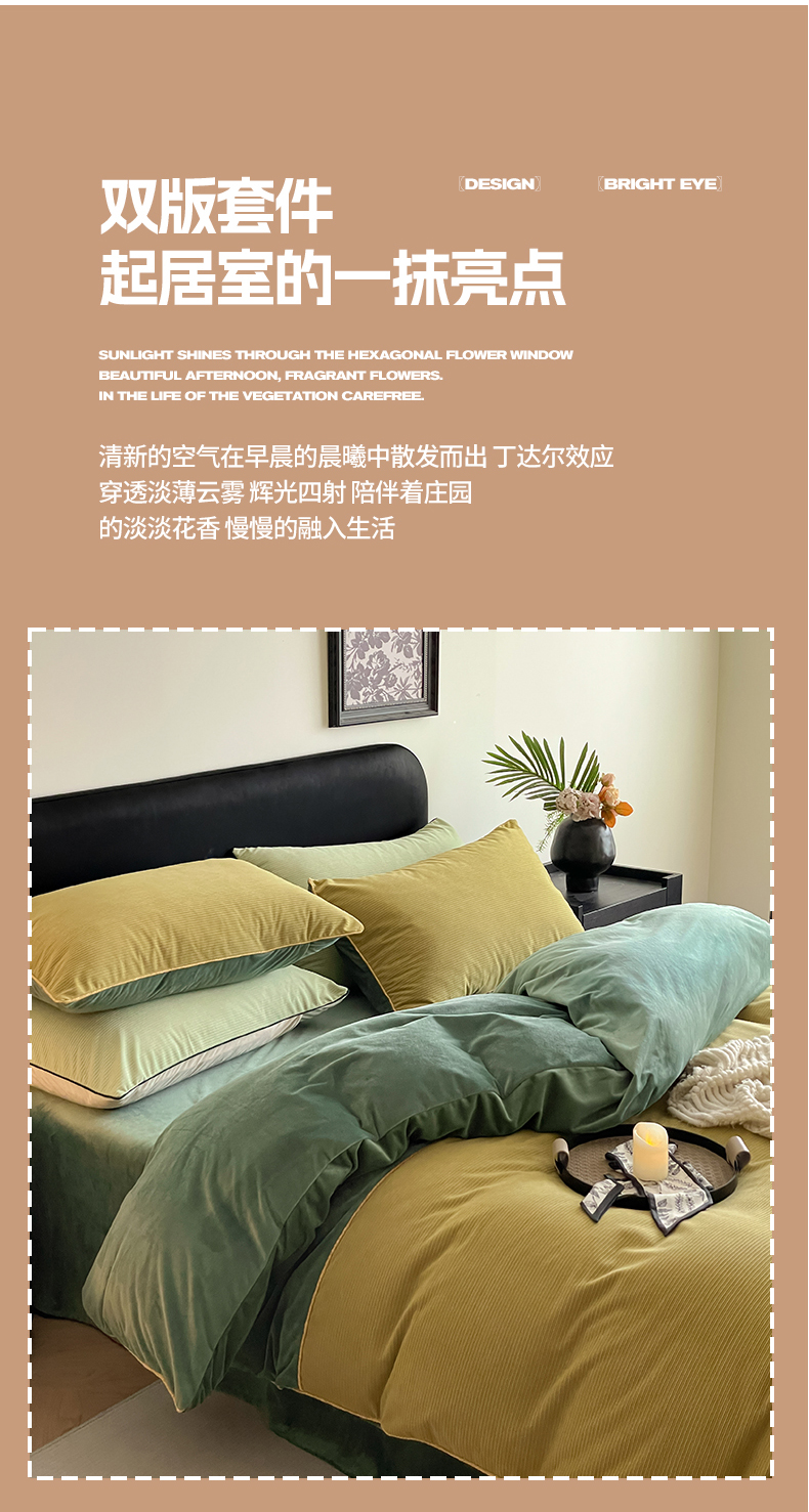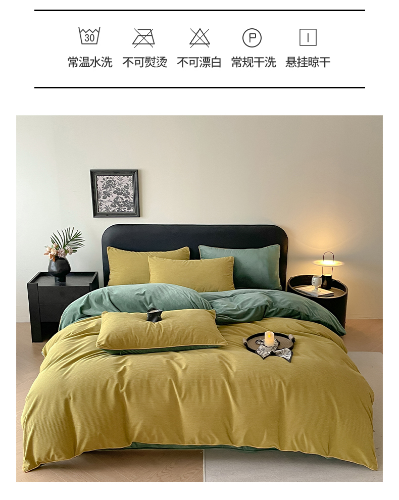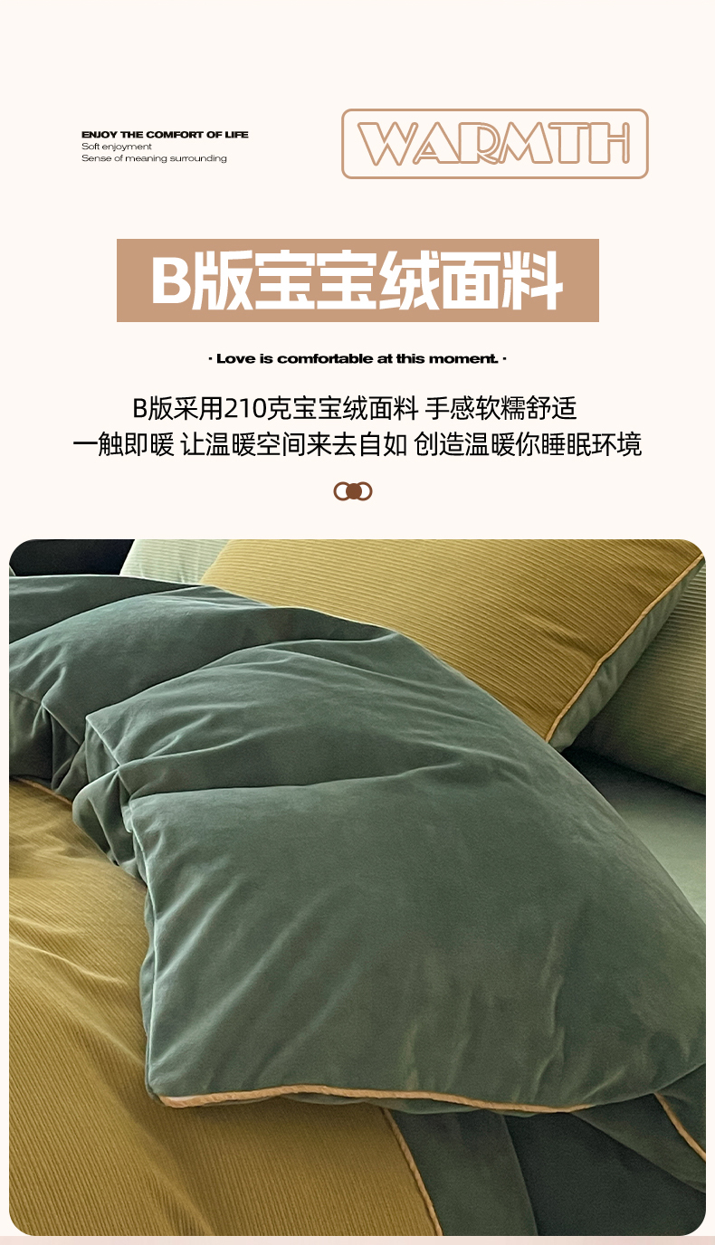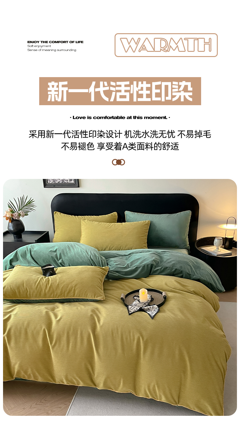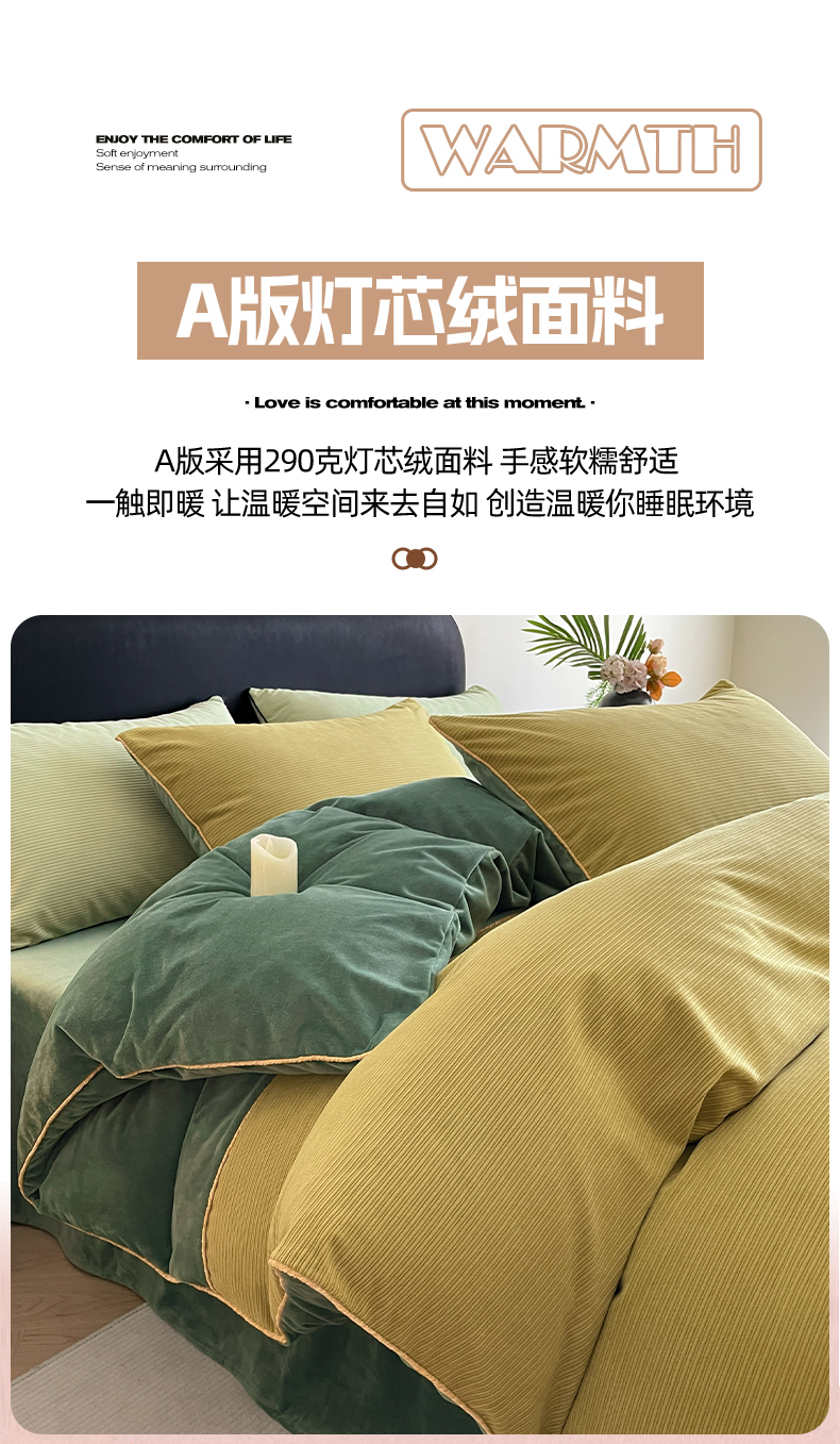 商品名称:羚羊语家纺 2025新款280克灯芯绒婴儿绒四件套高级嵌绳拼接款水晶绒宝宝绒牛奶绒床单床笠款三件套-奶芙绒系列 半糖绿洲