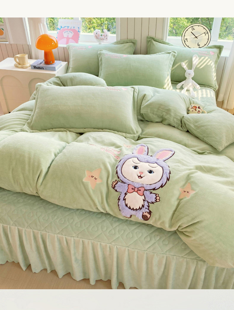 (总)悦织湾家纺 牛奶绒四件套纯色贴布绣床单款床盖款床上用品四件套时尚小兔2025新款加厚