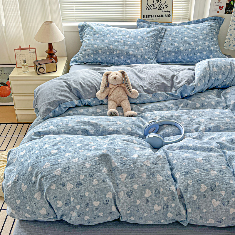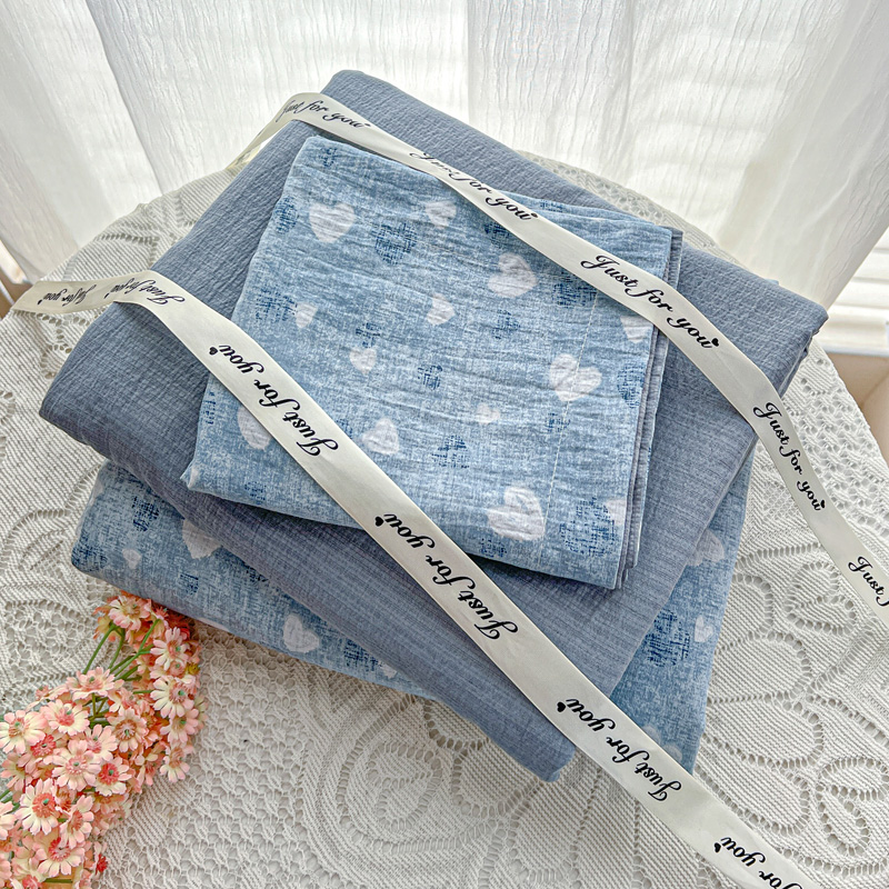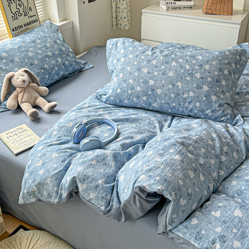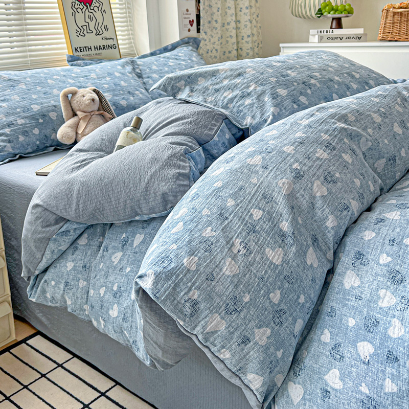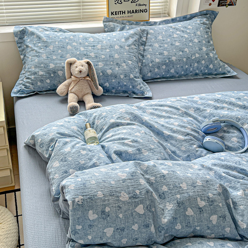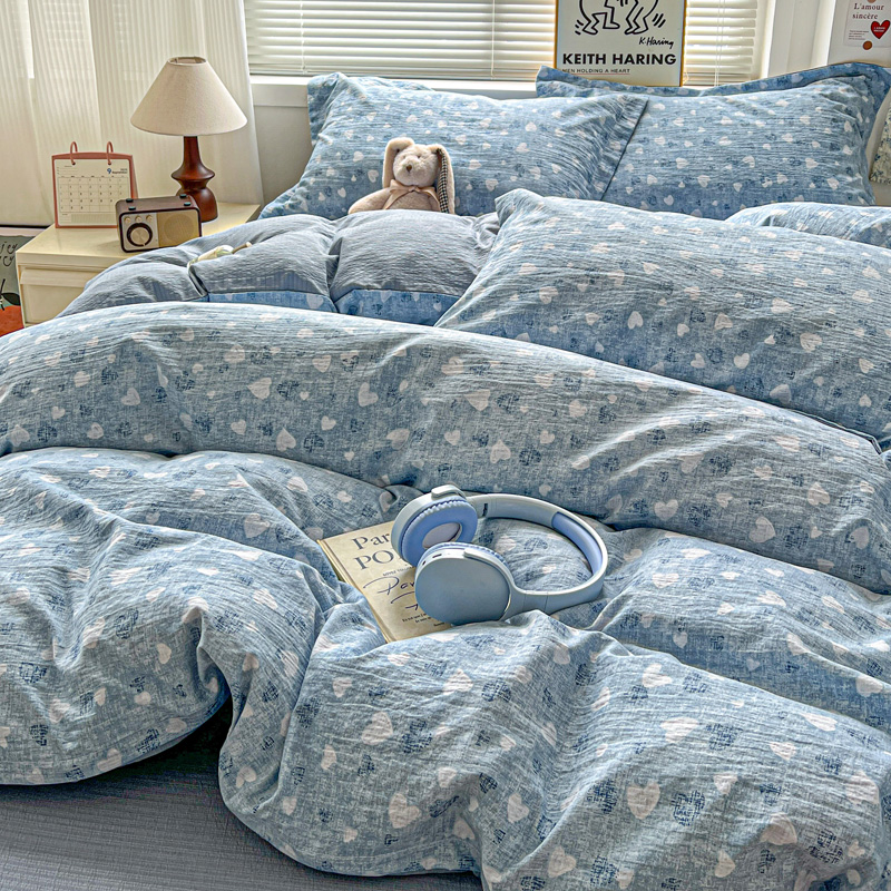 商品名称:一比一 2025新款古法水洗棉小布袋高克重云柔棉四件套 蓝爱心
