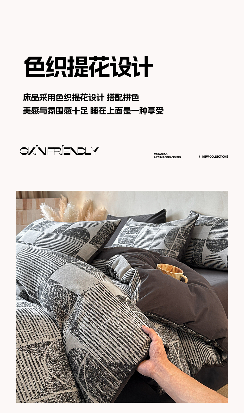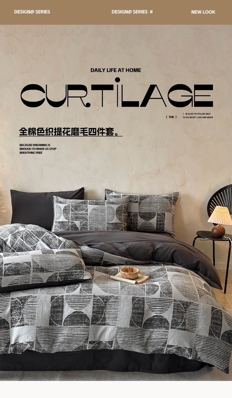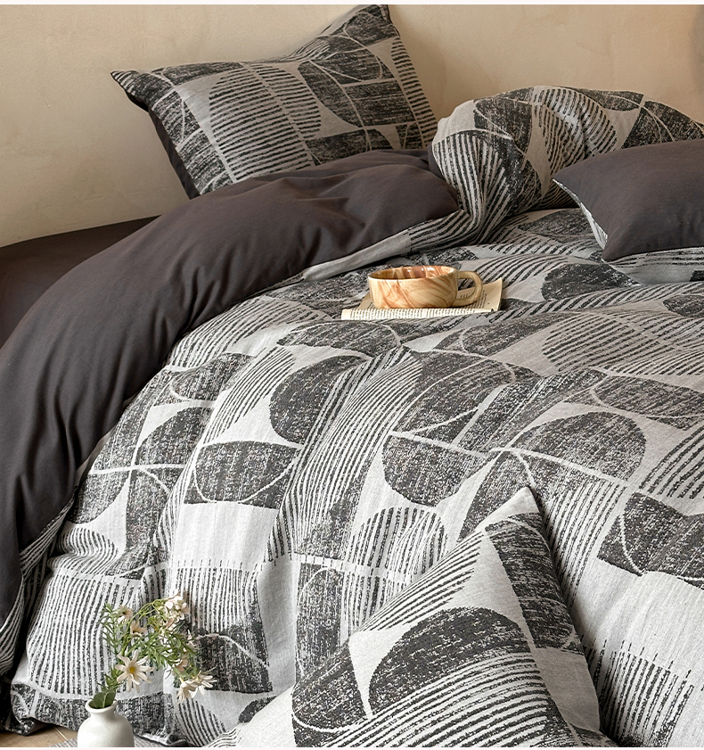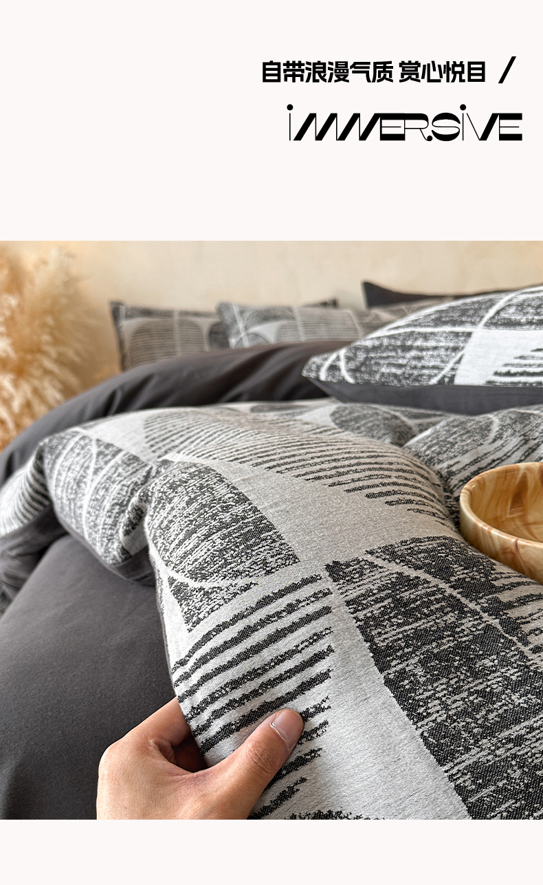 当前位置: 91家纺网 > 商品网购 > 床品套件 > 四件套 > 磨毛活性四件套 > 蓝邻家纺 2025年新款全棉色织提花磨毛四件套 梵沐-灰黑