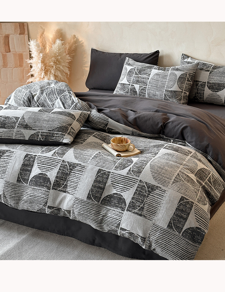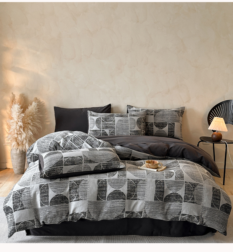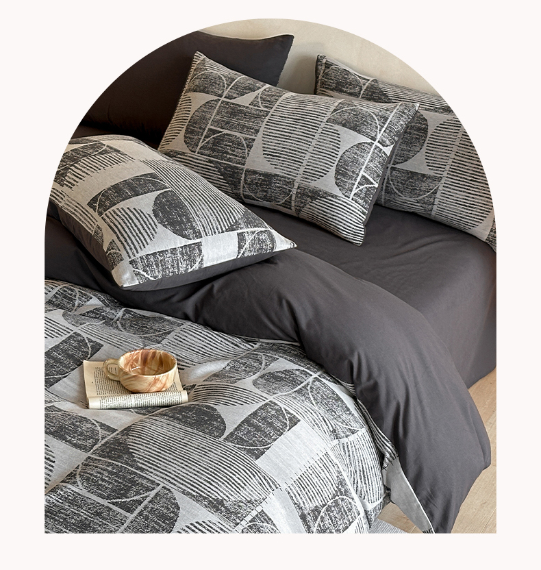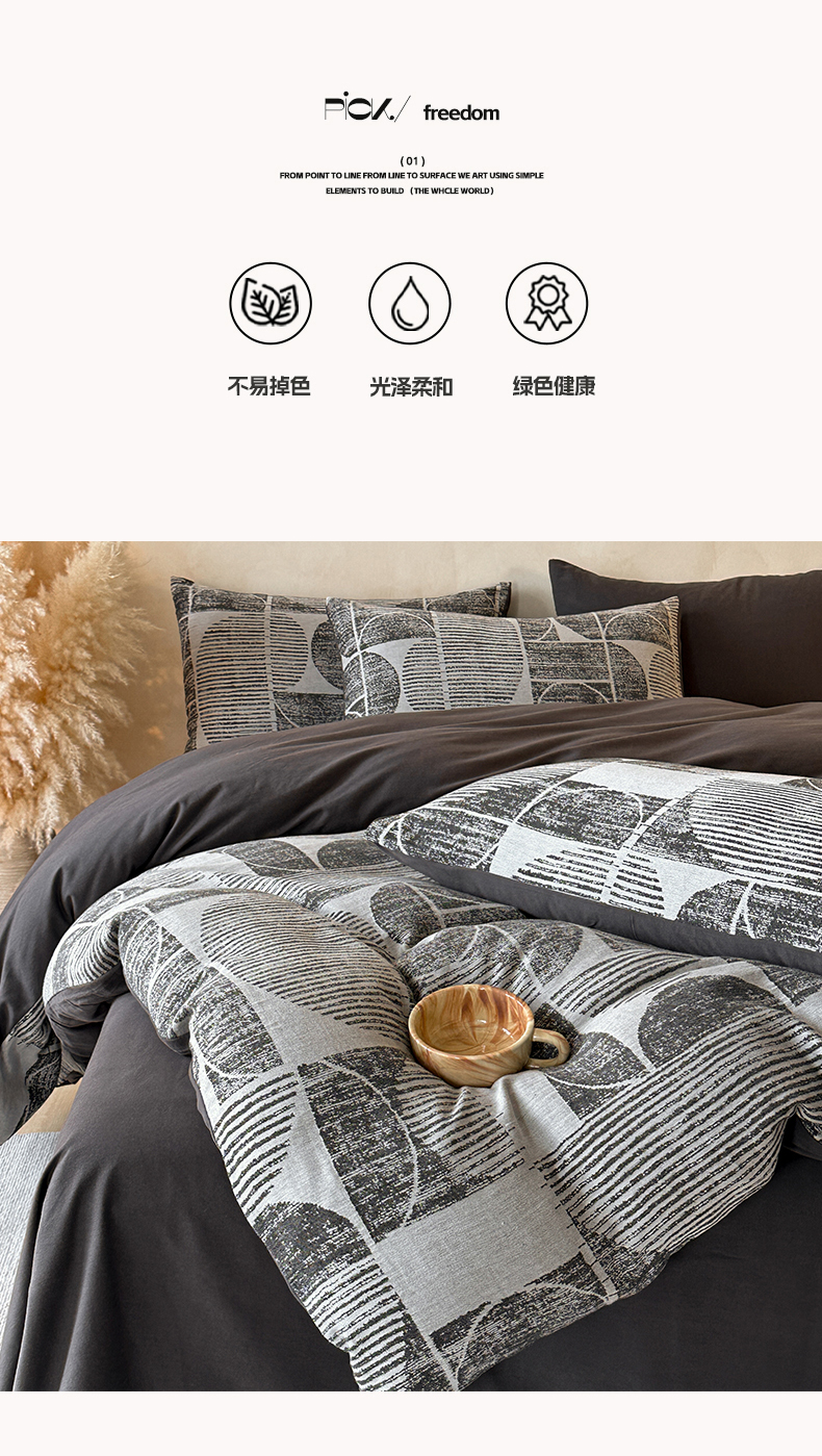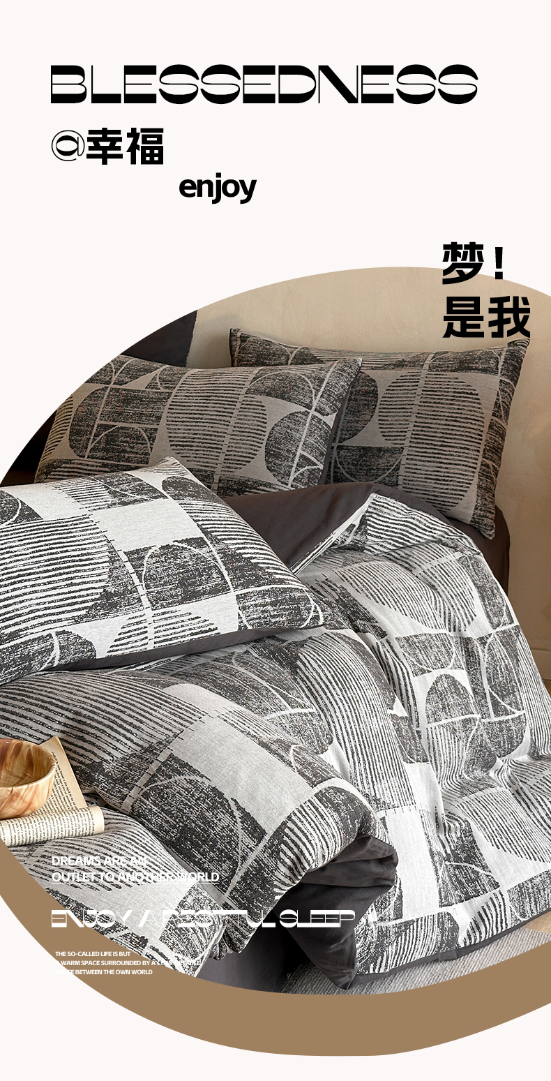 当前位置: 91家纺网 > 商品网购 > 床品套件 > 四件套 > 磨毛活性四件套 > 蓝邻家纺 2025年新款全棉色织提花磨毛四件套 梵沐-灰黑