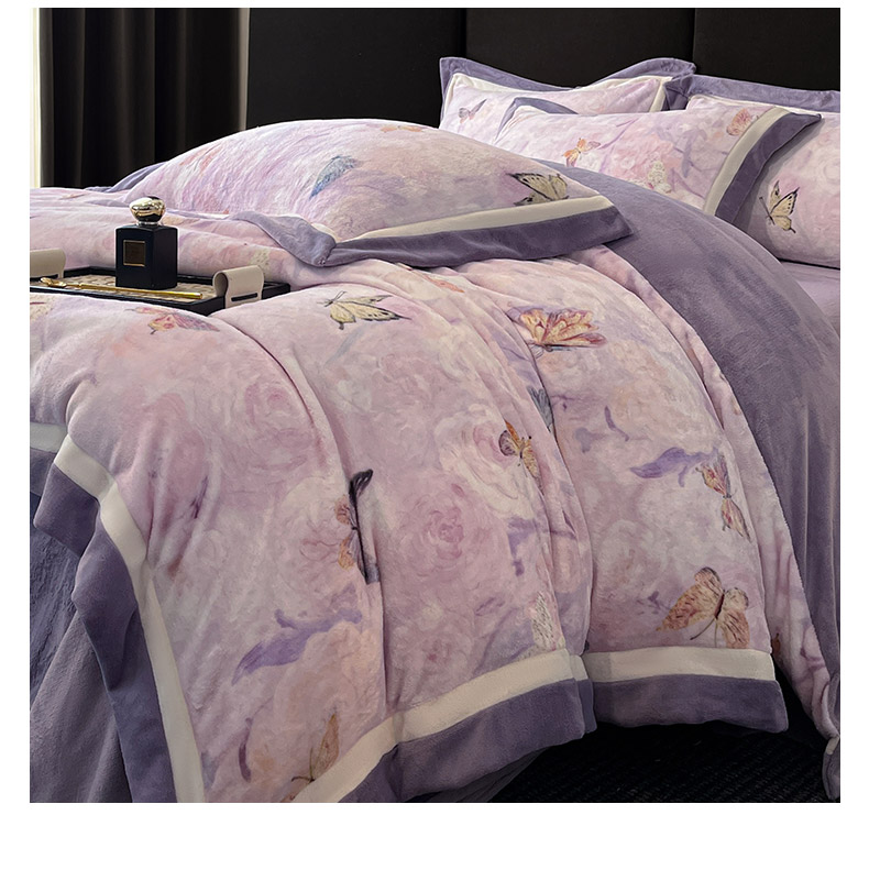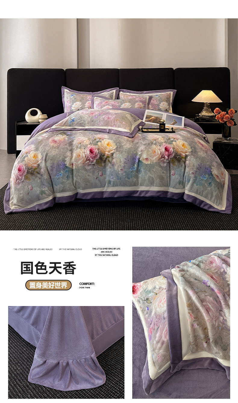 商品名称:绒城 绒城 2025新款 双拼角工艺数码牛奶绒四件套 拼角牛奶绒四件套-芳华系列 熏衣草