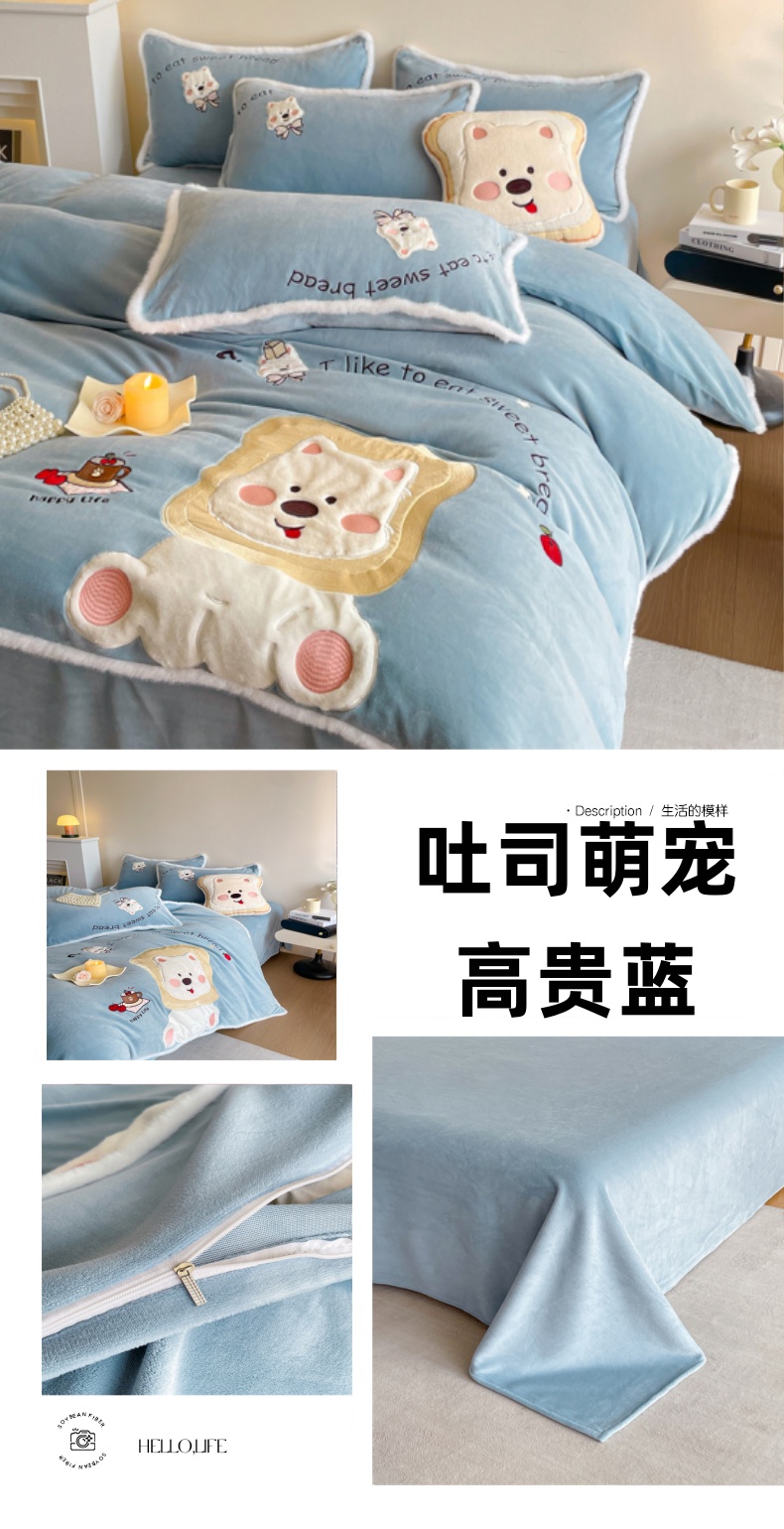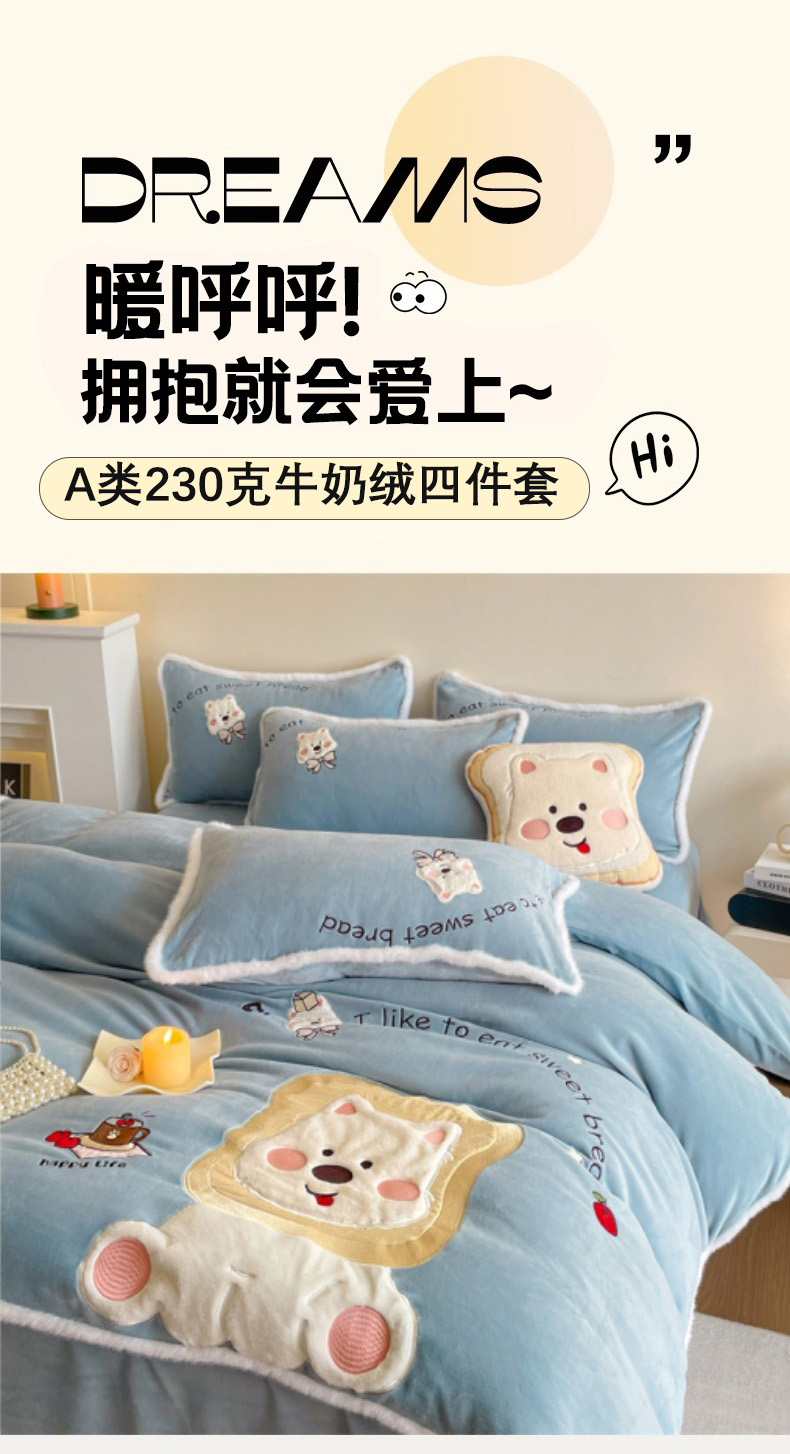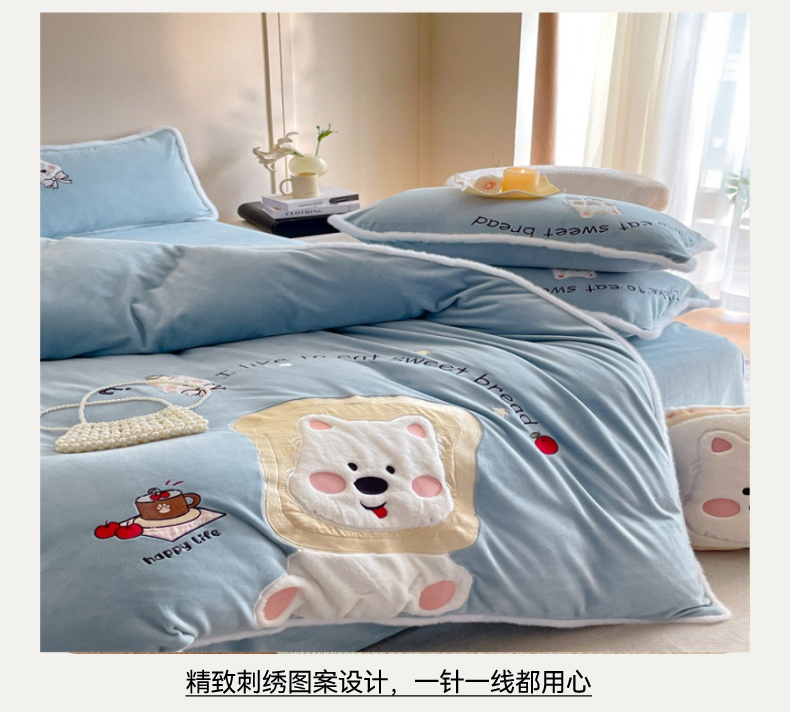 商品名称:梦舒羽 2025新款A类230克全消光刺绣贴布牛奶绒四件套学生宿舍床单款床上用品套件 吐司萌宠-高贵蓝