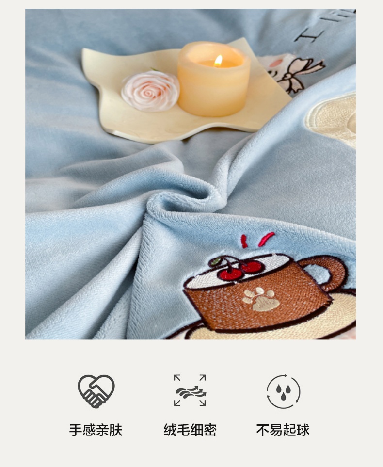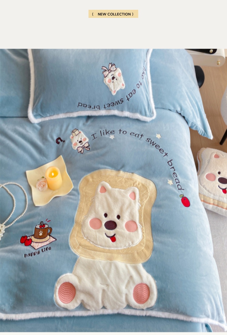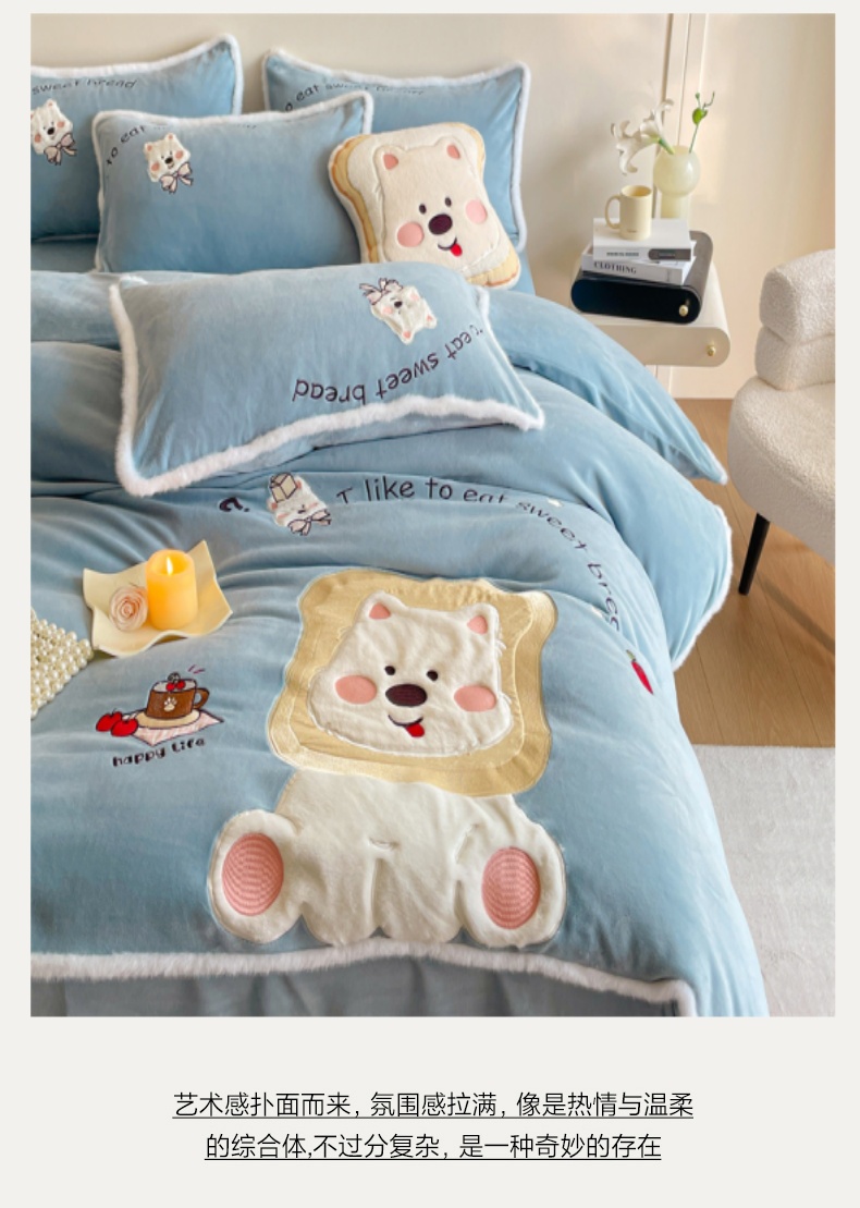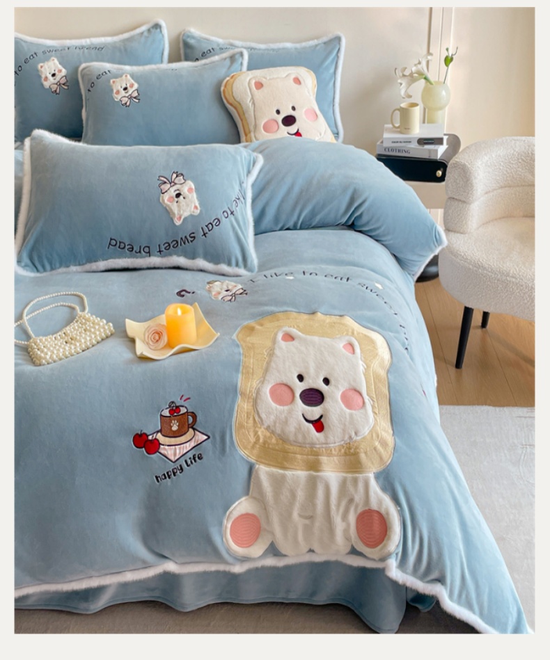 商品名称:梦舒羽 2025新款A类230克全消光刺绣贴布牛奶绒四件套学生宿舍床单款床上用品套件 吐司萌宠-高贵蓝