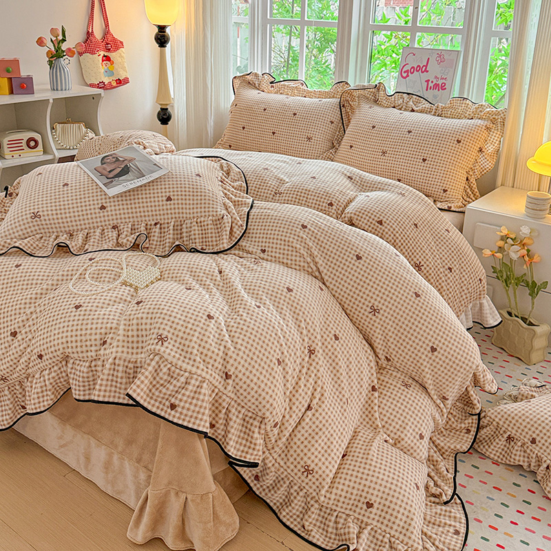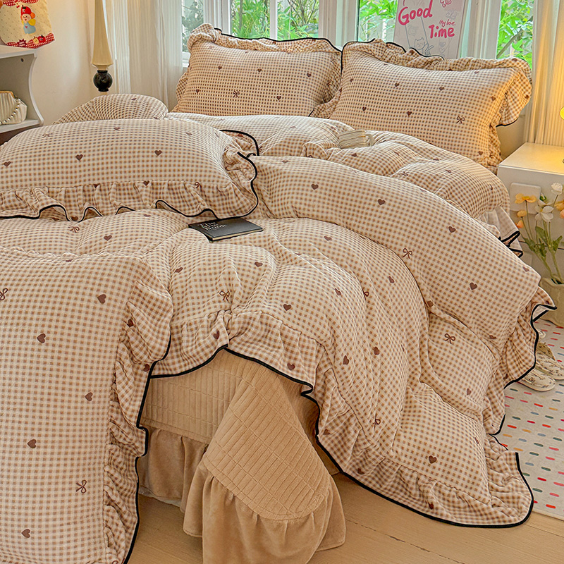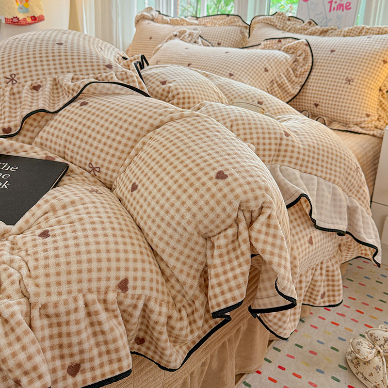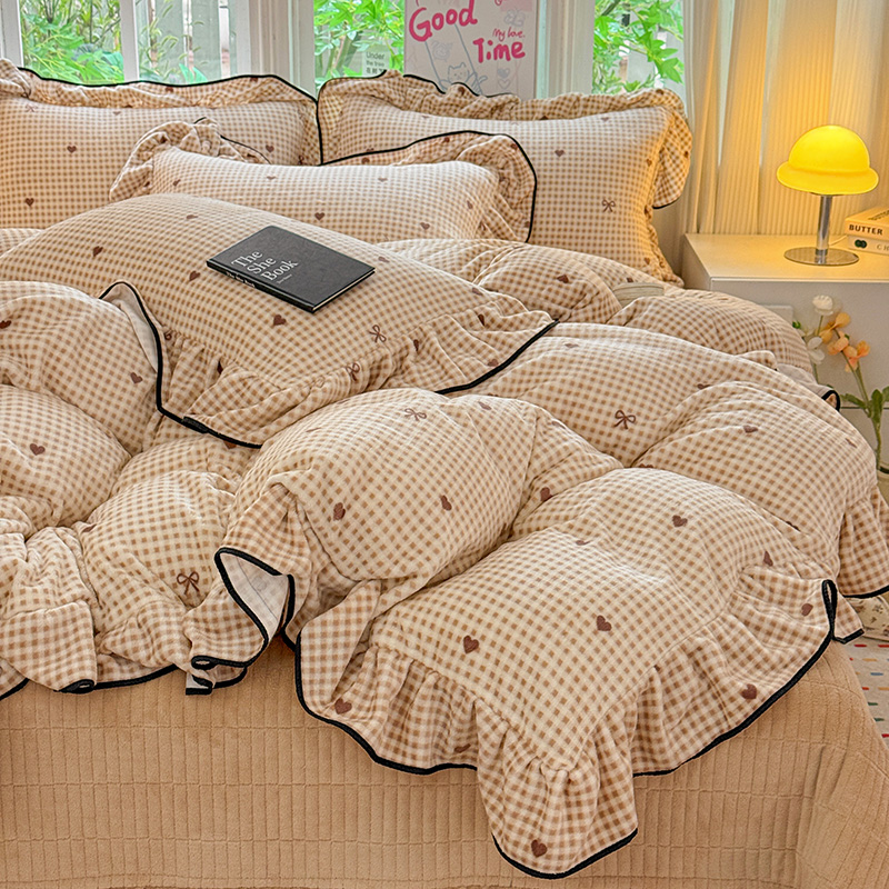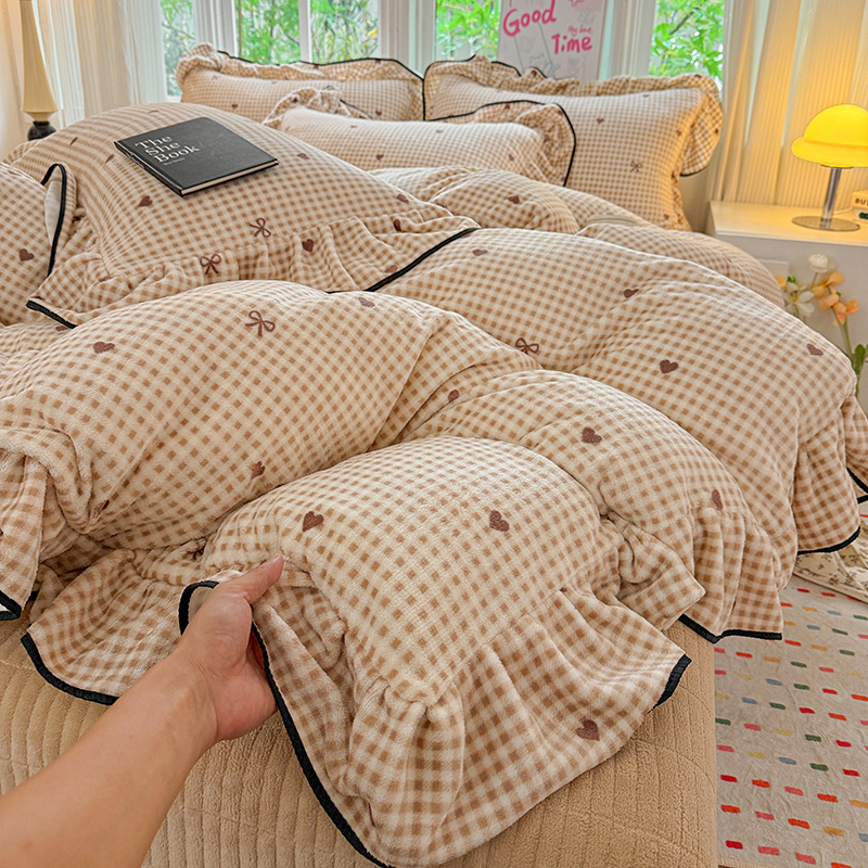梦莱斯 2025新款加厚保暖双面牛奶绒四件套-黑色花边款 格子爱心咖
