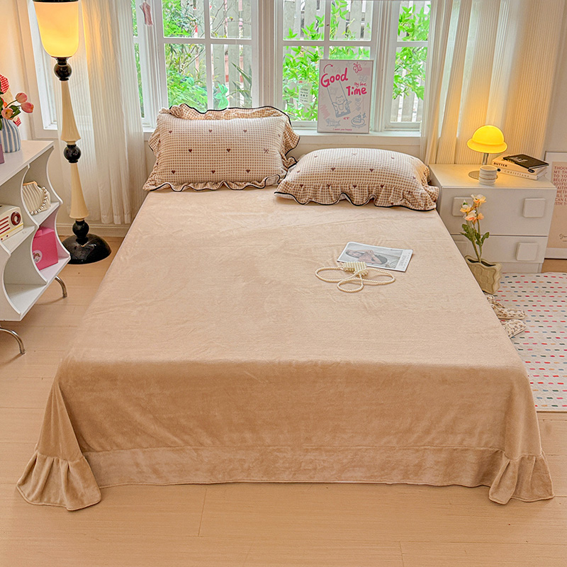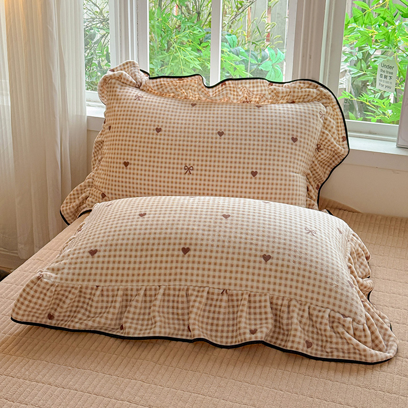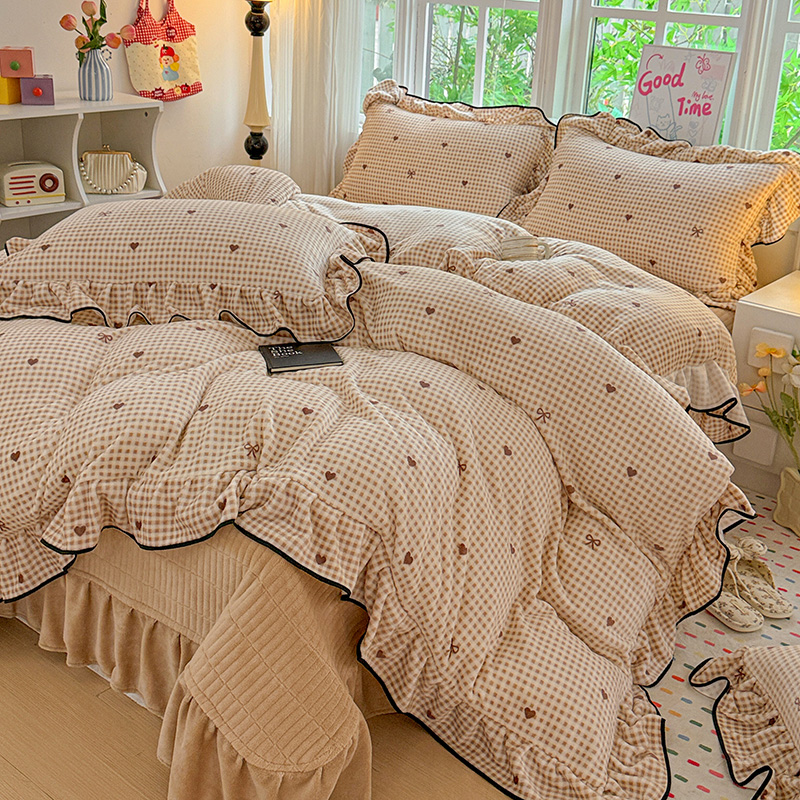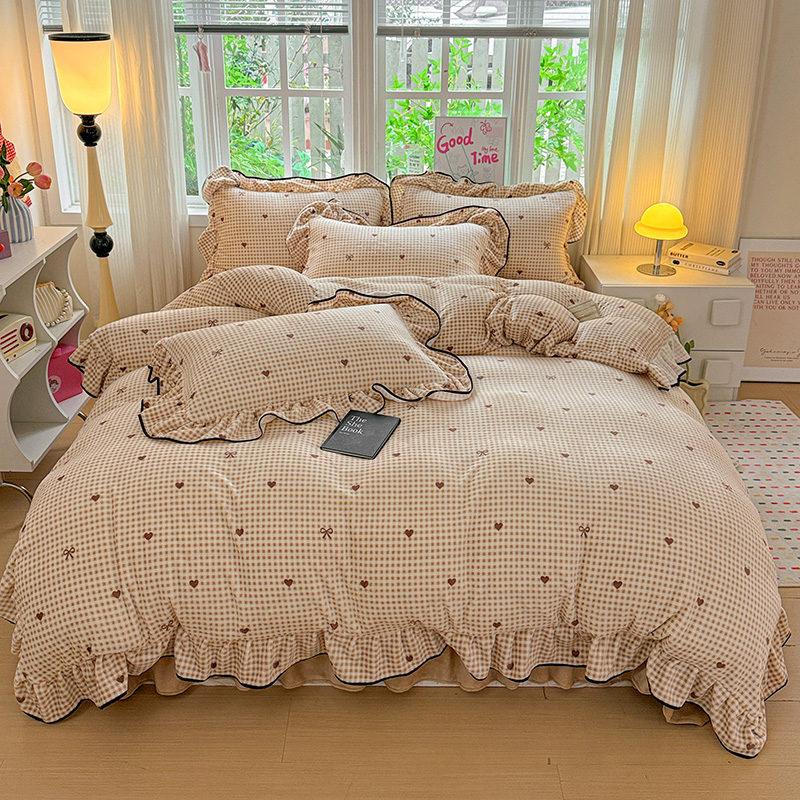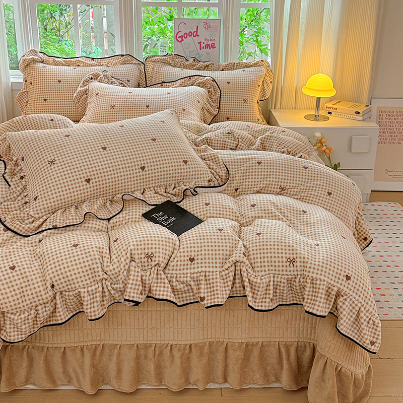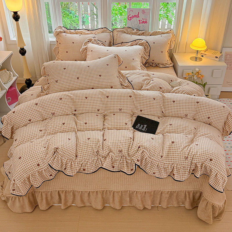 梦莱斯 2025新款加厚保暖双面牛奶绒四件套-黑色花边款 格子爱心咖