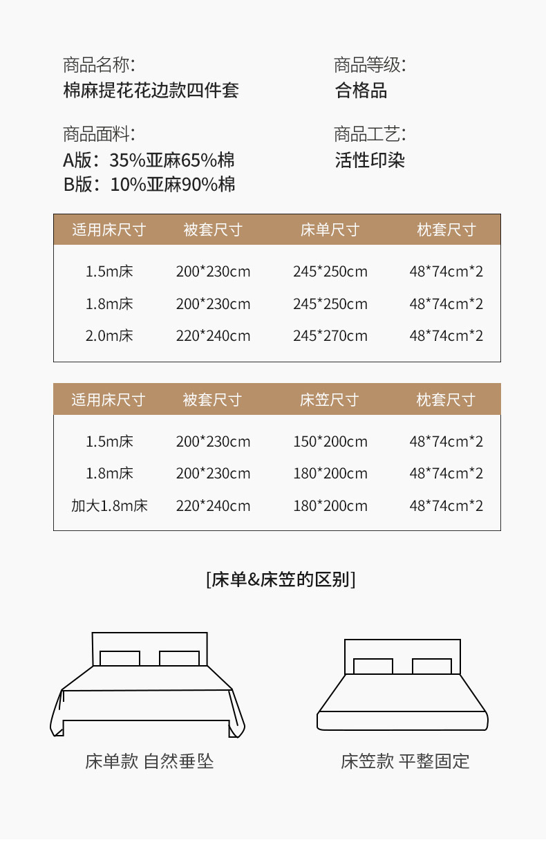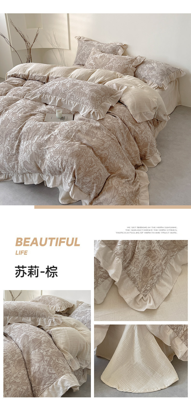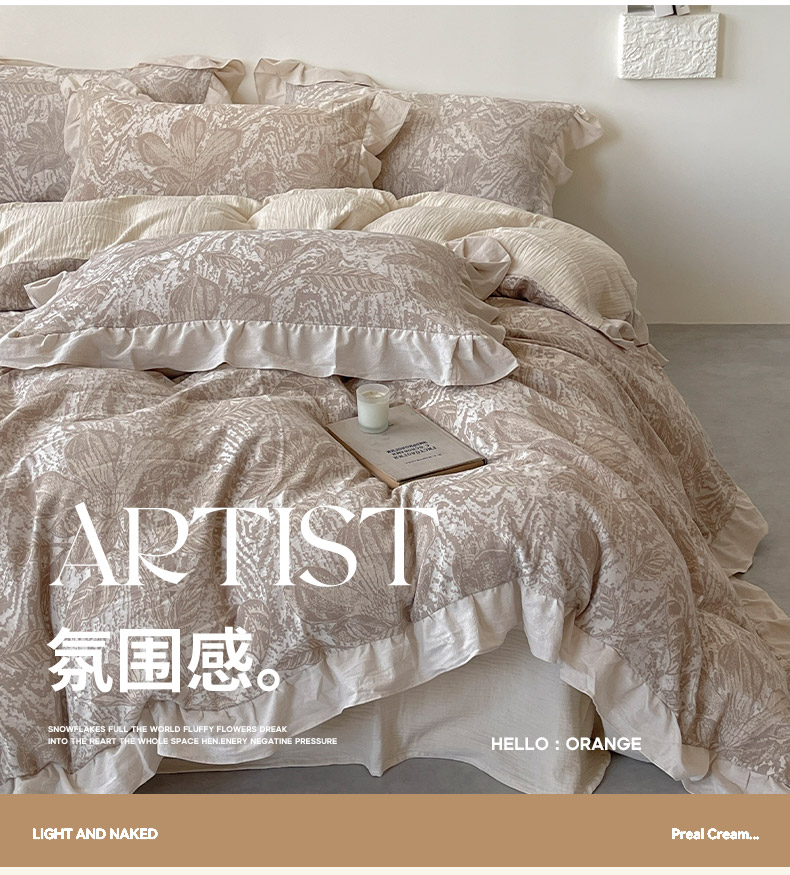 商品名称:法式提花棉麻四件套纯棉全棉复古风花边素色亚麻高端超柔透气高档床上用品 苏莉-棕