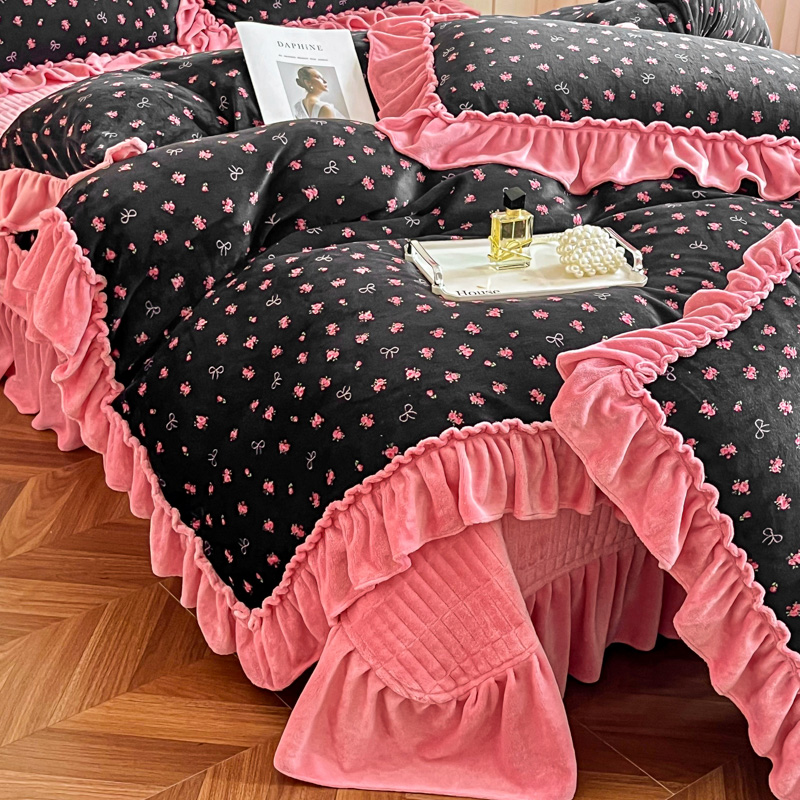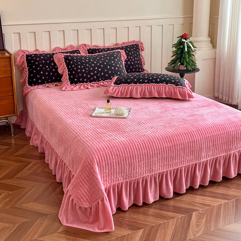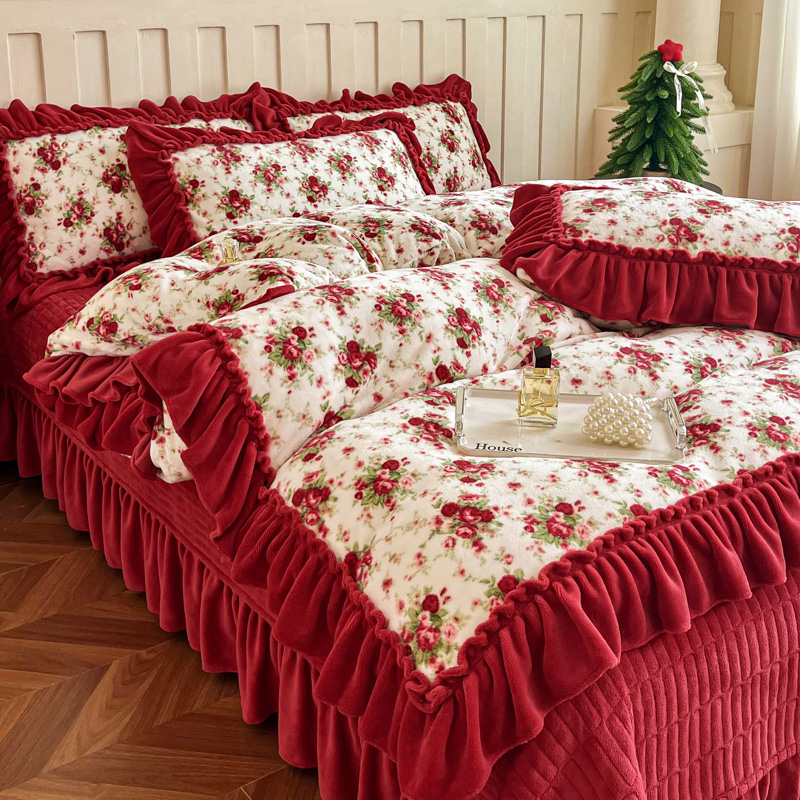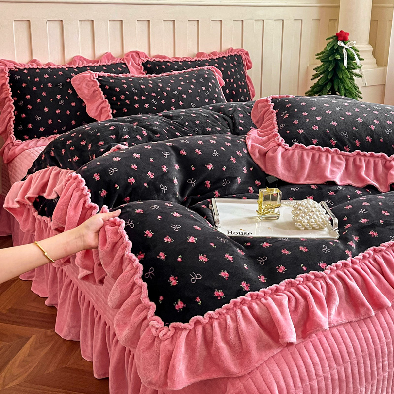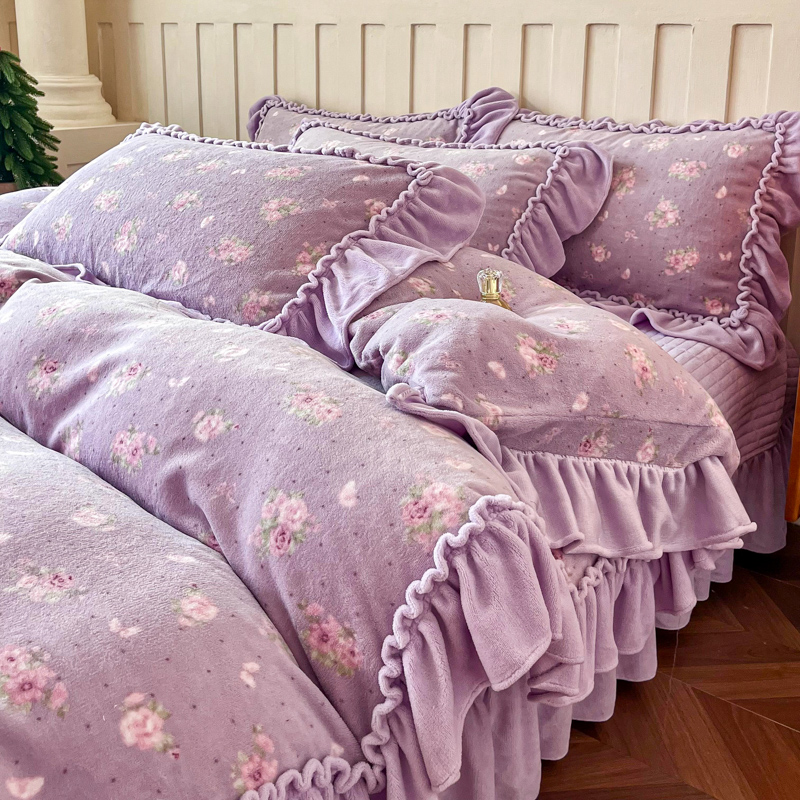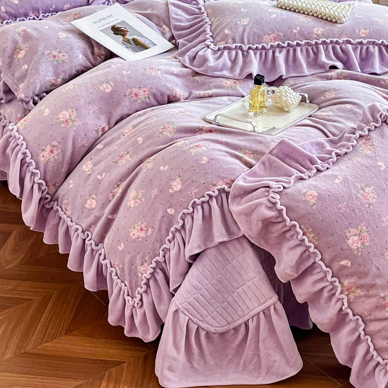 (总)梦可莱家居 2025冬季新款复古风印花牛奶绒大花边床盖四件套