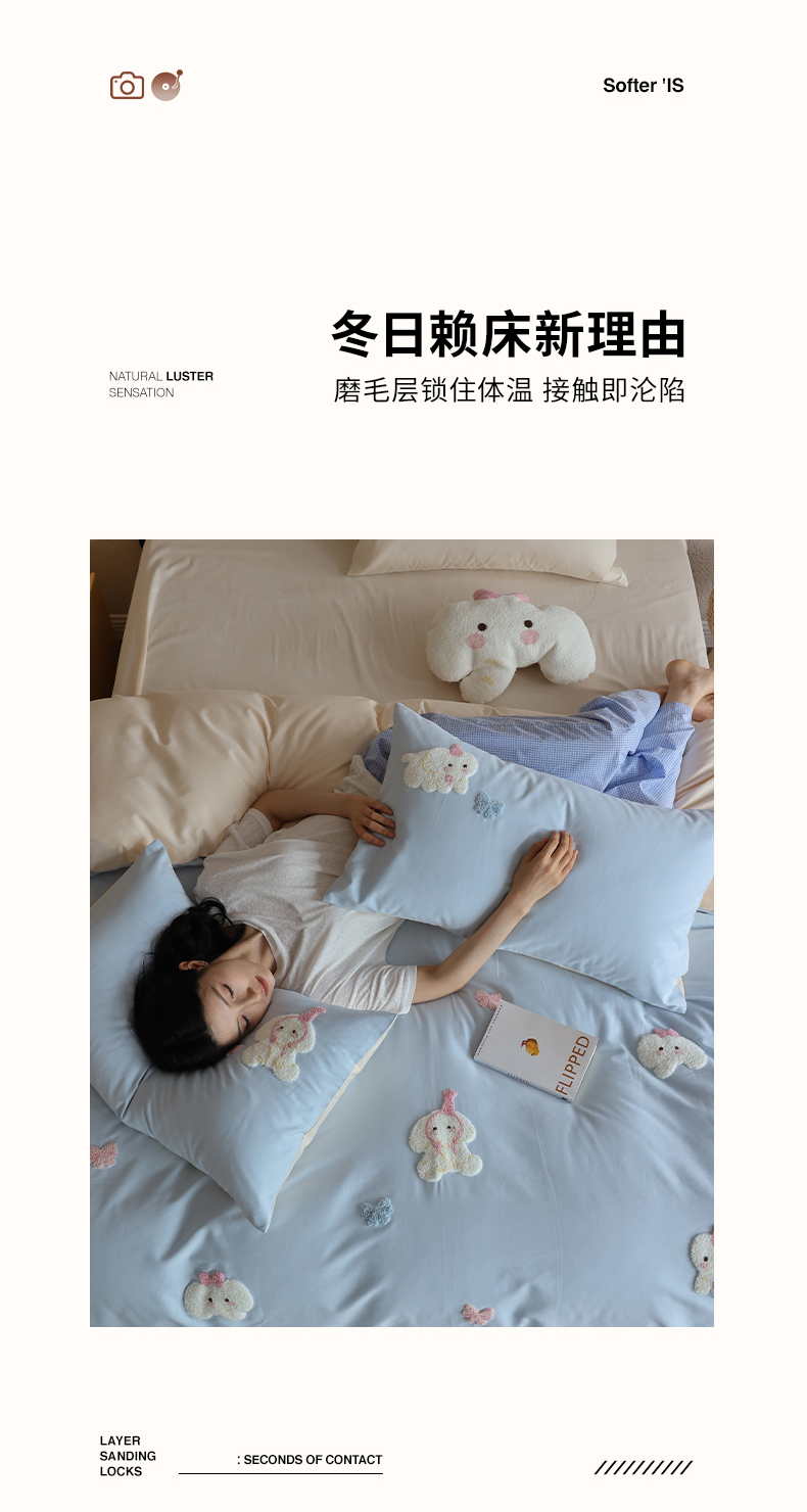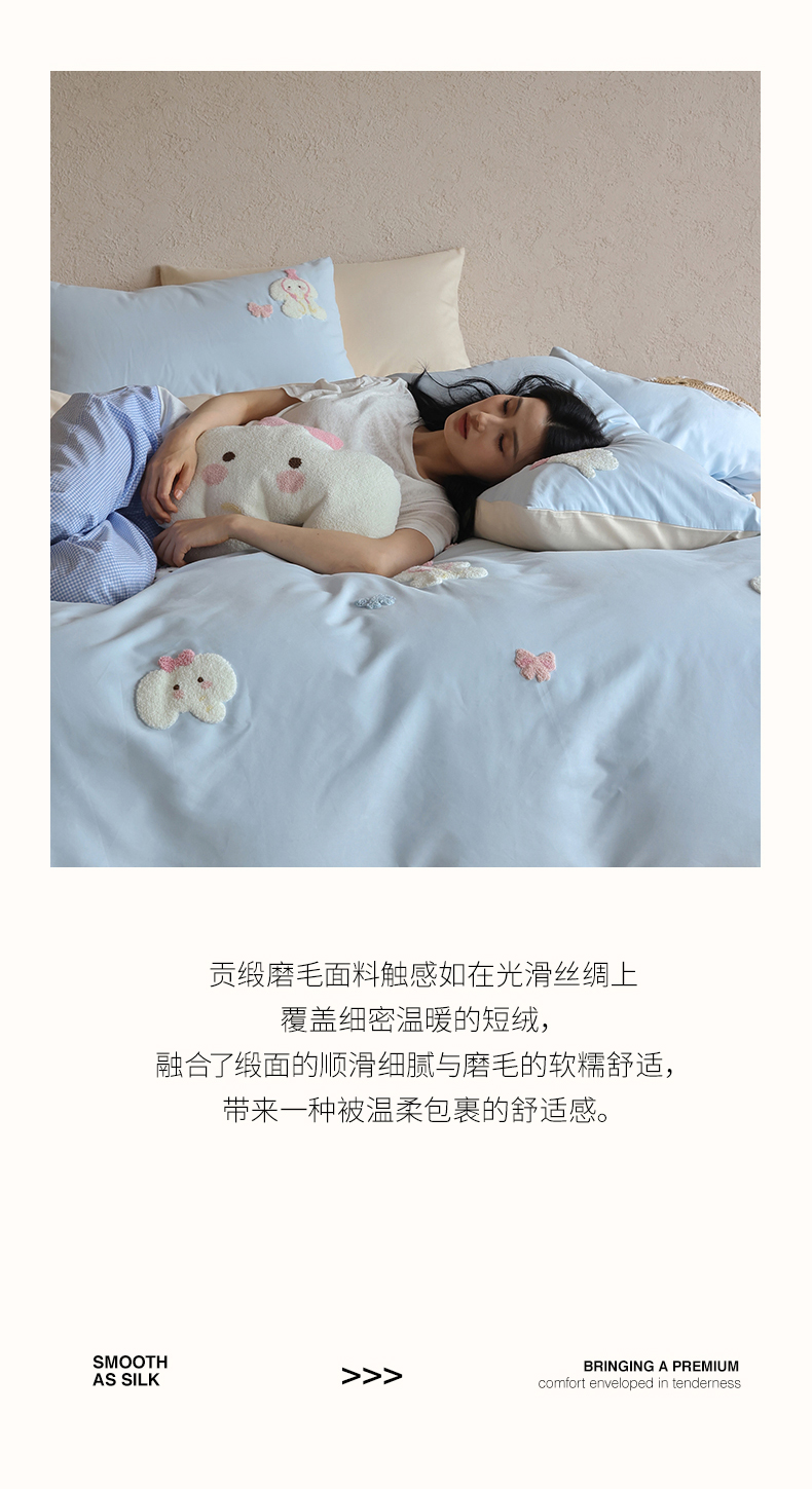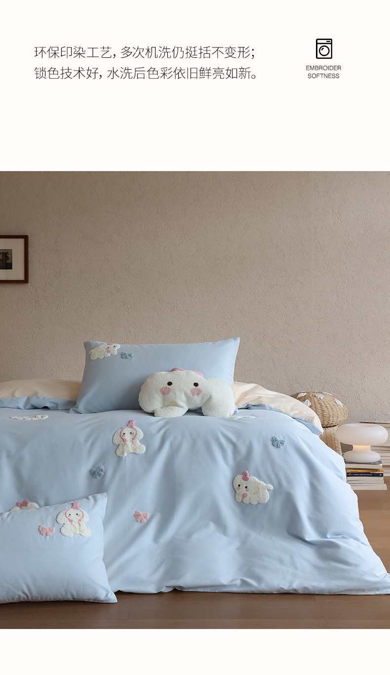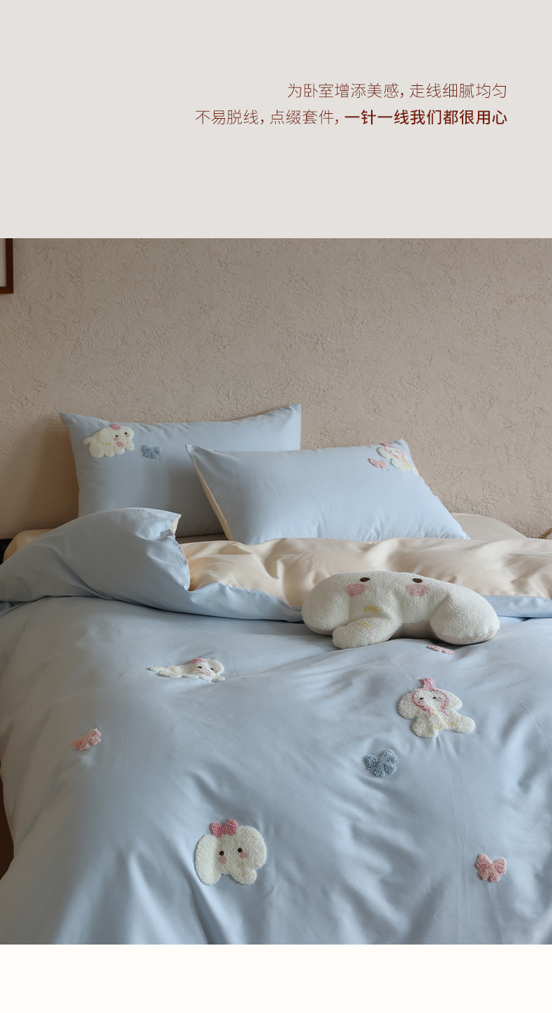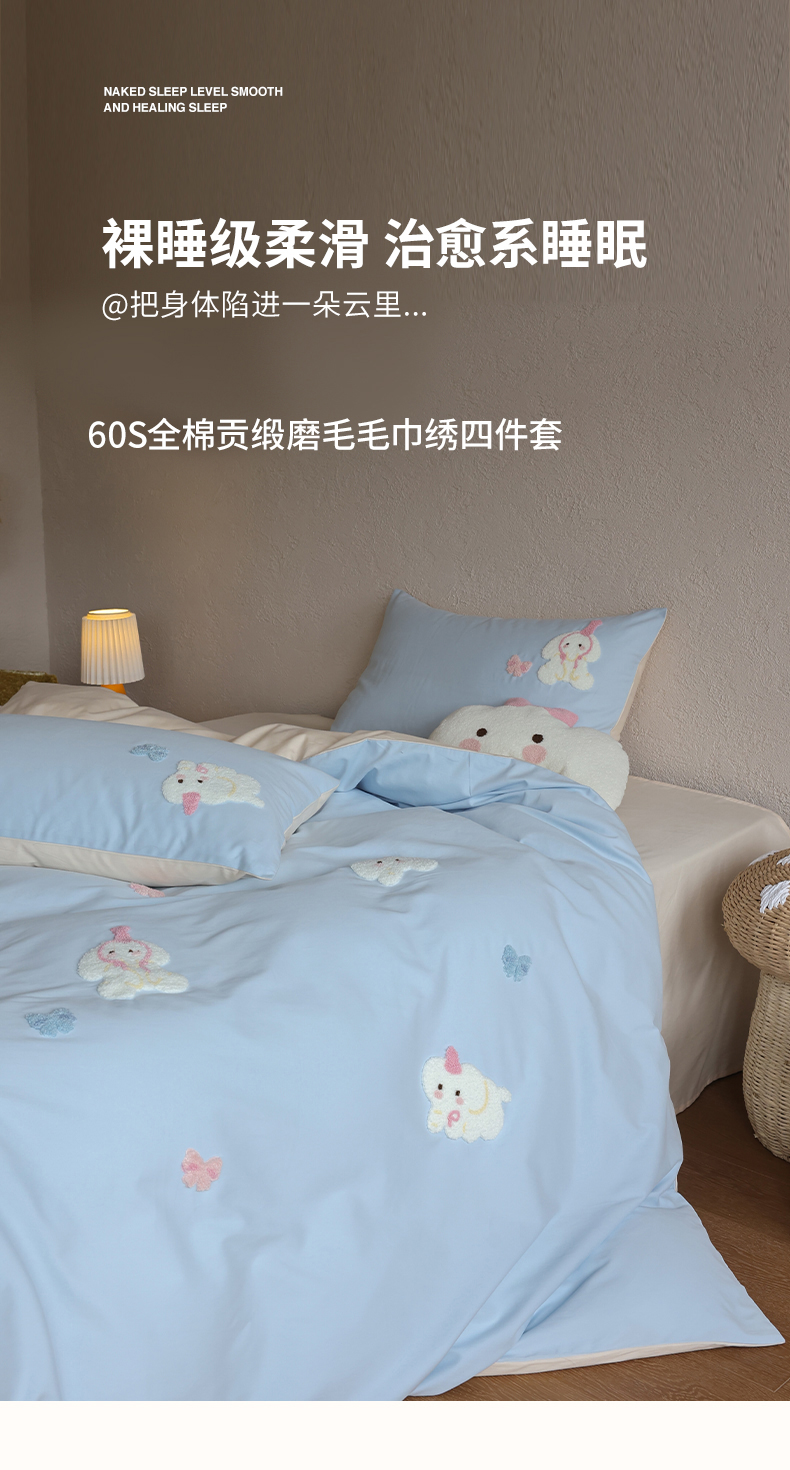 当前位置: 91家纺网 > 商品网购 > 床品套件 > 四件套 > 普通磨毛四件套 > 安莱生活 2025新款贡缎磨毛60s绣花四件套-风格二 蓝粉小象