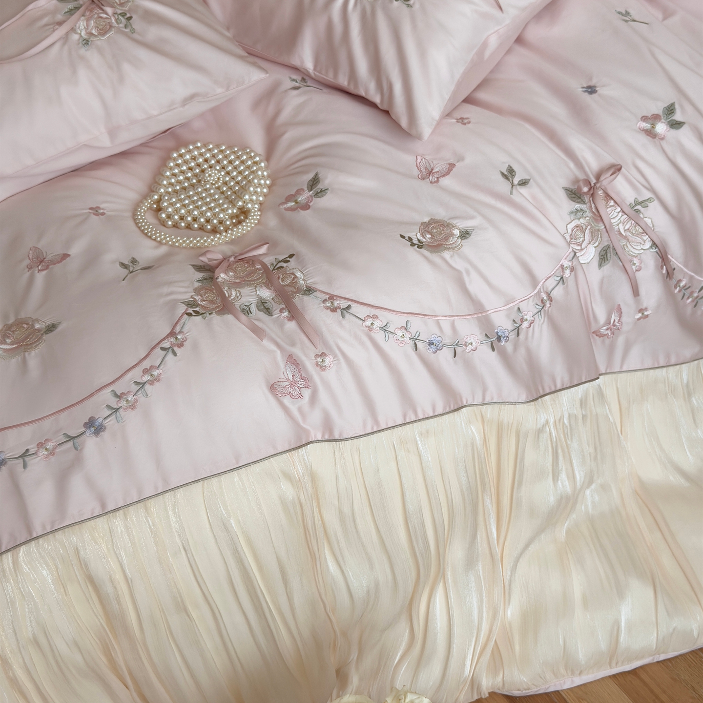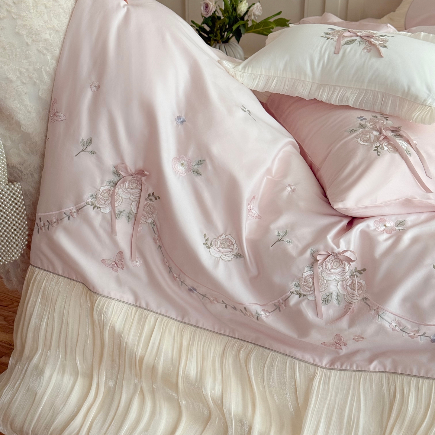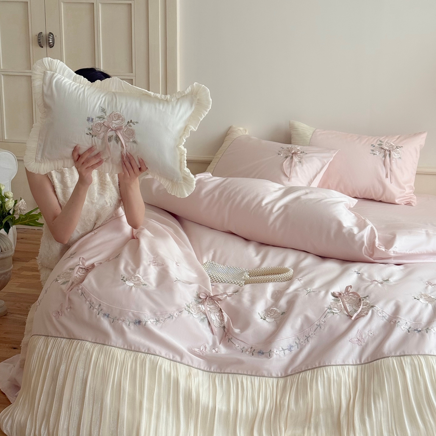 (总)嗨购 2022新款40支水洗棉刺绣花边四件套-春日秋千,春日秋千-粉,春日秋千-绿