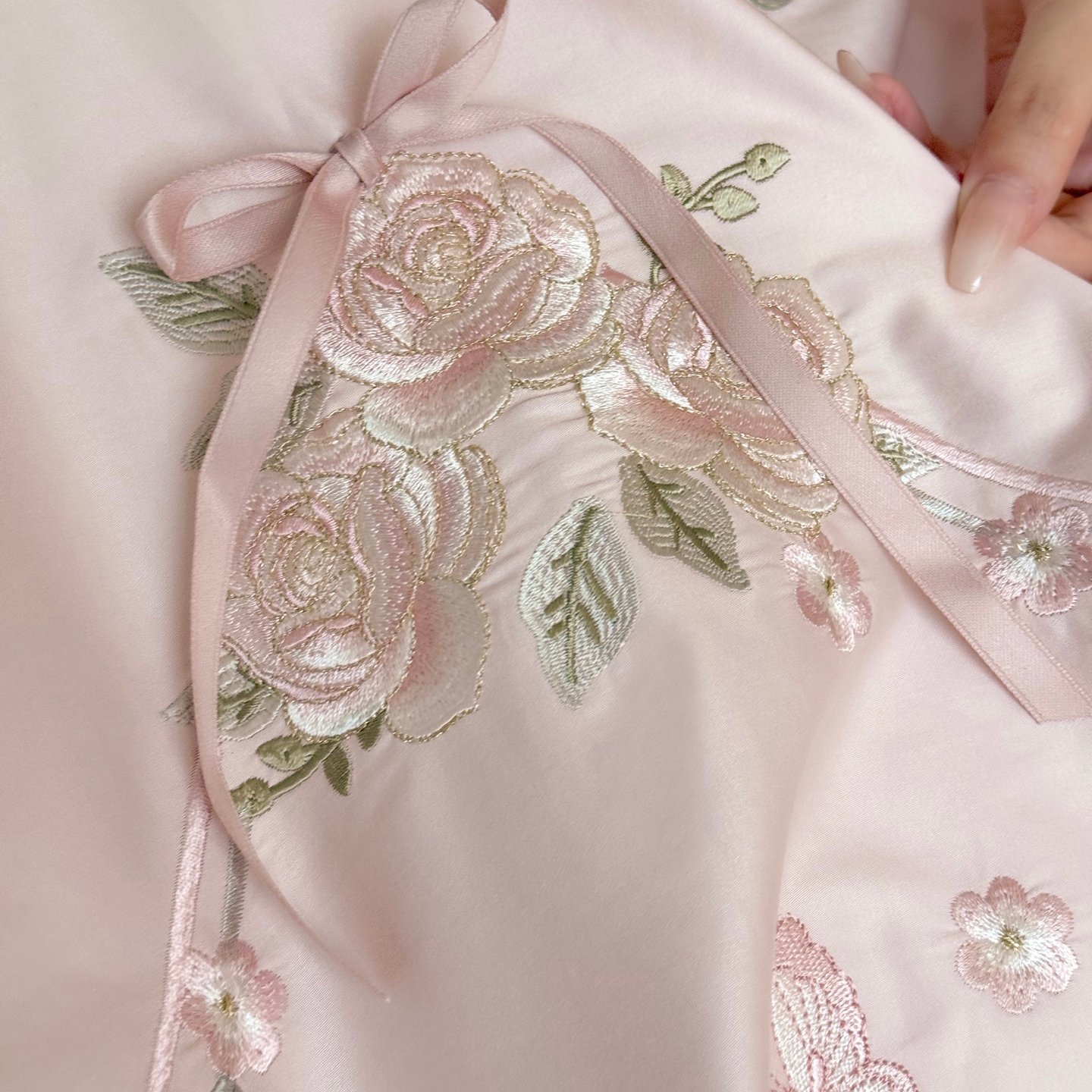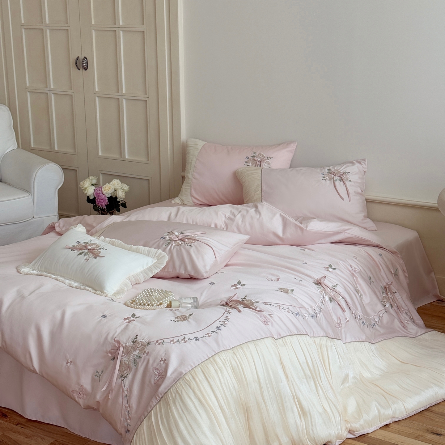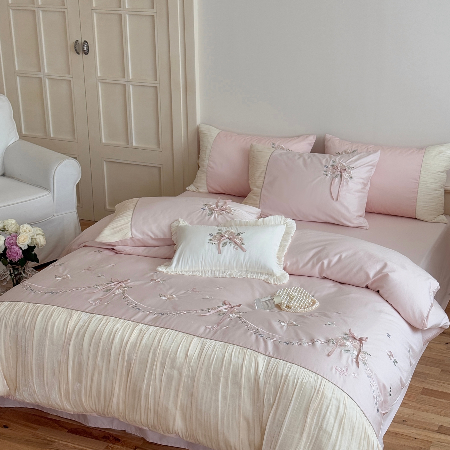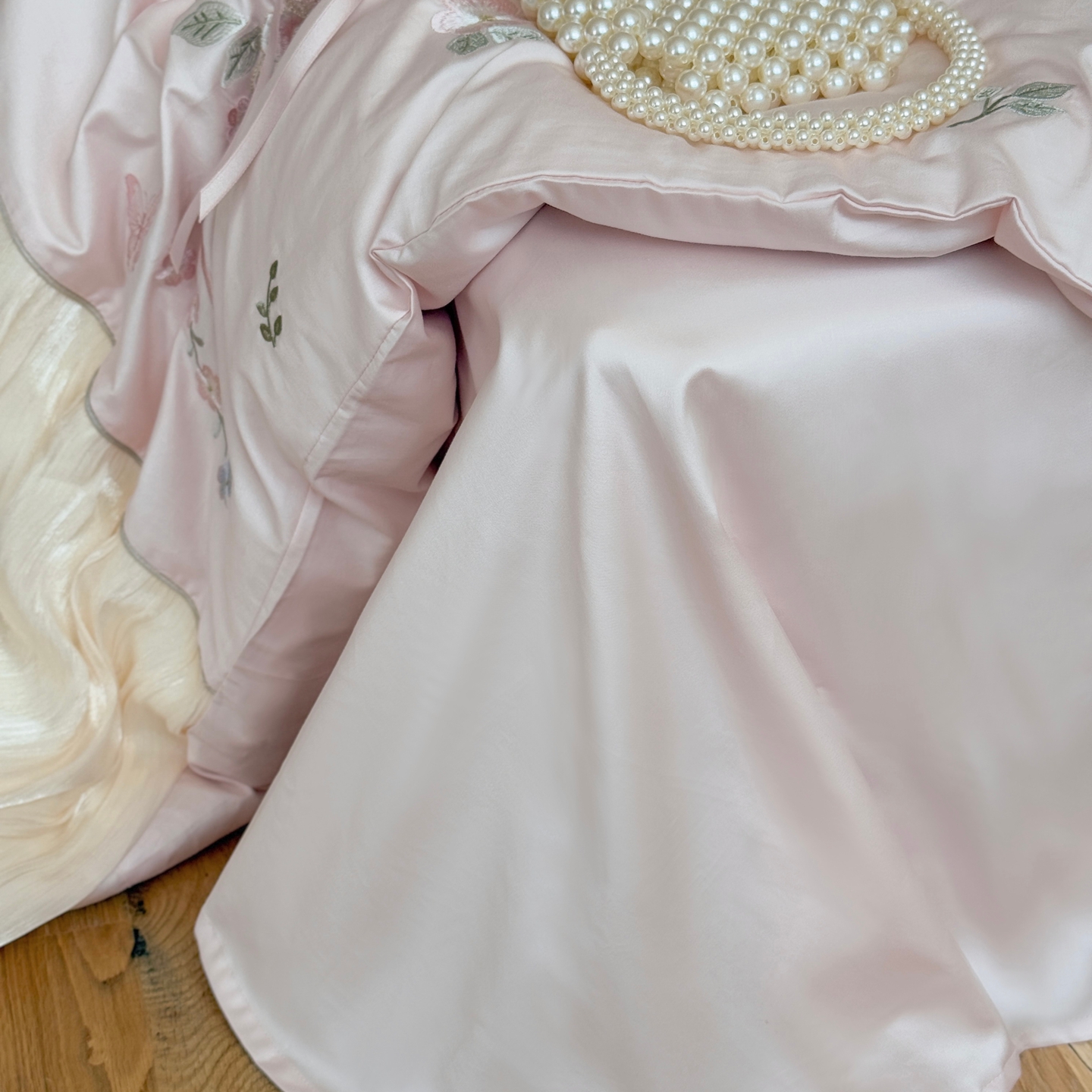 (总)嗨购 2022新款40支水洗棉刺绣花边四件套-春日秋千,春日秋千-粉,春日秋千-绿