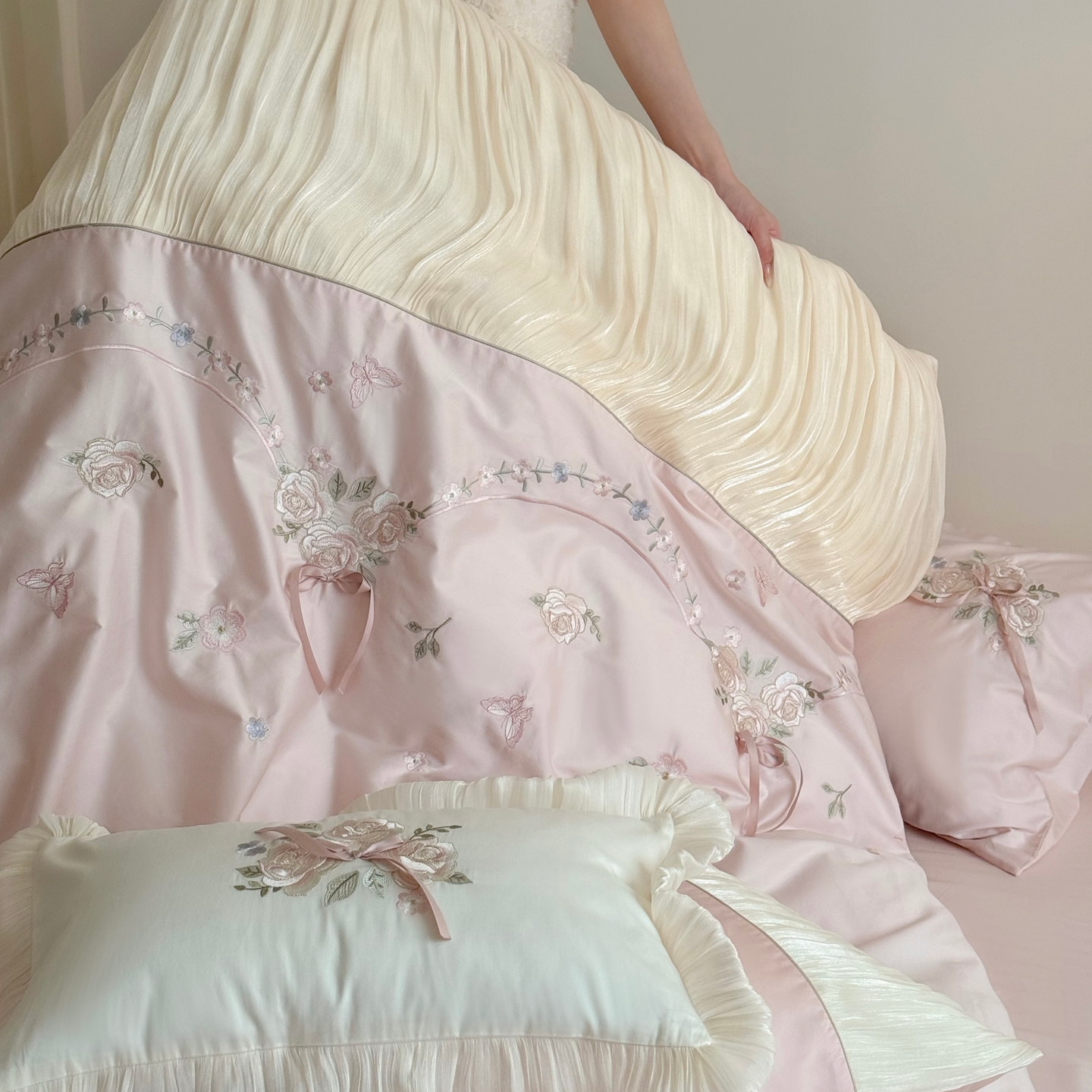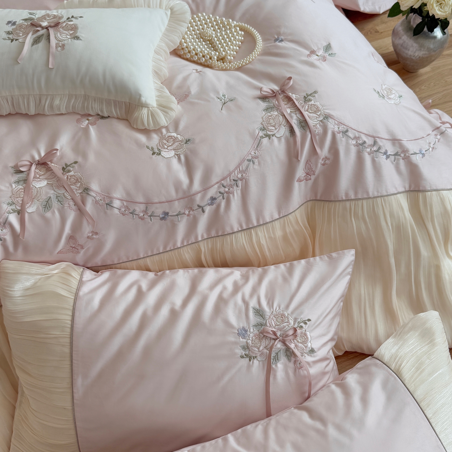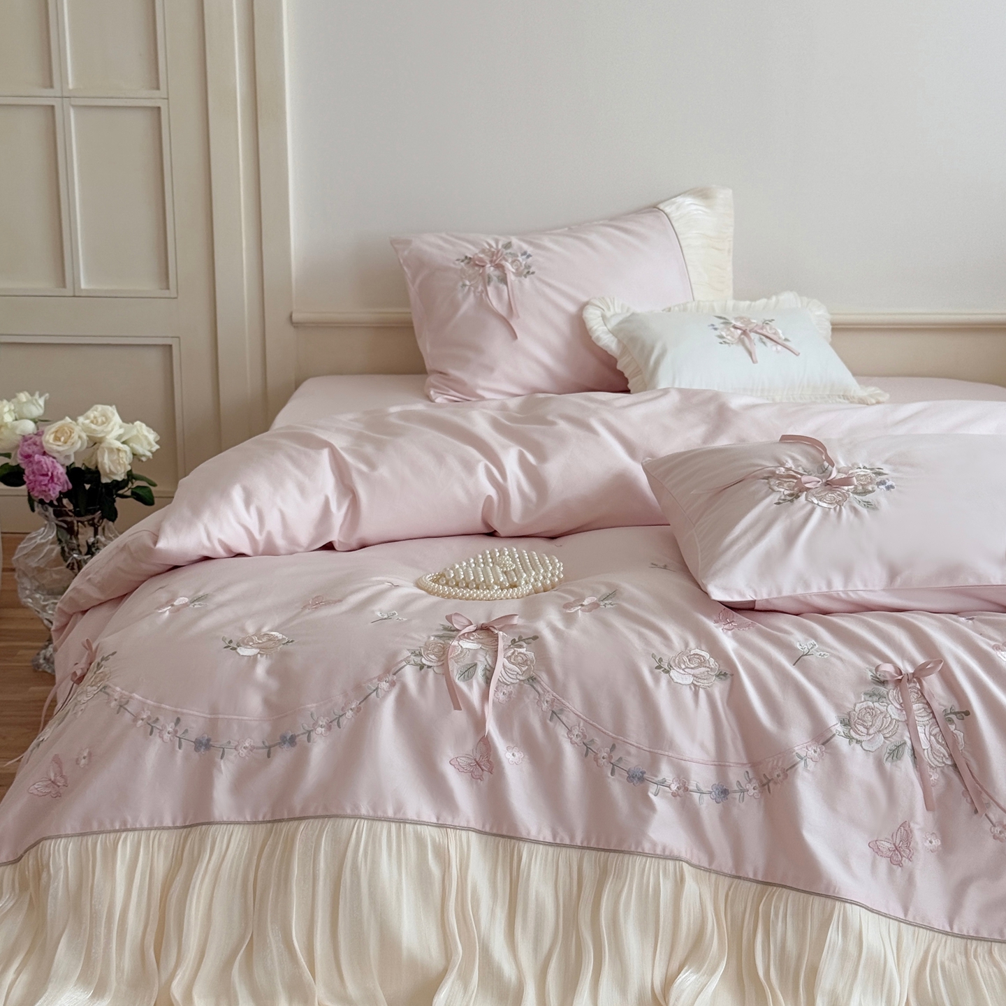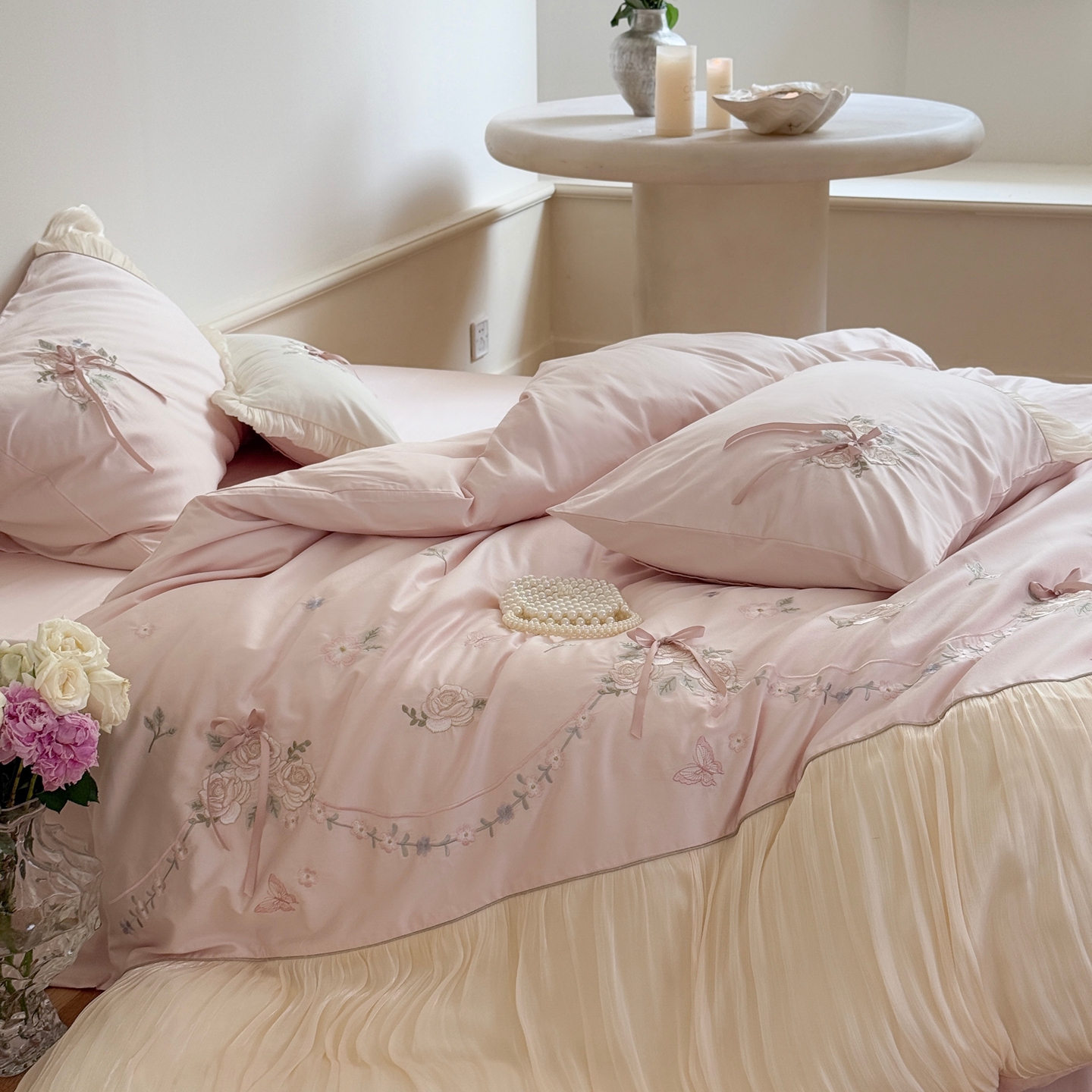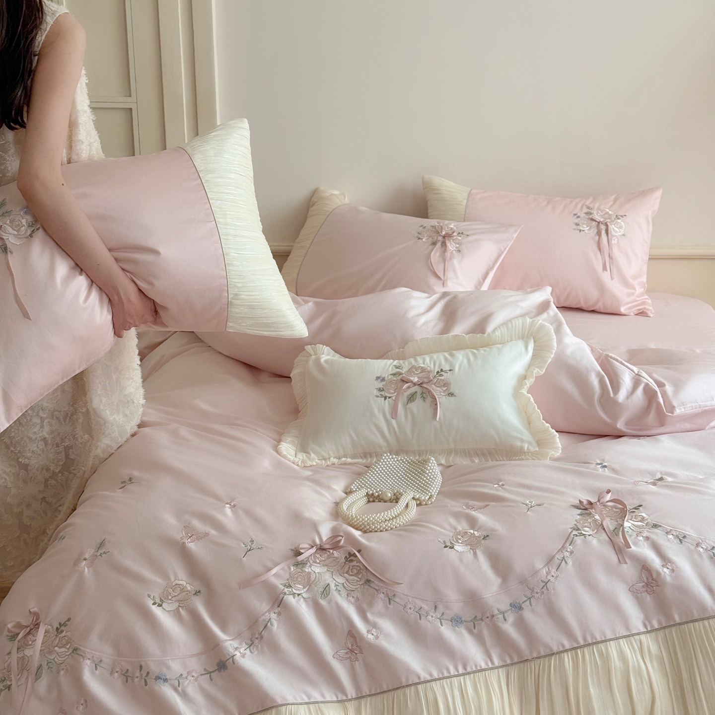 (总)嗨购 2022新款40支水洗棉刺绣花边四件套-阳光玫瑰,阳光玫瑰-粉,阳光玫瑰-黄,阳光玫瑰-蓝