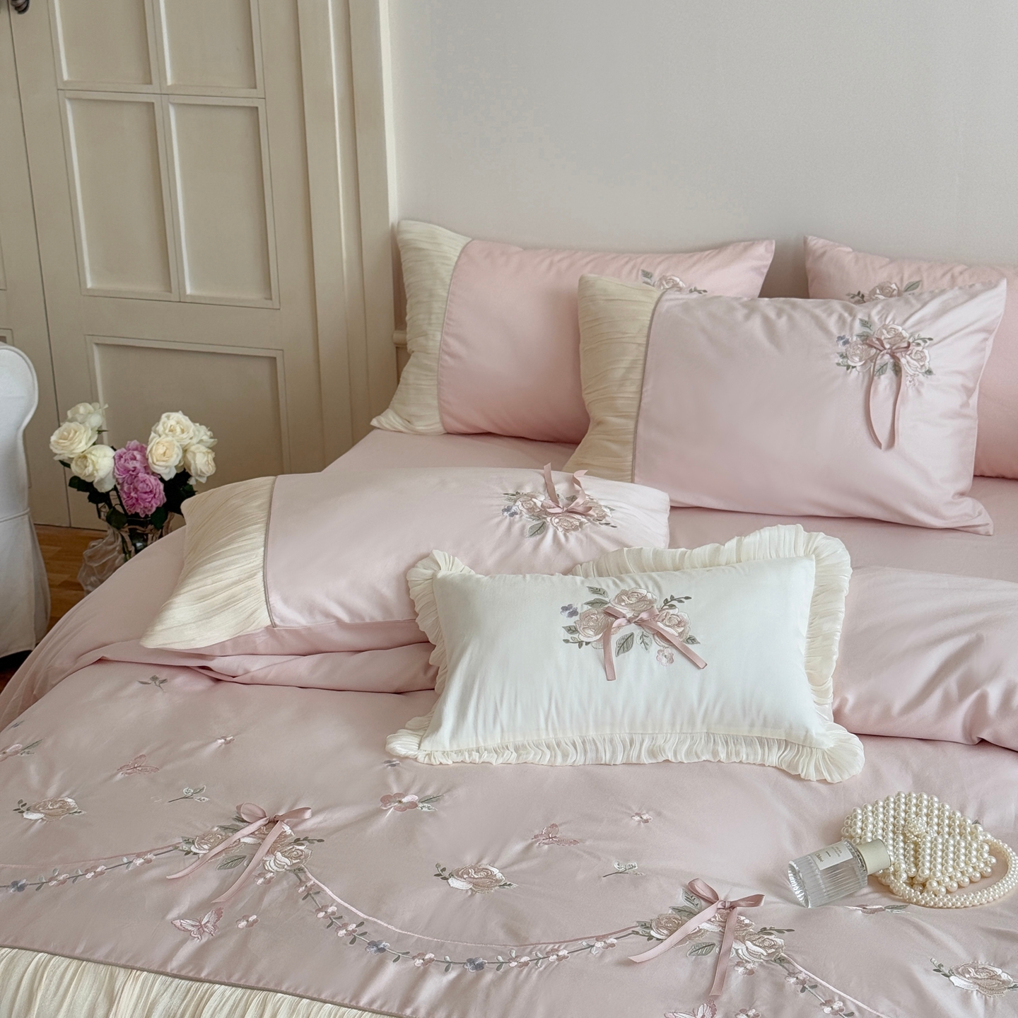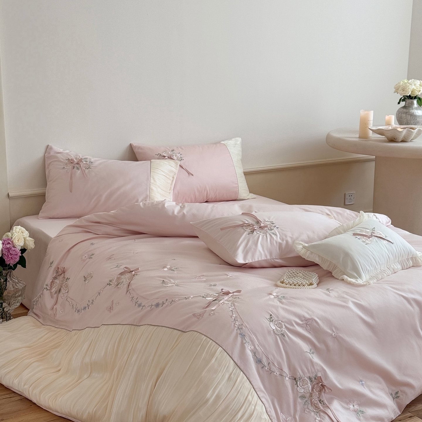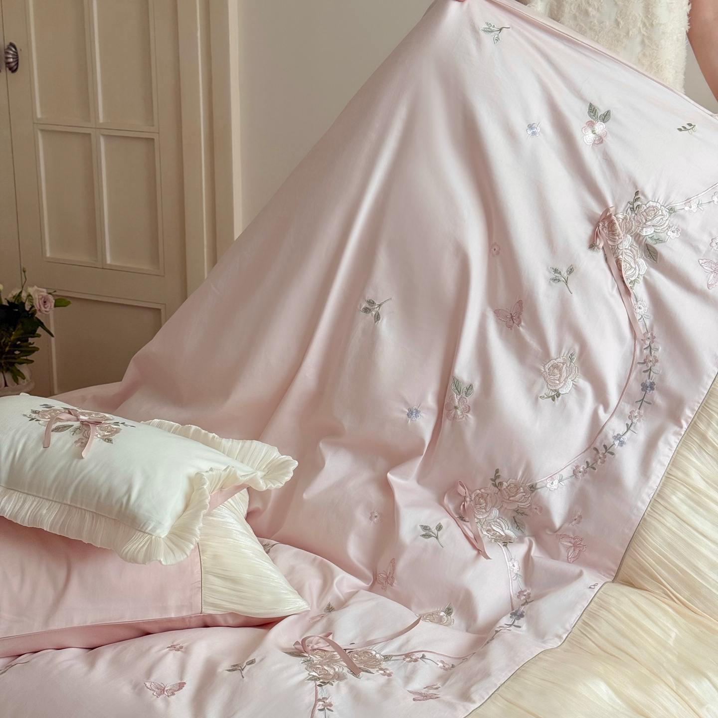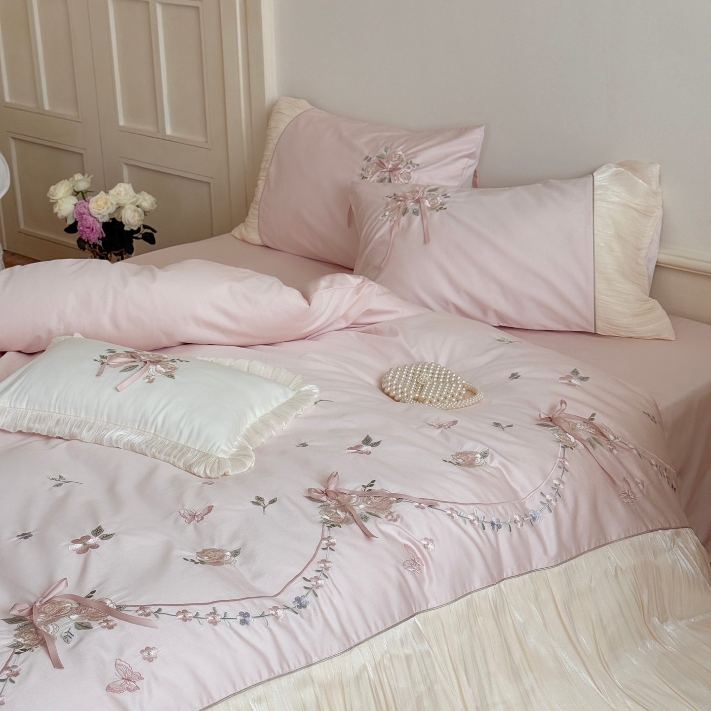 (总)嗨购 2022新款40支水洗棉刺绣花边四件套-阳光玫瑰,阳光玫瑰-粉,阳光玫瑰-黄,阳光玫瑰-蓝