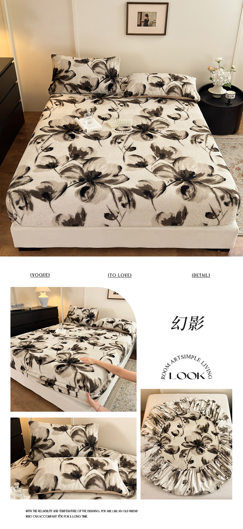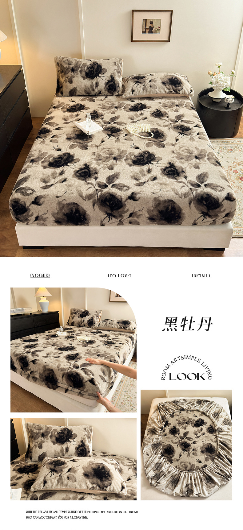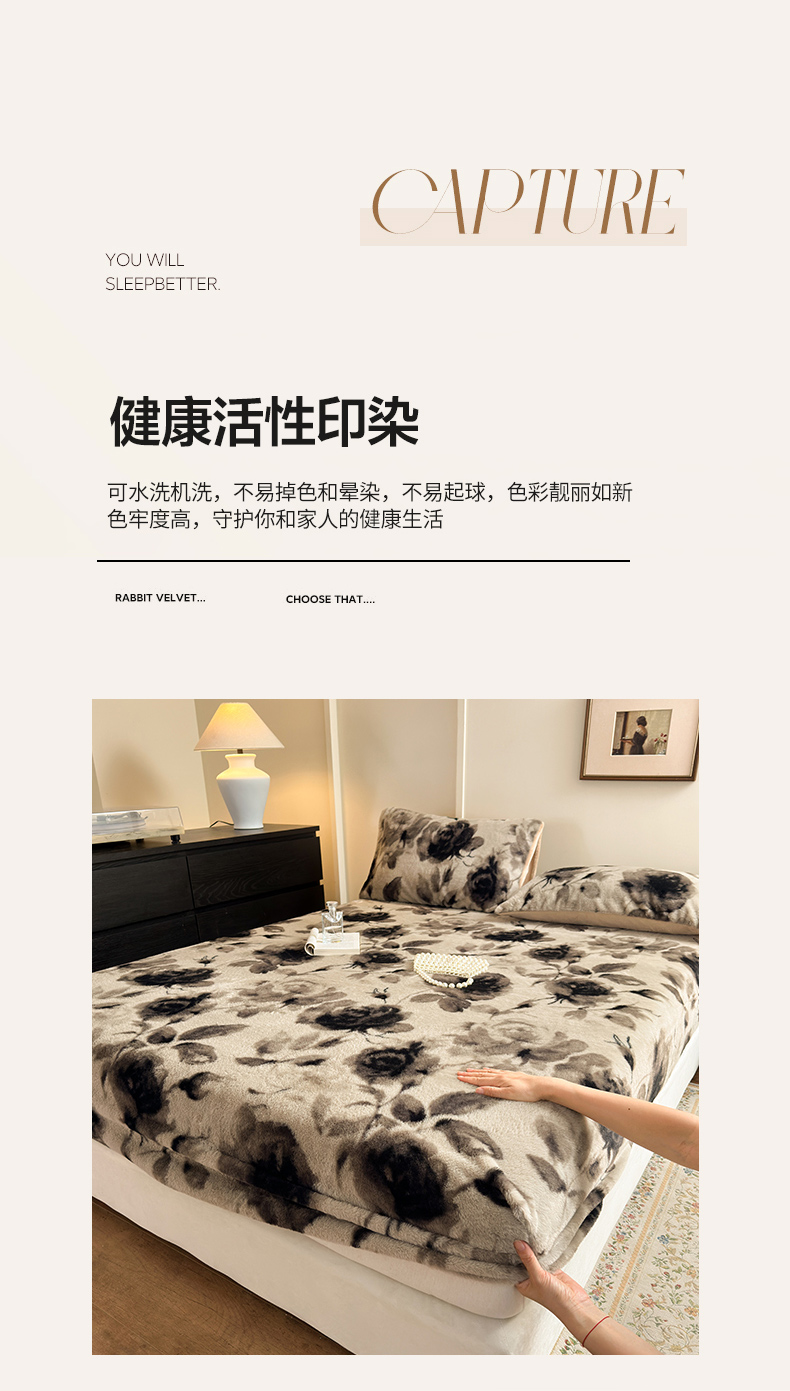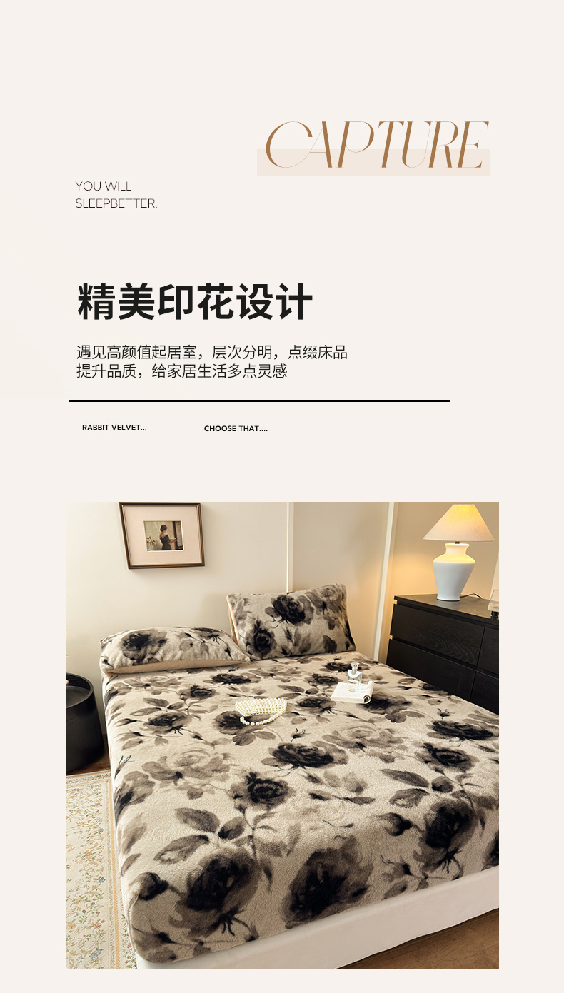 (总)娜娜 2025新款兔毛绒保暖床笠,黑牡丹,幻影,水墨画,妩媚,夜豹,组合图仅供展示